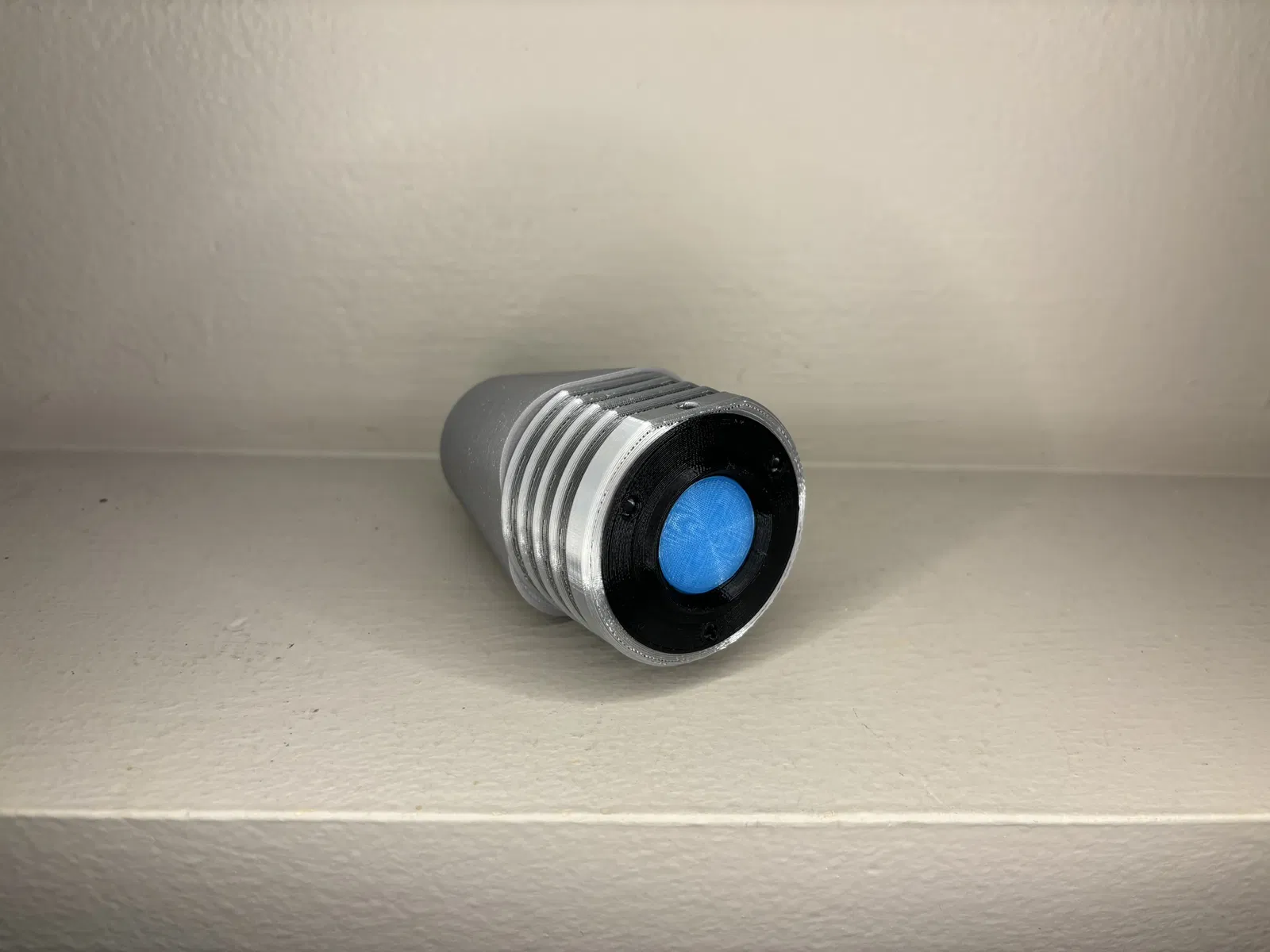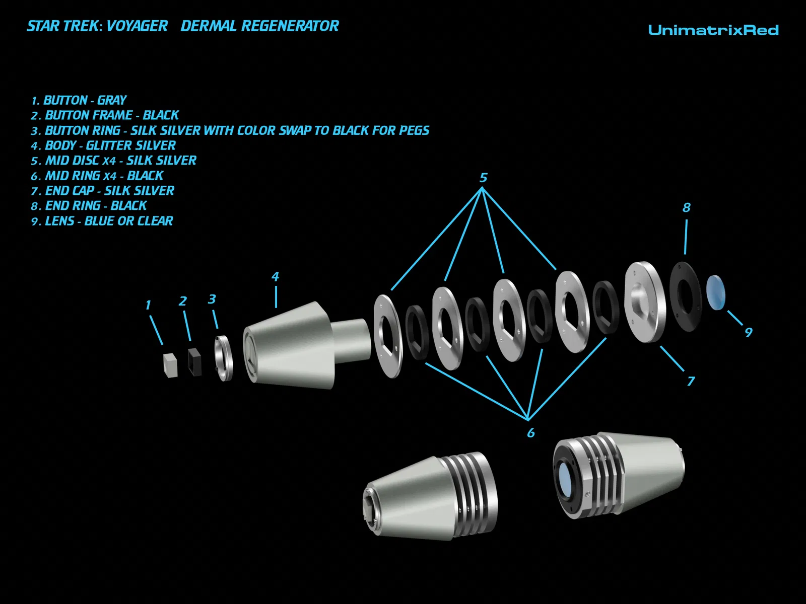 Đây là phiên bản máy tái tạo da y tế của tôi từ Star Trek: Voyager. Món đạo cụ này được kích hoạt bằng nút màu xám và đầu kia sẽ chiếu một luồng ánh sáng xanh tập trung để hướng vào bệnh nhân. Phối màu có thân được sơn màu bạc lấp lánh kim loại, và các đĩa cùng nắp cuối có màu kim loại bóng như nhôm. Tất nhiên, bạn có thể sử dụng bất kỳ màu nào bạn thích, vì tất cả đều là sở thích của người dùng.
