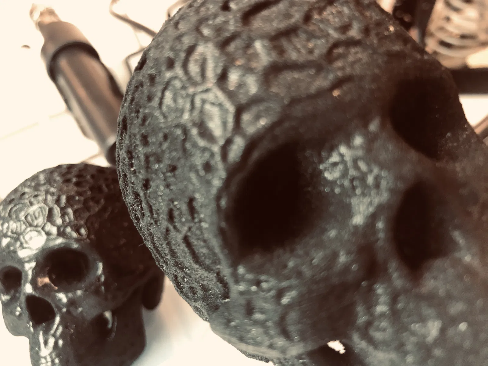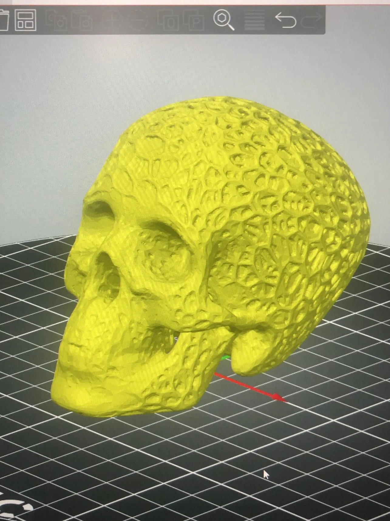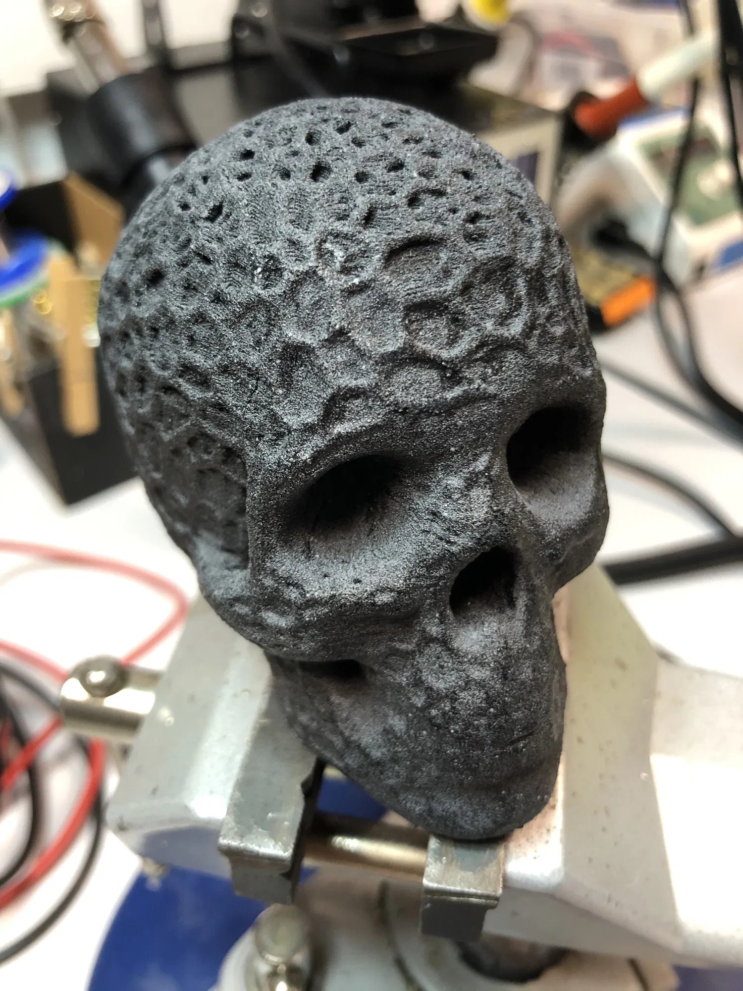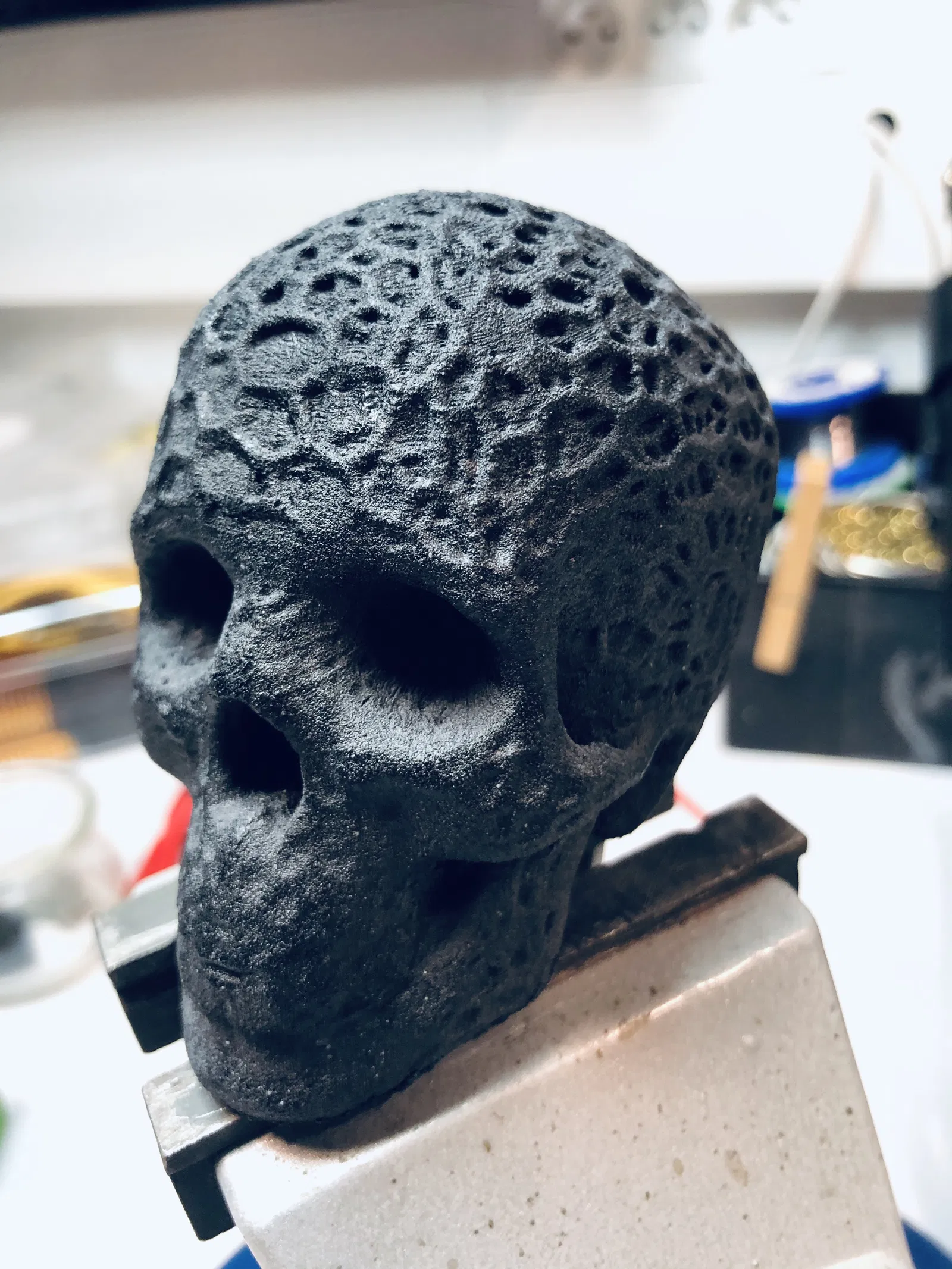 Mô hình đầu hộp sọ người hữu cơ với hoa văn kiểu Voronoi. Chất liệu PLA được in trên máy in delta Kossel và sơn màu.