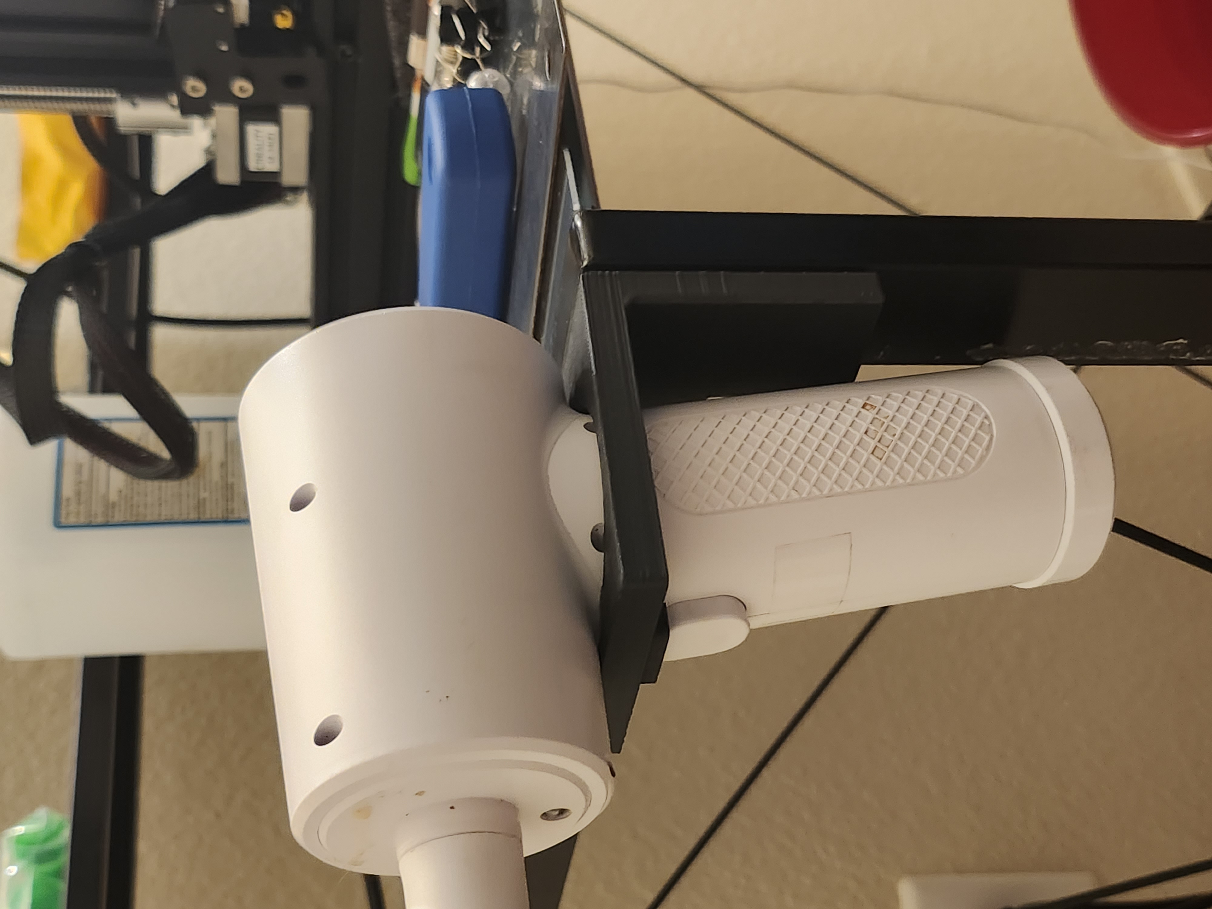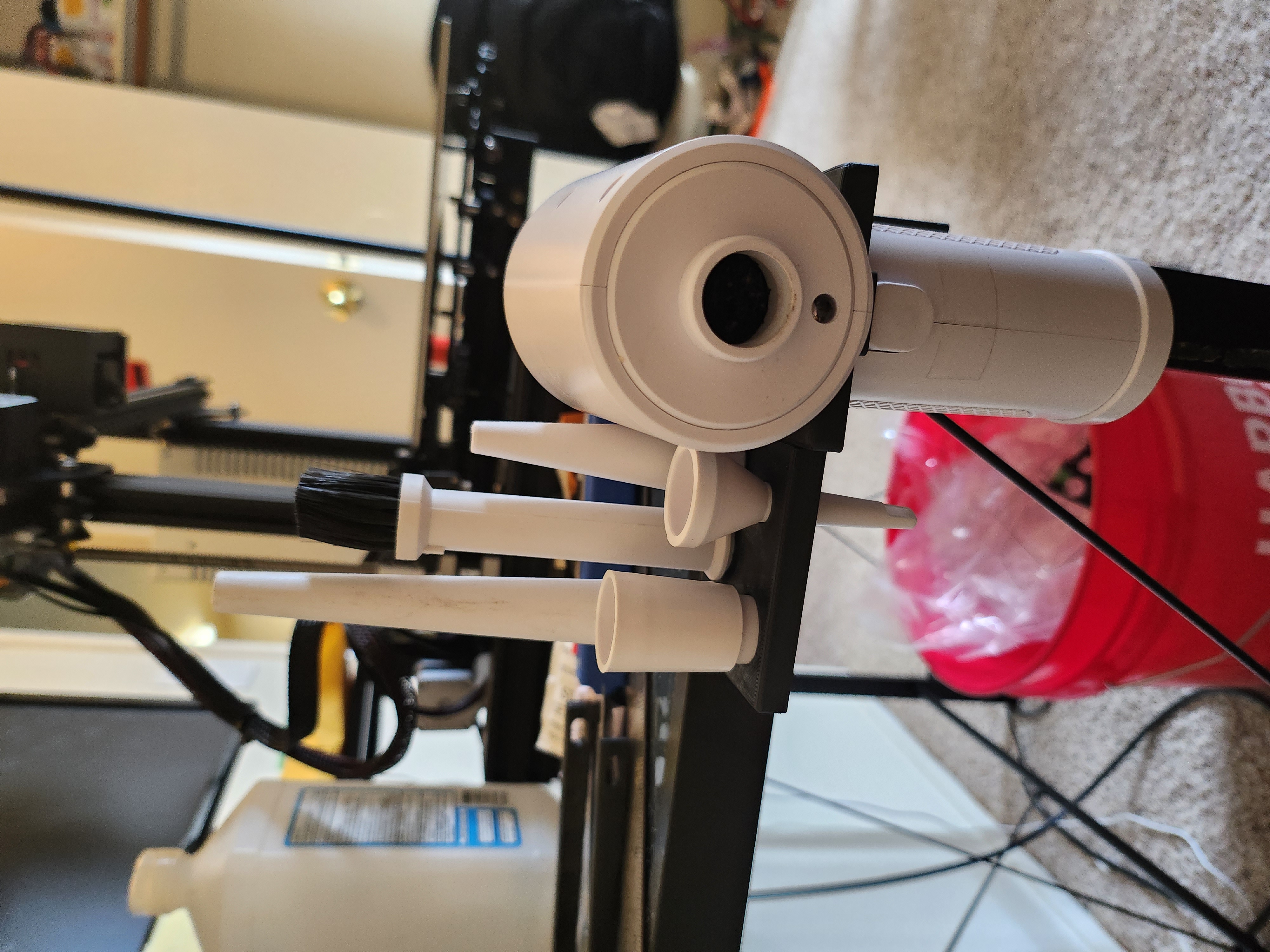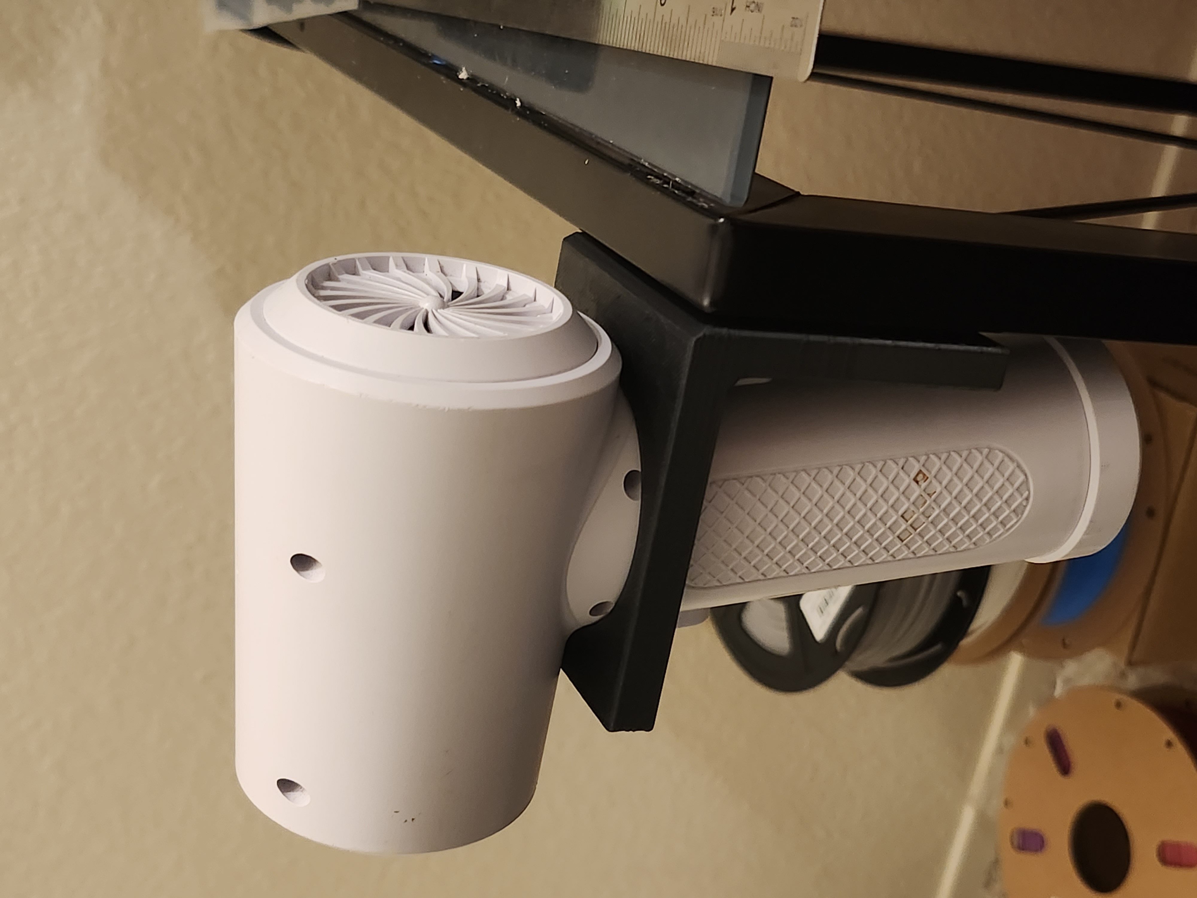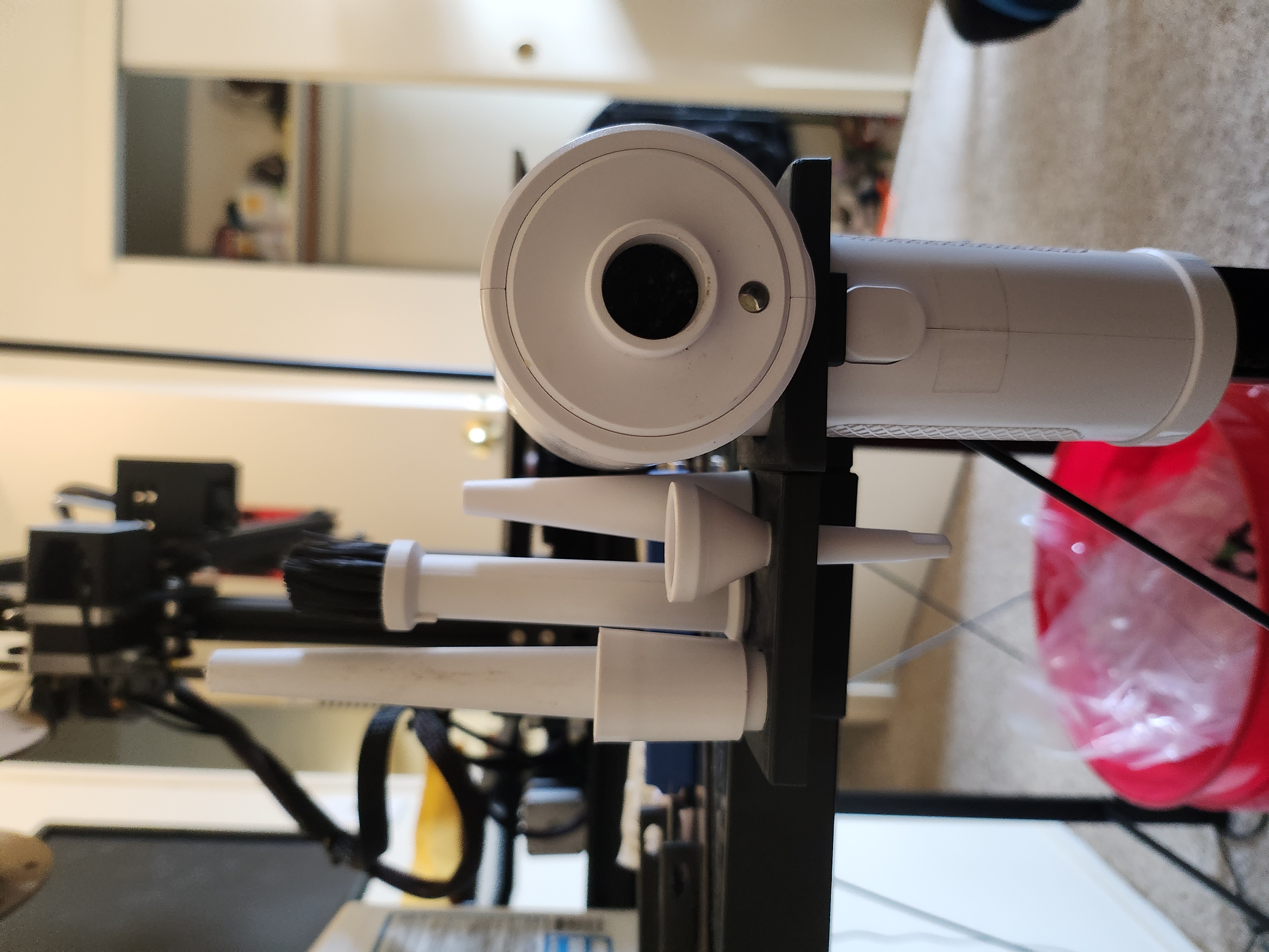 Đây là một cái đế gắn phẳng cho máy xịt hơi cầm tay thông thường của bạn. Nó bao gồm cả chỗ giữ cho từng bộ phận phụ kiện. Nó có cơ chế khóa cho máy xịt hơi để đảm bảo nó chỉ được định hướng theo một chiều duy nhất. Tôi đã thêm một phần lồi phía sau để dán băng dính hai mặt gắn tường lên hoàn hảo, cho phép đế giữ nằm phẳng trên bàn làm việc. Cái này dành cho thanh đỡ bàn 30mm