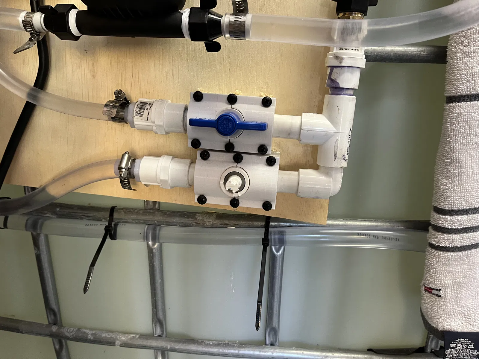 Kẹp/giá treo giữ van PVC 1/2" lên tường/ván hoặc bất kỳ bề mặt nào. Được làm từ PETG, siết khá chắc chắn, có thể hơi quá chặt. Dùng vít 10-24 gắn vào gỗ. Liên hệ nếu cần file Fusion 360.