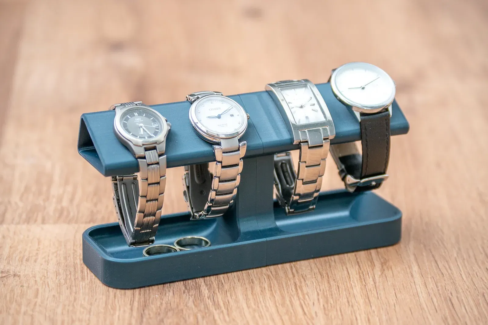 Một giá cho bốn chiếc đồng hồ của phụ nữ nhỏ với một cái bát cho đồ trang sức nhỏ trong căn cứ.