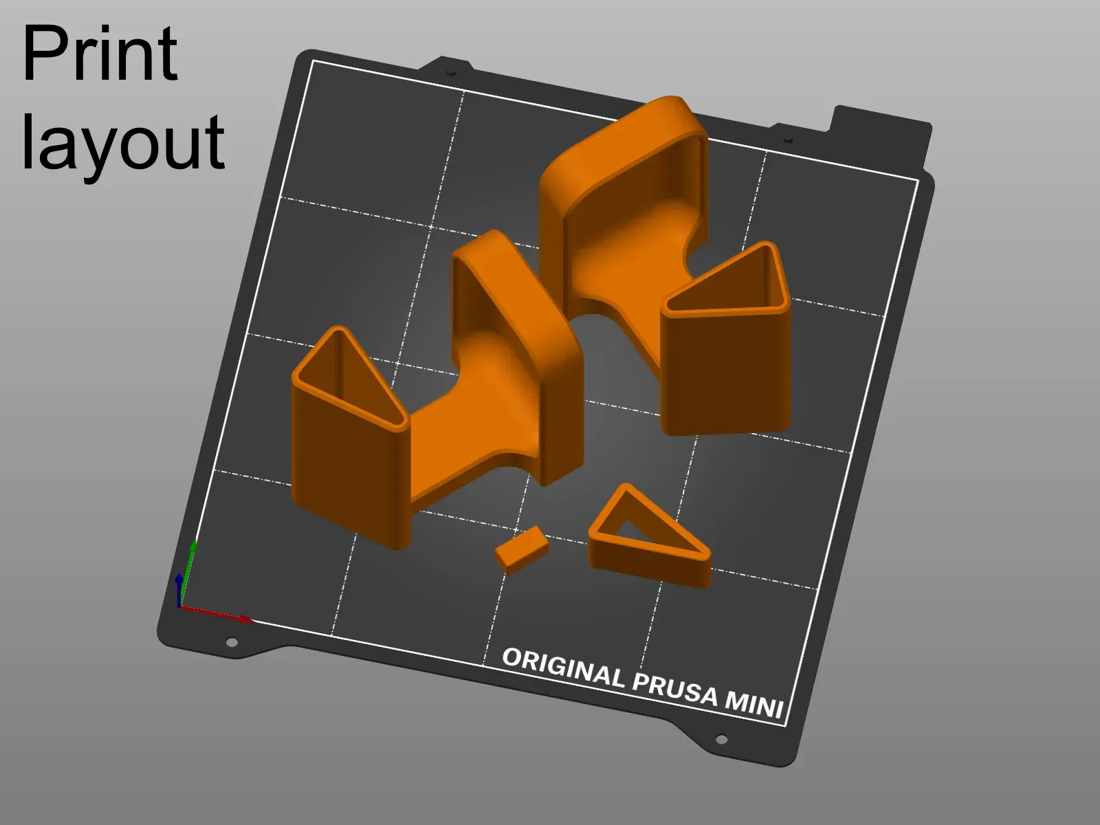Bố cục in được hiển thị trong một trong các bức tranh – các mảnh được đặt góc để đặt đường nối lớp ở một vị trí không dễ thấy bằng cách sử dụng cài đặt đường nối "ở phía sau". Góc của lớp bên trong cần được điều chỉnh lại cho phù hợp (điều này tôi đã làm cho 3MF và GCODE được cung cấp). In mà không cần hỗ trợ. Tôi đã thử sử dụng chiều cao lớp biến đổi để tạo ra các bán kính mịn trong bản in của mình, tuy nhiên nó tạo ra các sọc rõ ràng về độ hoàn thiện bề mặt không đồng nhất – do đó 3MF và GCODE được cung cấp có chiều cao lớp cố định 0.15 mm, nếu bạn thích chiều cao lớp biến đổi, hãy cắt lại theo sở thích của bạn.