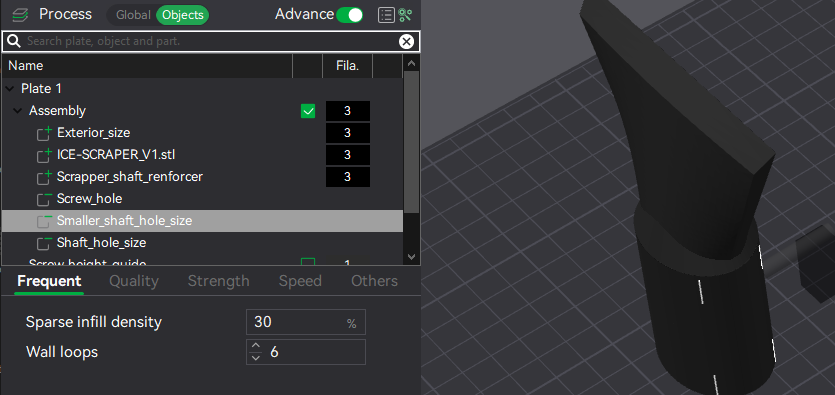 Cái này làm cho trục hình bầu dục 22.5mmx33.5mm, in 1 lần xong, không cần chỉnh sửa gì. Tôi dùng PLA, mật độ ruột 30%, 15 lớp trên cùng, 6 lớp thành. Nếu dùng ASA thì không có khe hở viền nhé. Tuyệt đối đừng dùng sợi carbon vì nó có thể làm xước kính.