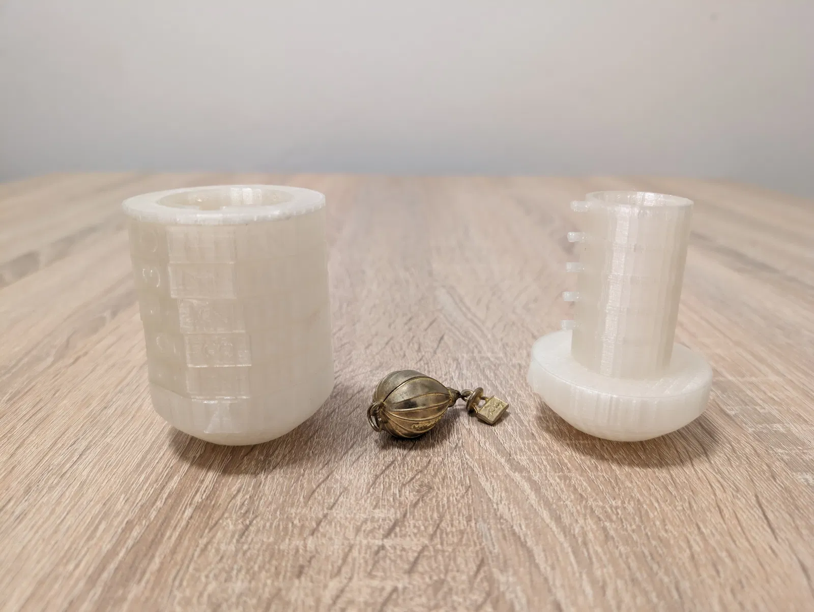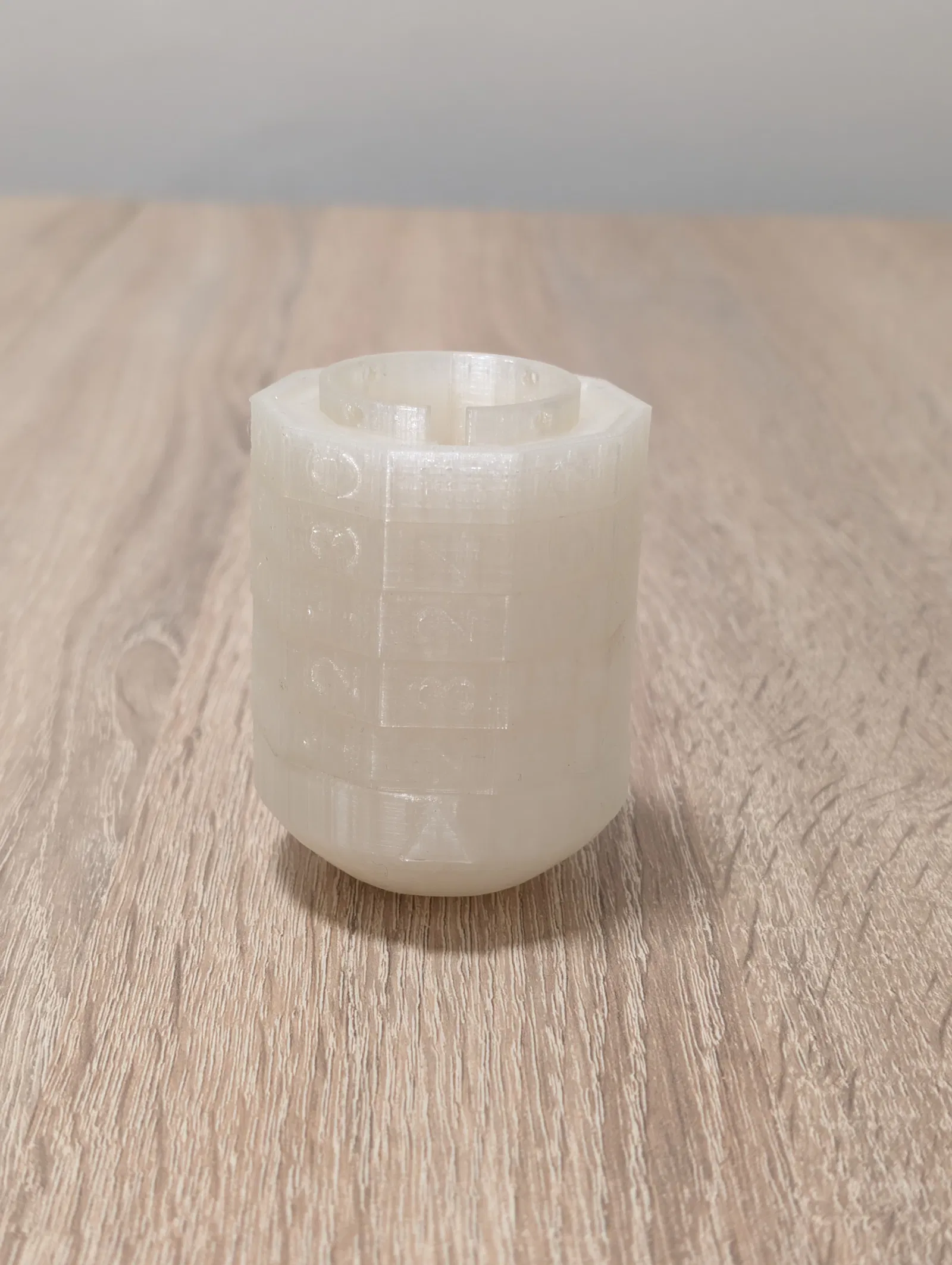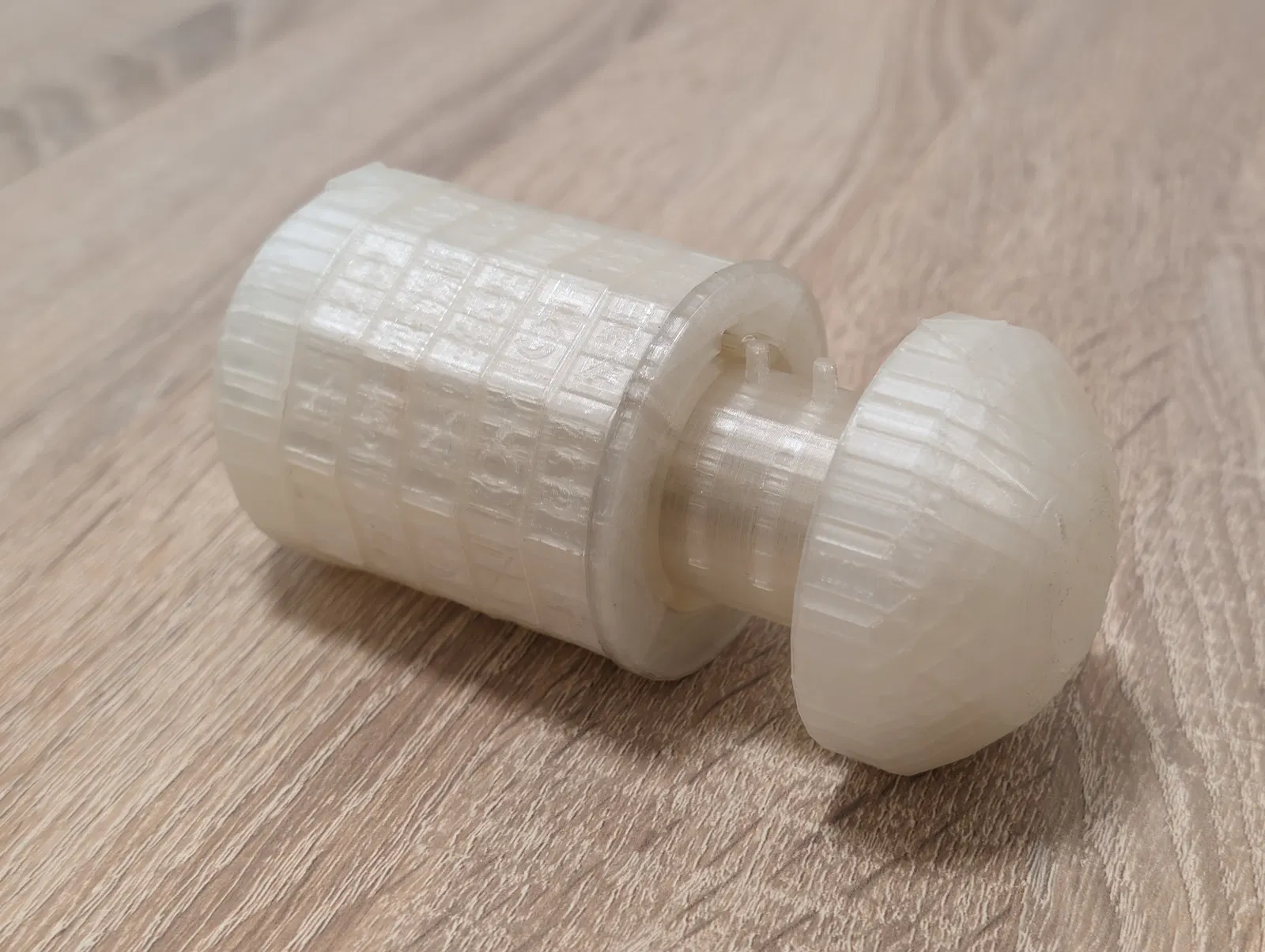 Khóa Cryptex với mã 5 số, cho phép bạn thay đổi mật mã dễ dàng. Cơ chế khóa bánh xe độc đáo, lấy cảm hứng từ Cryptex gỗ, được tạo ra bằng OpenSCAD.