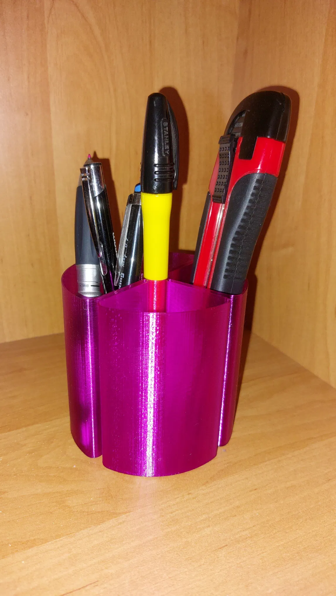 Phần hộp đựng chính in bằng chế độ "Vase mode", có thể dùng làm đồ trang trí bàn làm việc (ống đựng bút) hoặc sắp xếp đồ dùng phòng tắm. Có hai phiên bản V1 và V2 tùy nhu cầu sử dụng.