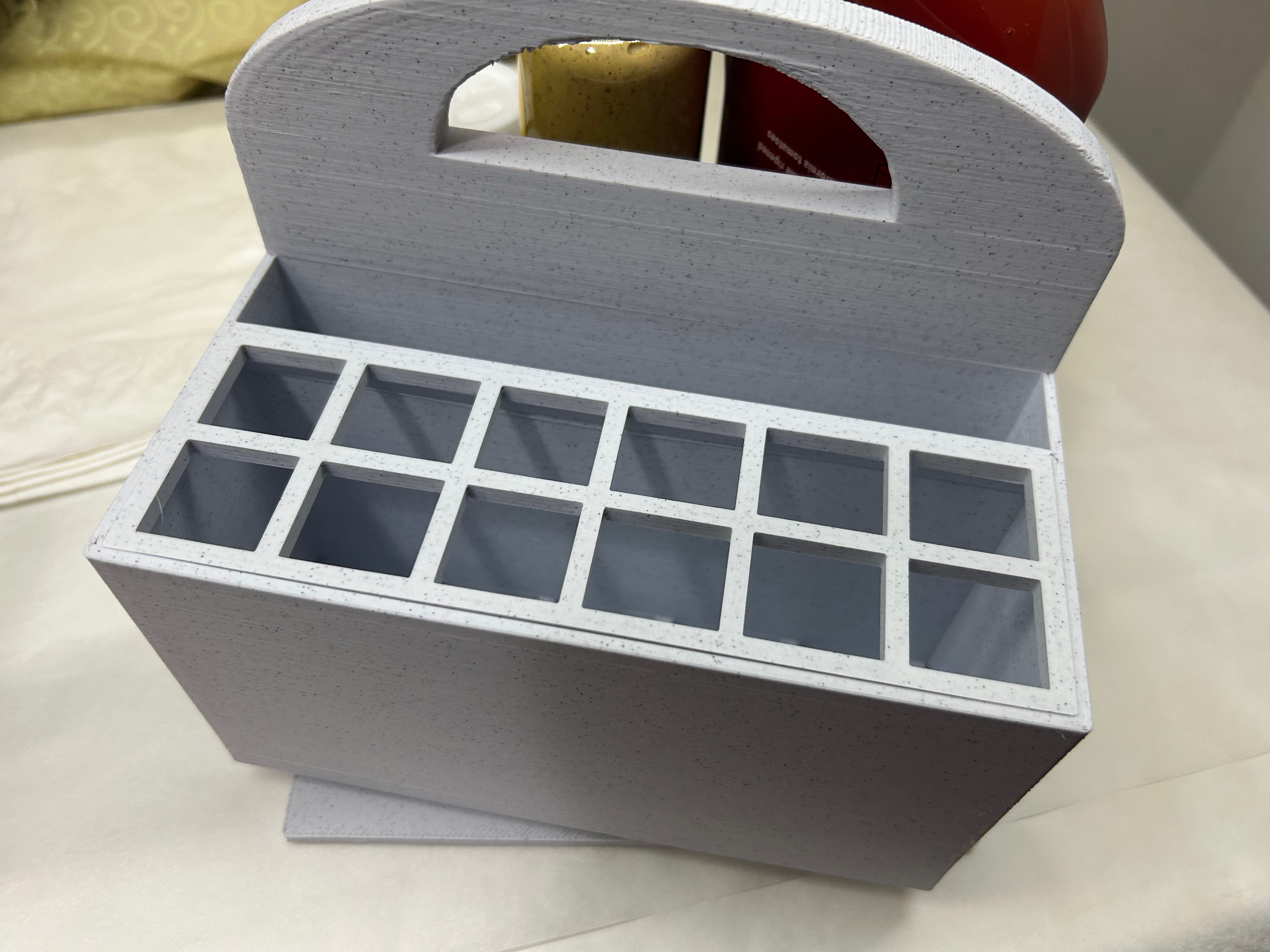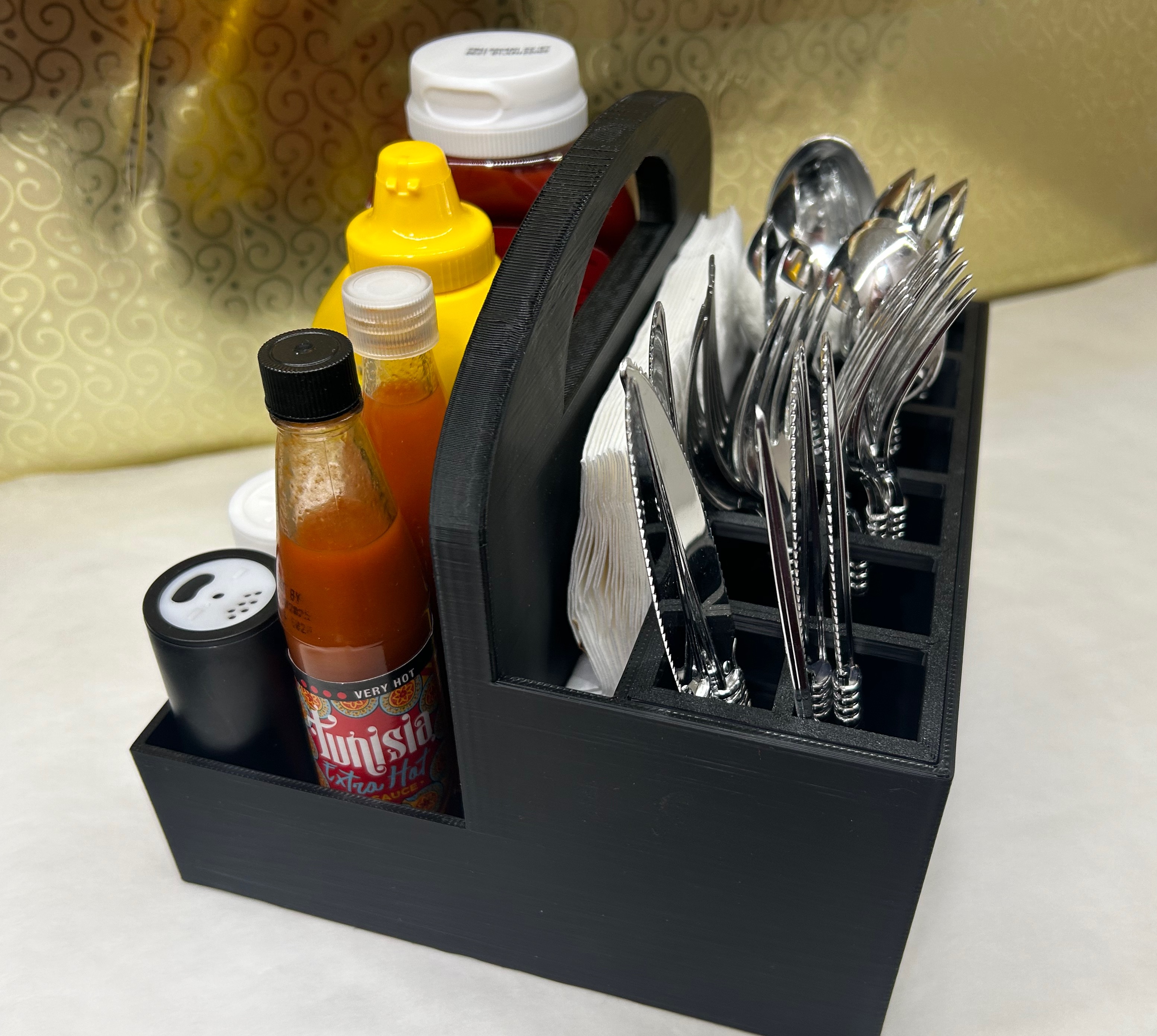 Khay đựng dao dĩa, gia vị, khăn giấy có hai kích cỡ, có đế xoay tùy chọn dùng bạc đạn 608. Tuyệt vời cho tiệc nướng ngoài trời hoặc bàn ăn gia đình. Có thể đựng đồ nghề in 3D.