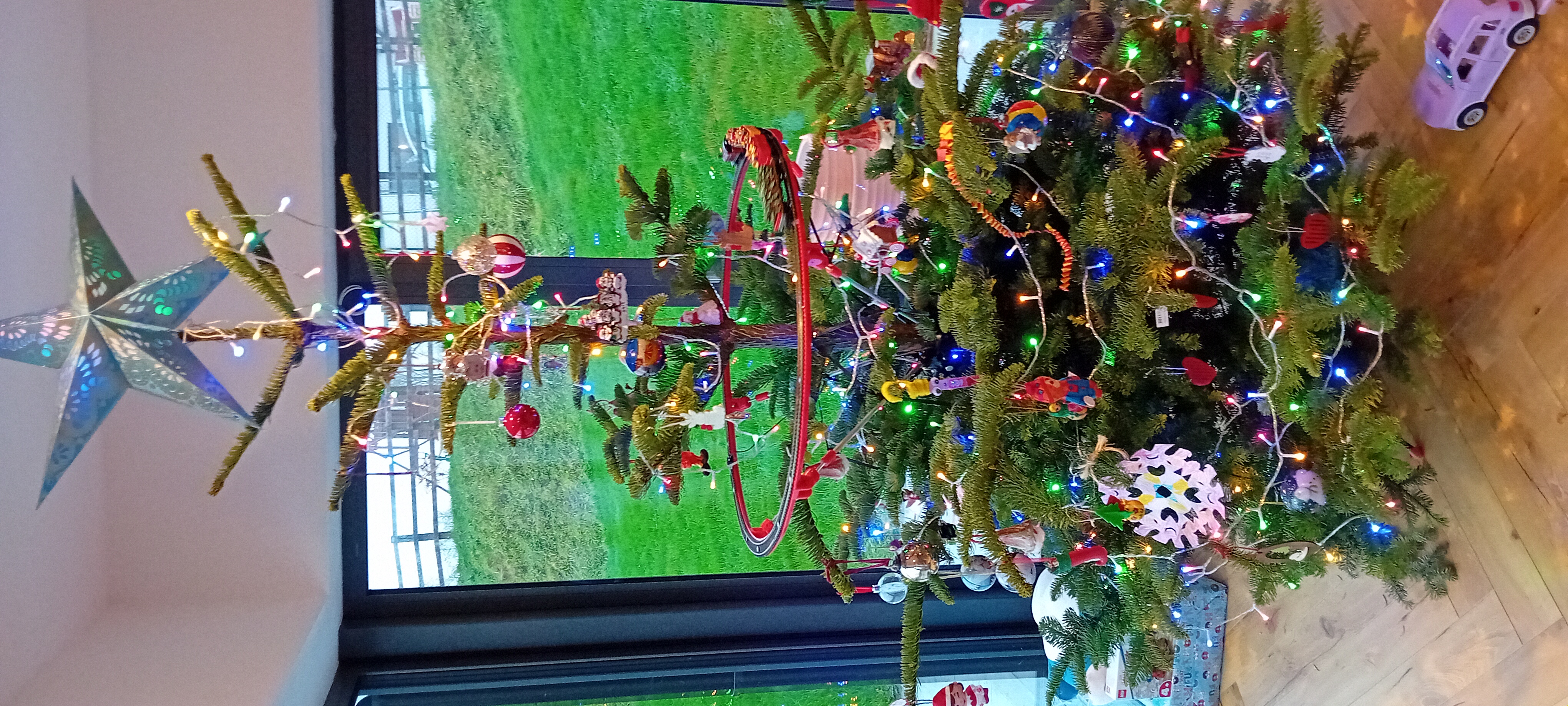 Tui đã dùng bộ Hệ thống Tàu Giáng Sinh Santa's Express của Hornby (R1248) khổ OO, loại tàu thường đặt vòng quanh gốc cây thông Noel, để chế tạo một bệ đỡ cho nó chạy vòng quanh giữa cây, trên cao khỏi tầm tay mấy đứa nhỏ.
