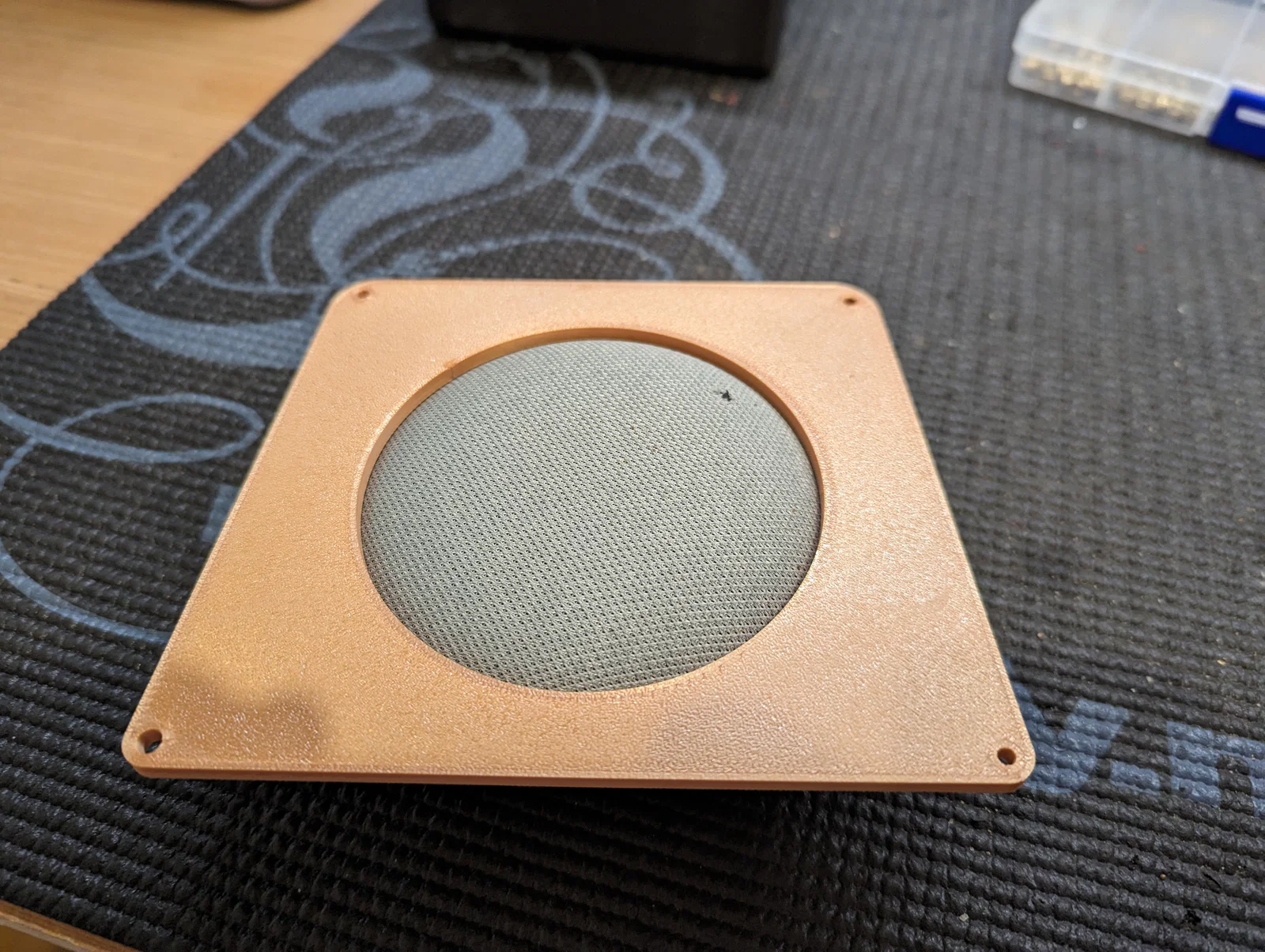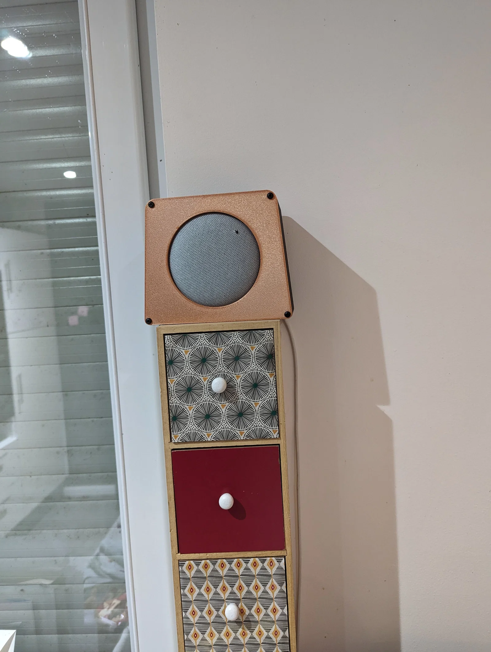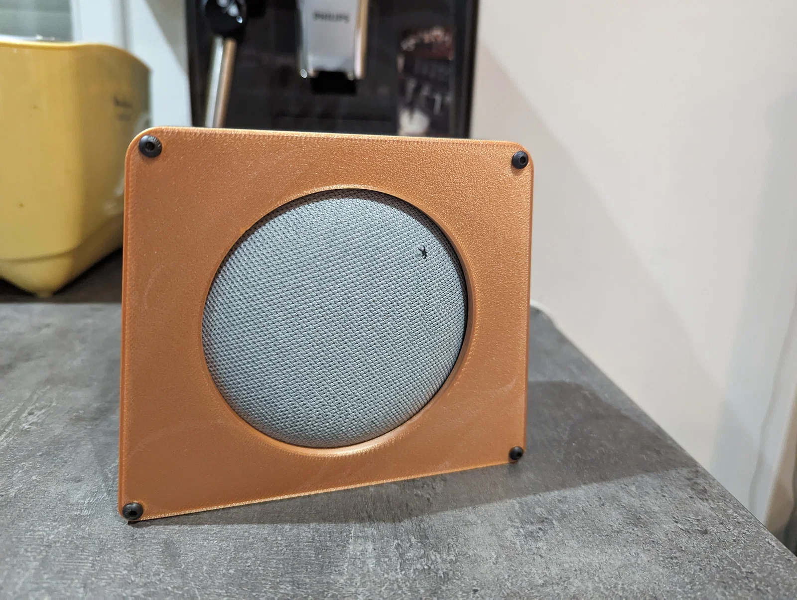 Hộp đựng Google Home Mini in bằng PLA nhiều màu ở mặt trước, thân hộp làm từ PETG-CF. Sản phẩm sử dụng ốc M3 và insert ren, mang đến vẻ ngoài vintage độc đáo.