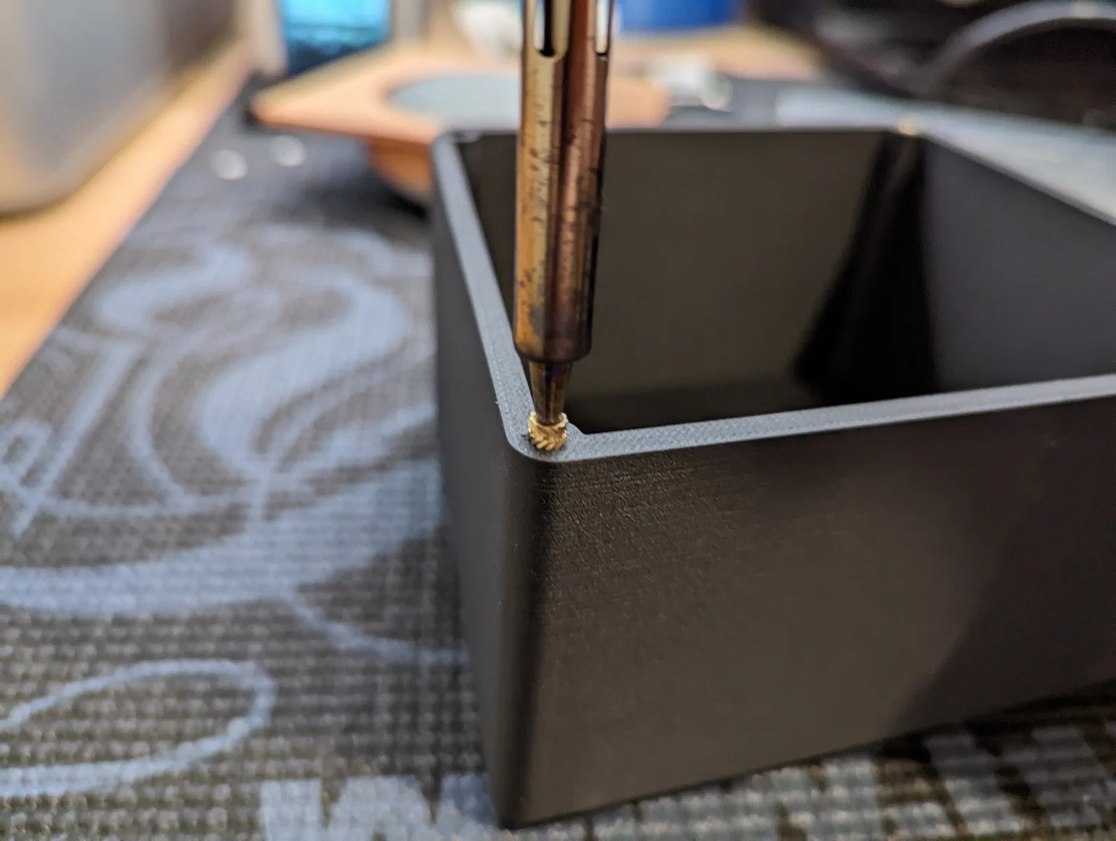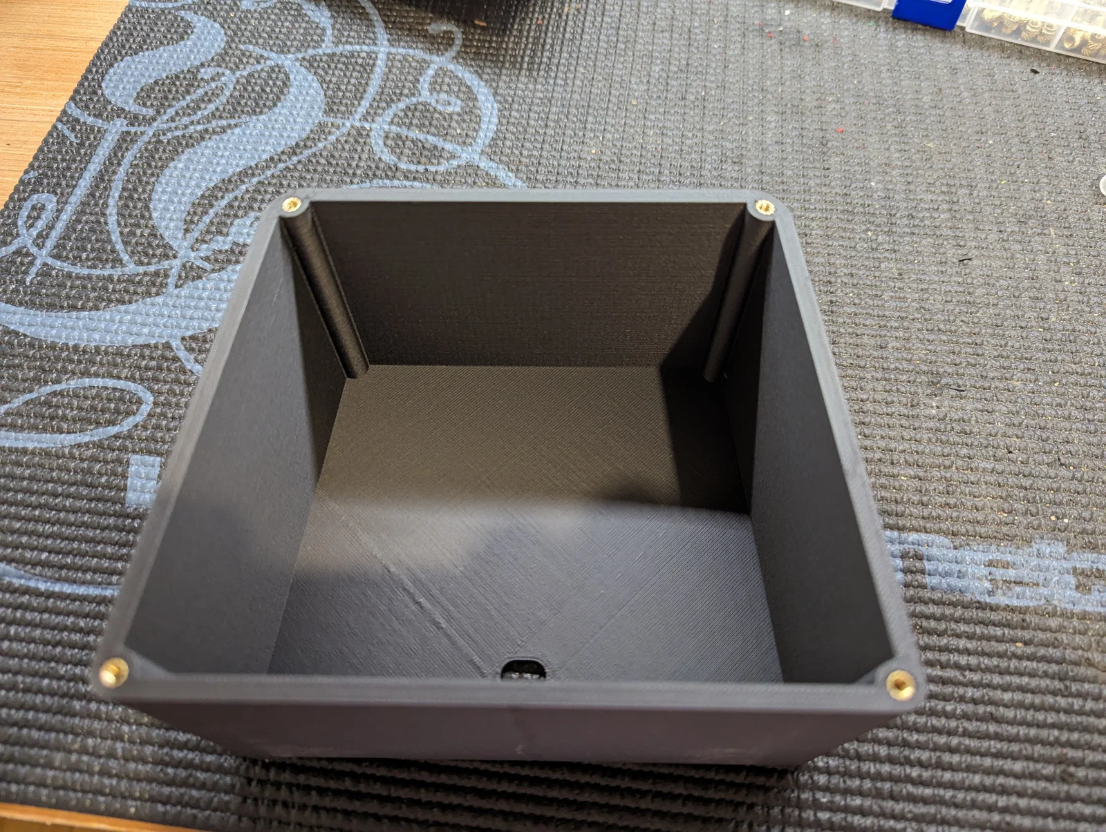 Tui in cái mặt trước bằng PLA nhiều màu. Cái hộp thì làm bằng PETG-CF. Sử dụng ốc M3 và insert ren nha.