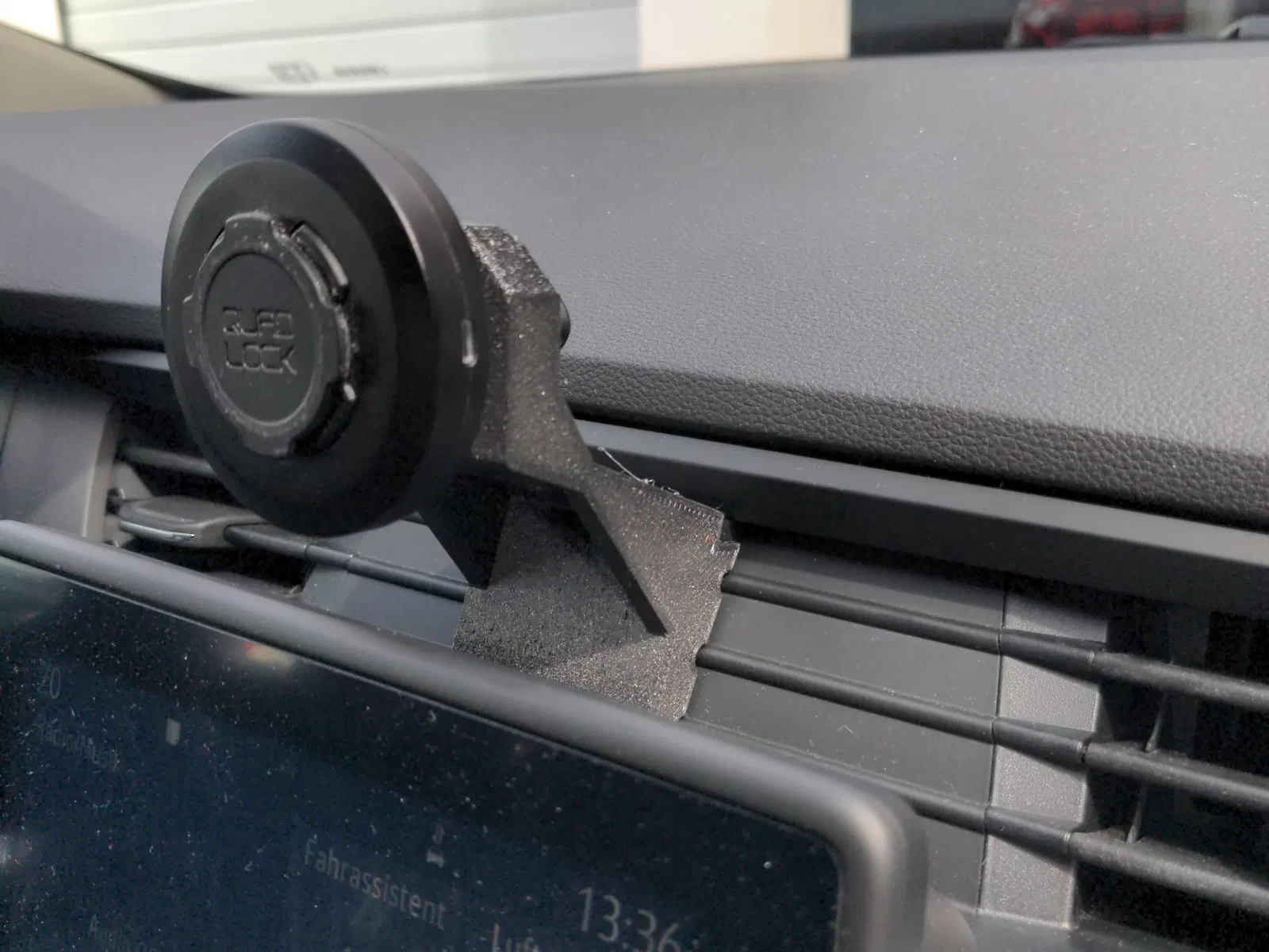 giá đỡ kính chắn gió quadlock cũ của tôi không vừa với chiếc renault zoe mới của chúng tôi, vì vậy tôi đã làm một phần trung gian này mà kết nối với các lỗ thông hơi giả phía sau màn hình trung tâm và đầu gimbal của giá đỡ quadlock.