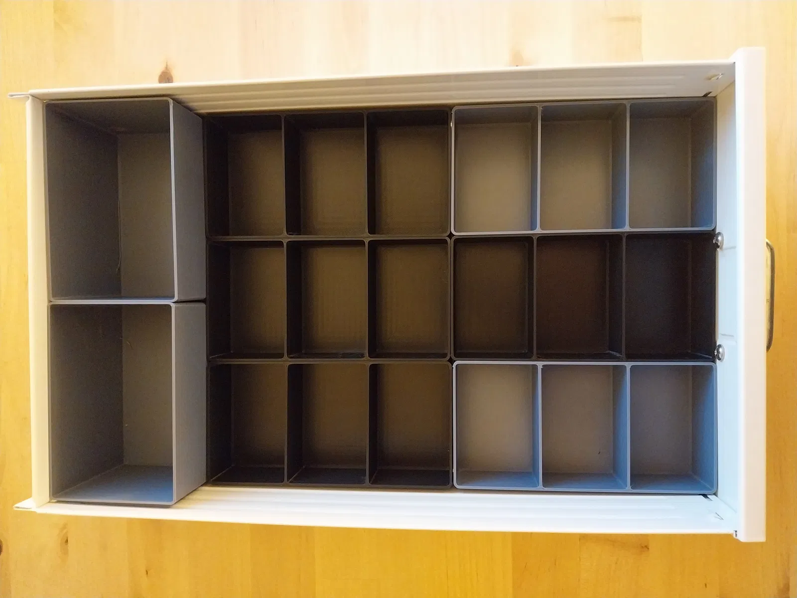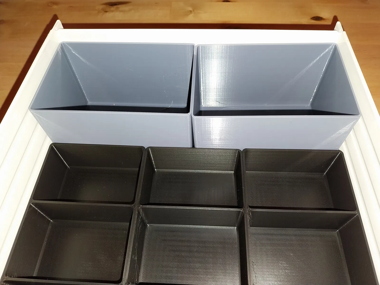 Hai cái hộp đựng này, cộng với 6 cái hộp 77x154 mm, xếp vừa đầy một ngăn kéo Helmer. Rất hợp để sắp xếp đồ đạc trong ngăn kéo, đặc biệt là với nội thất của IKEA.