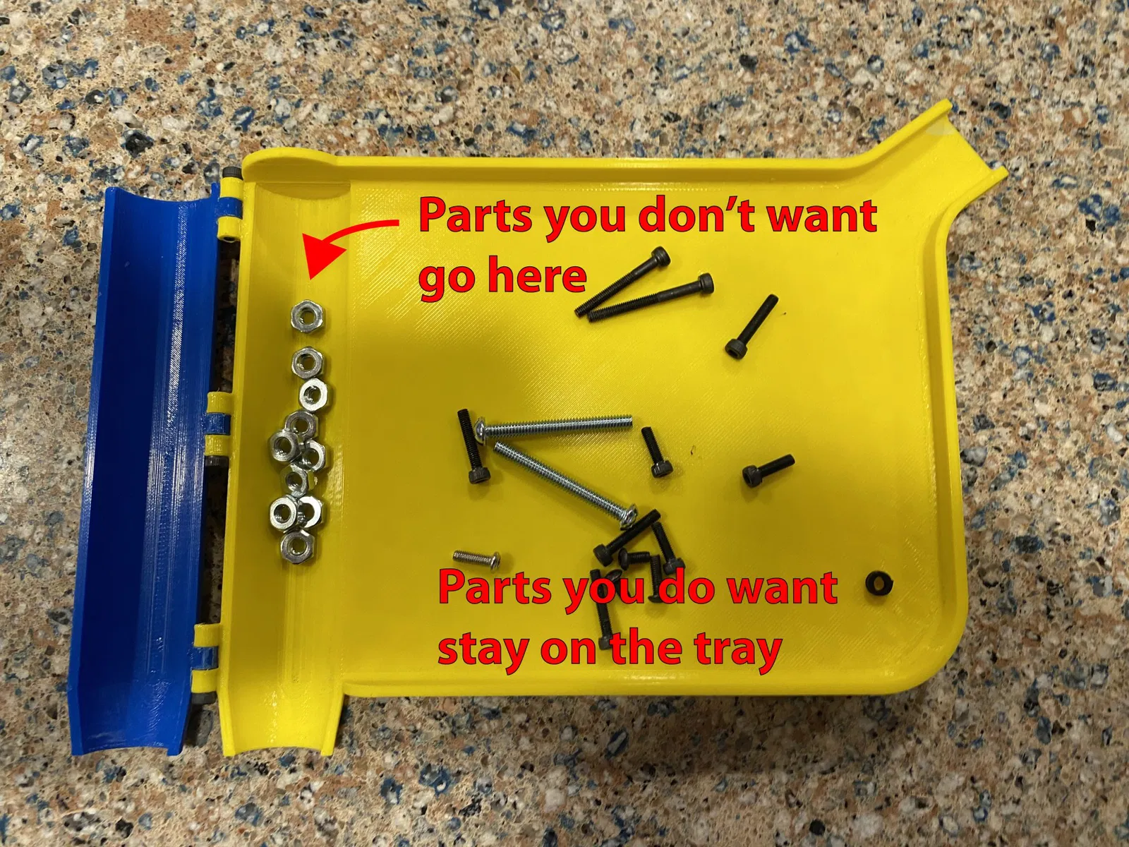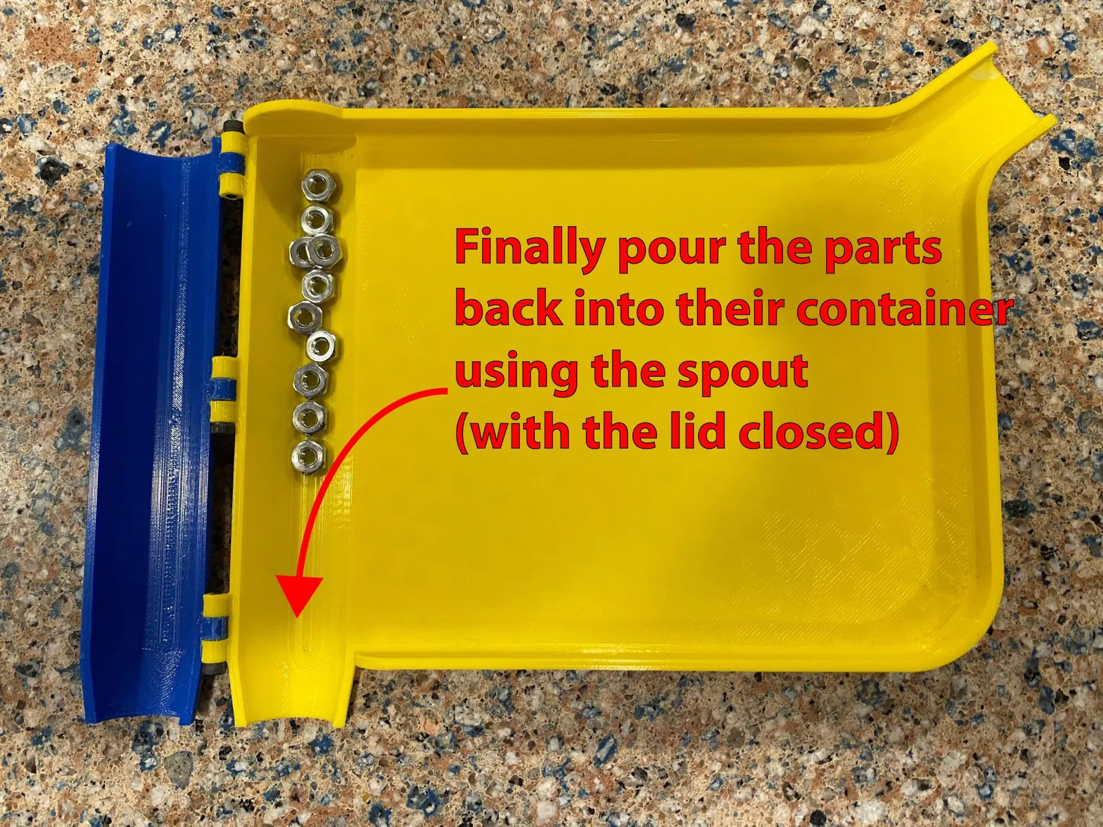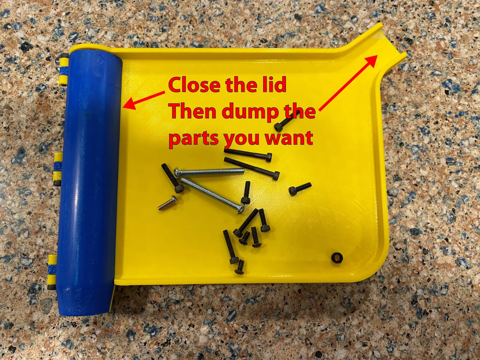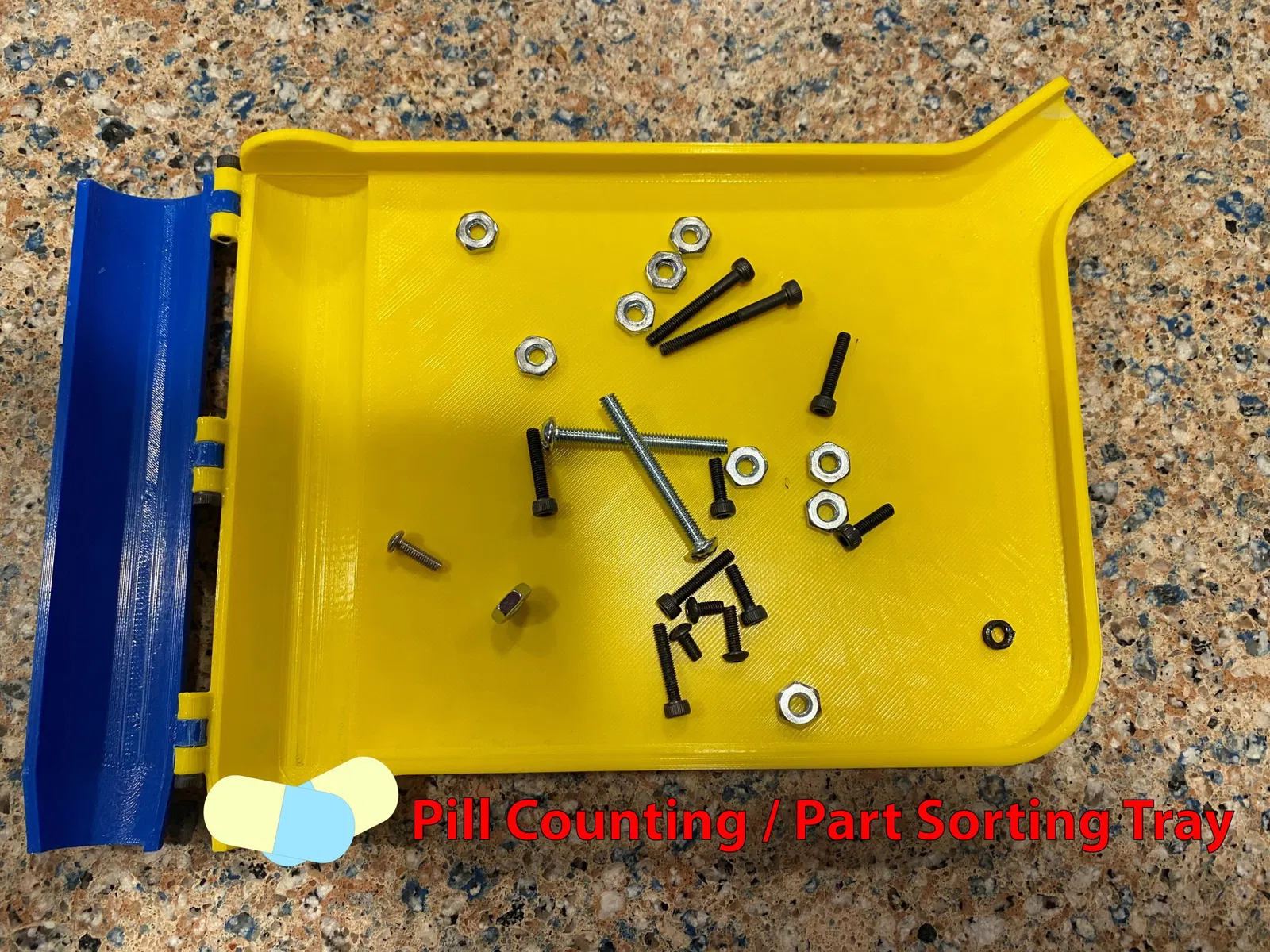 Đây là một khay đếm viên thuốc/phân loại bộ phận giống như những gì một dược sĩ sử dụng. Nắp ở bên cạnh khay cho phép bạn đổ nội dung của khay vào một container và các bộ phận ở bên cạnh khay vào một container khác. Ở đây là một phiên bản tương tự trên Amazon.