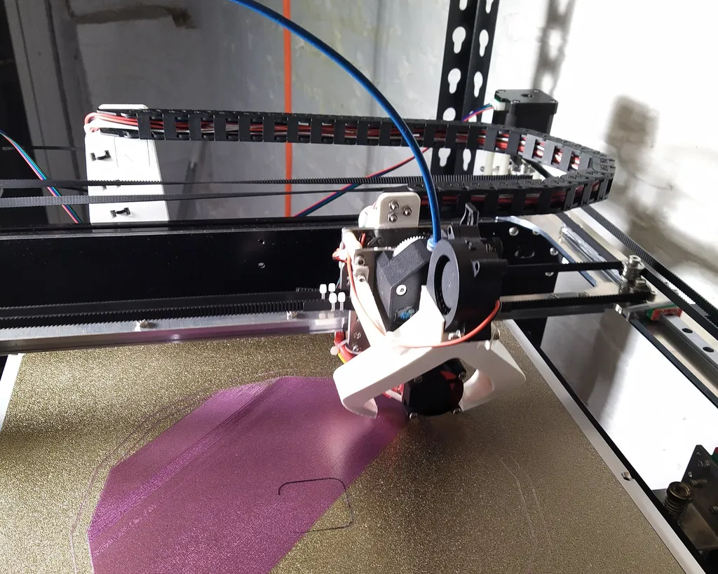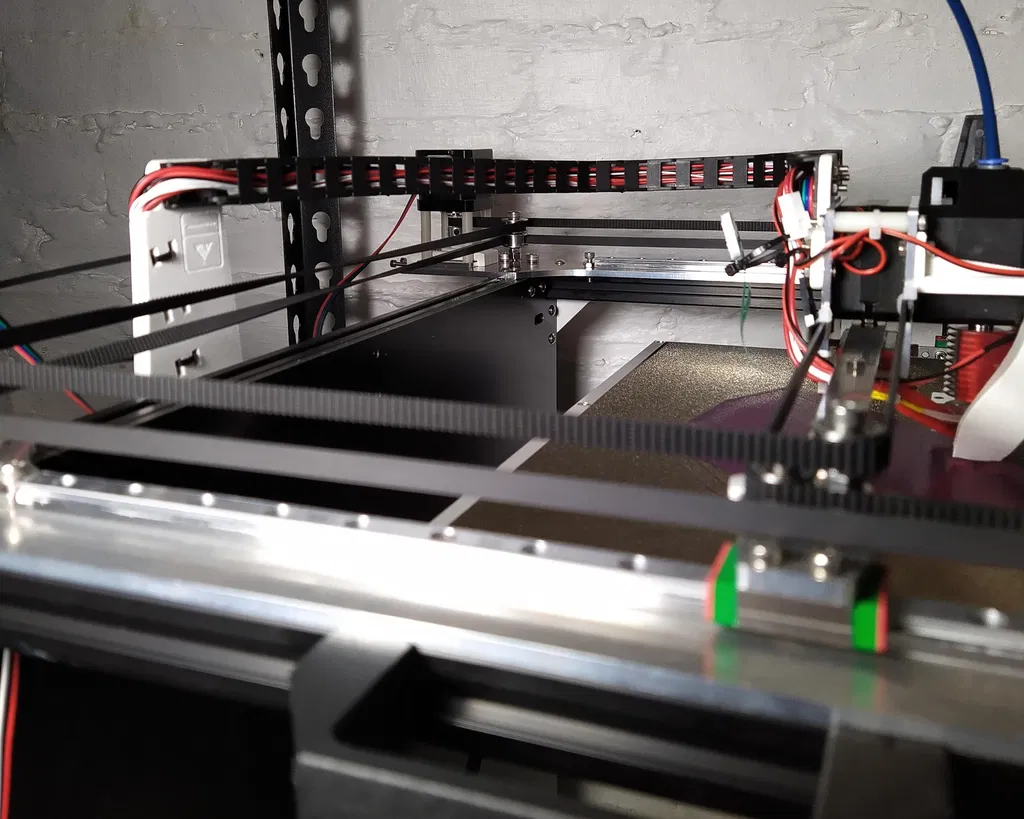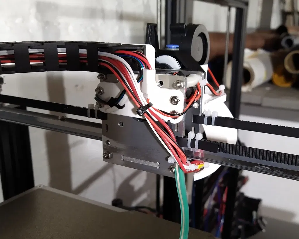Sử dụng ốc M4 và đai ốc đi kèm máy in để gắn phần phía sau. Dây xích cáp và ngàm giữ extruder thì dùng ốc M3.