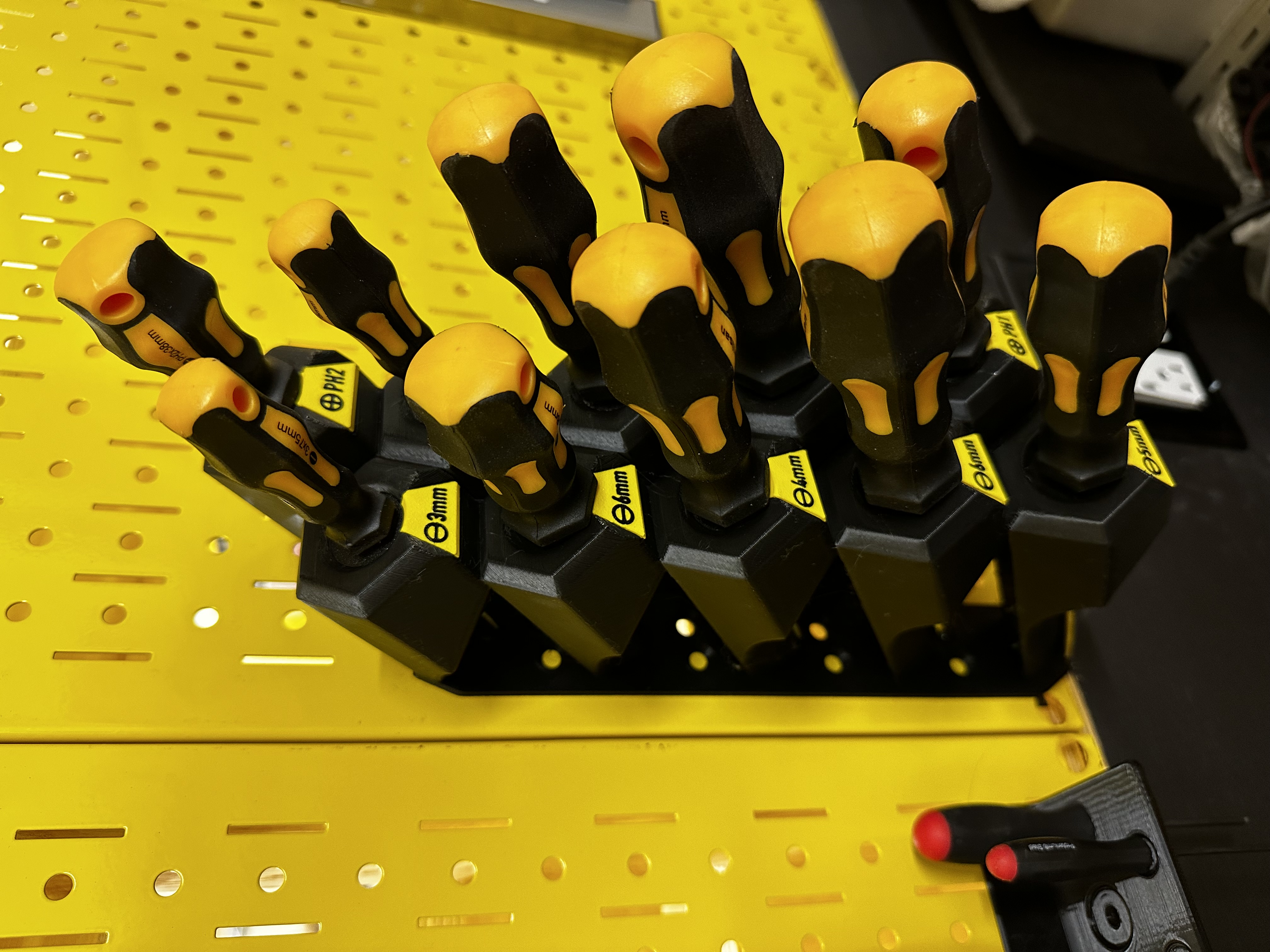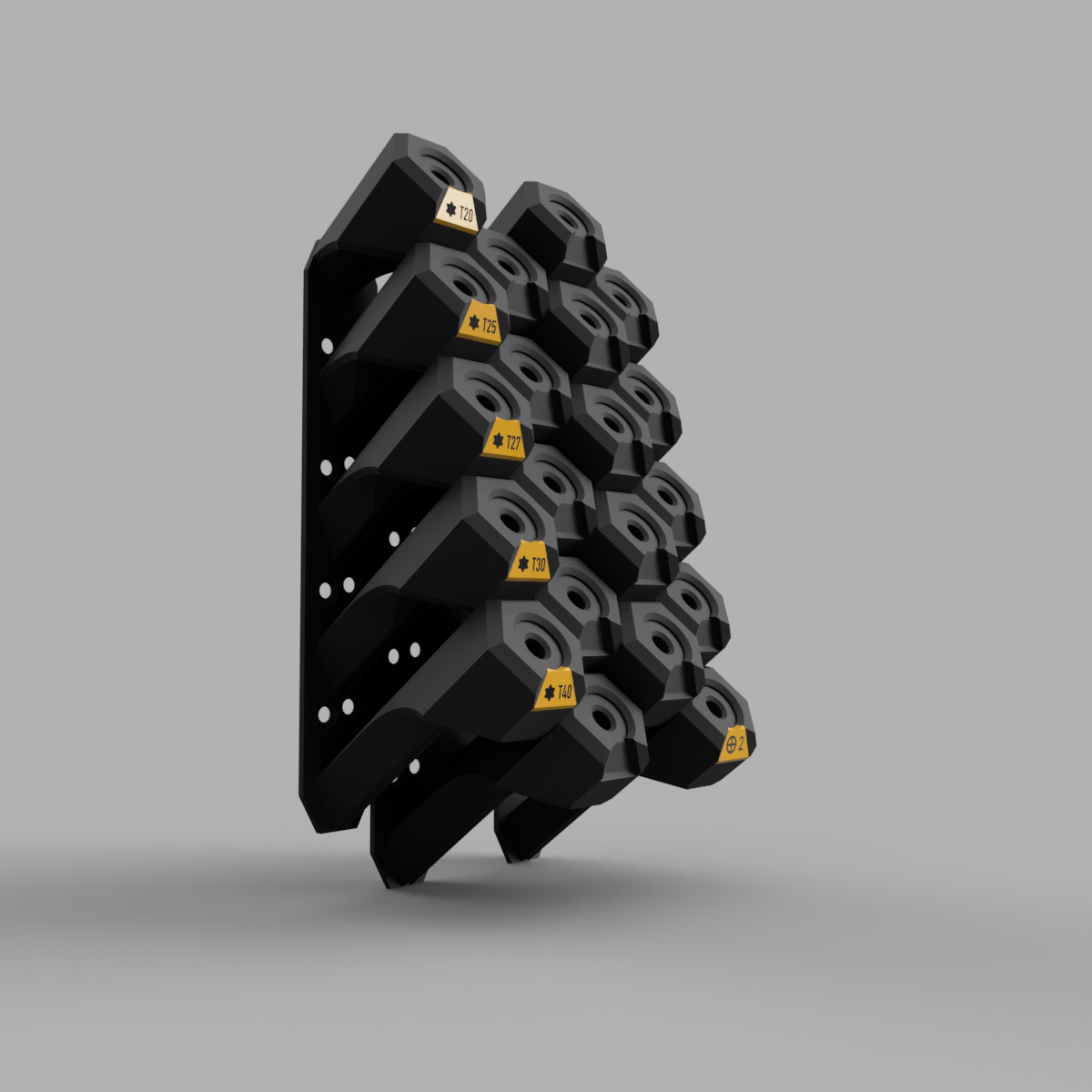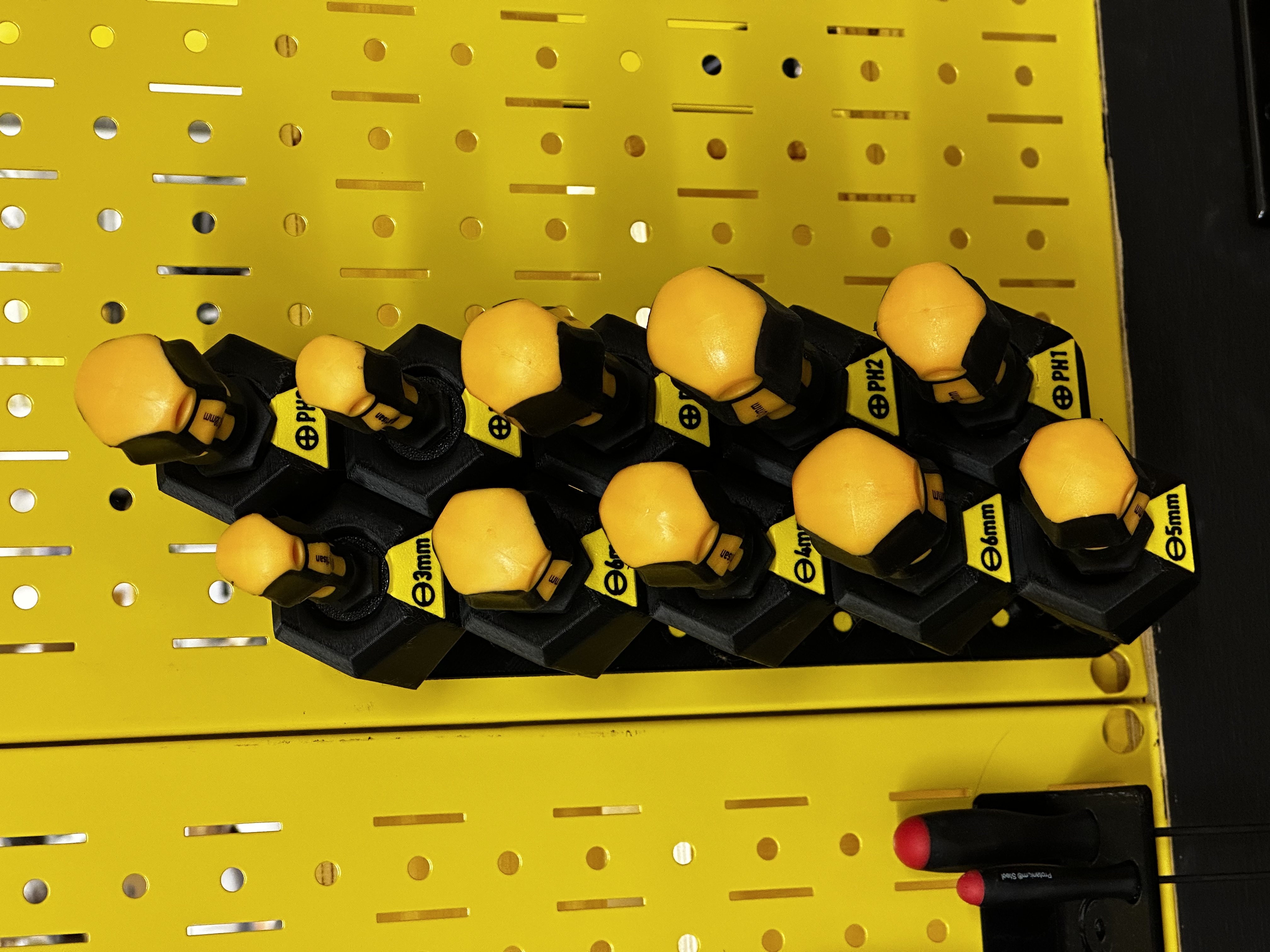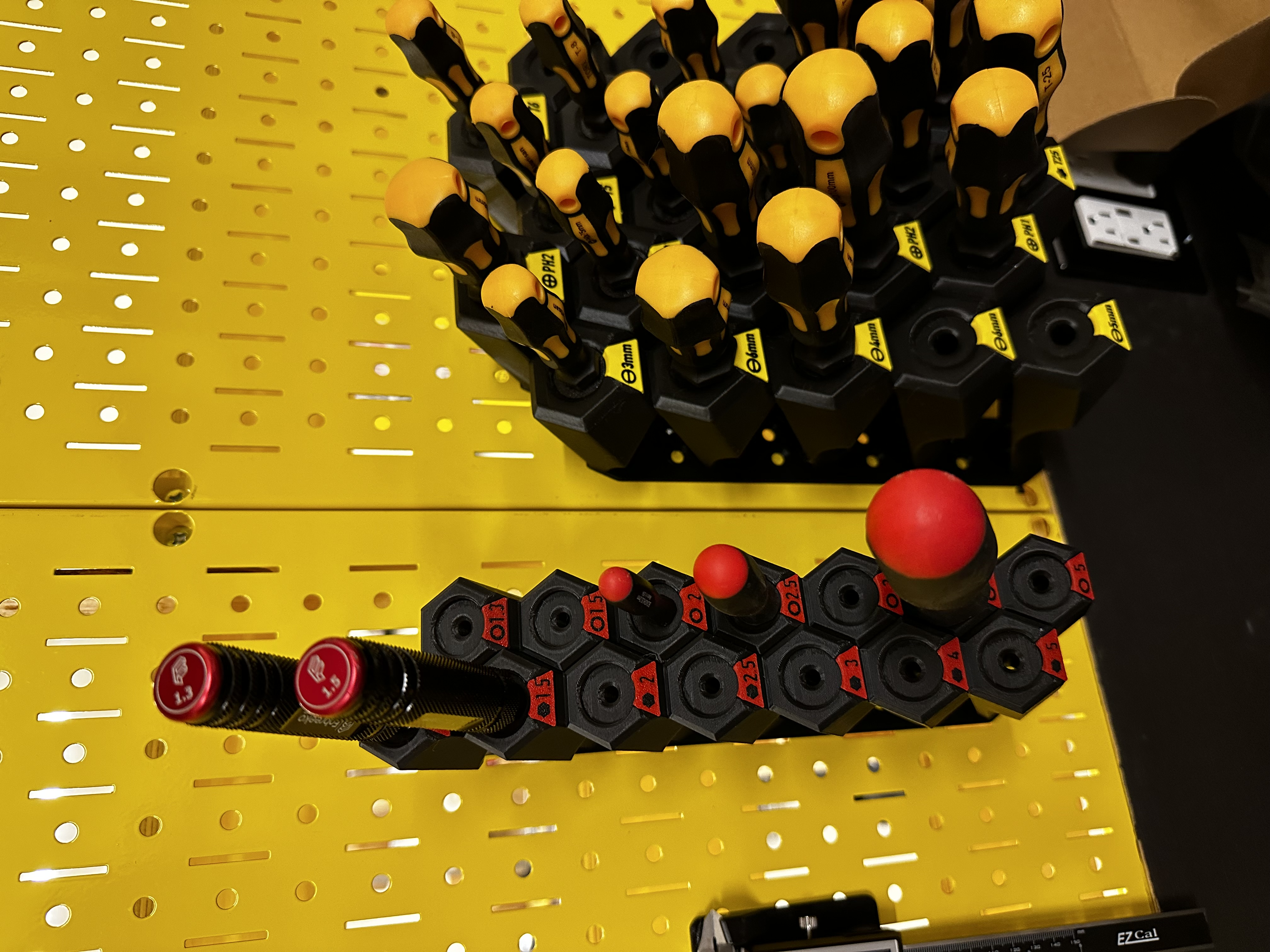 Đã thêm DriverHive Mini! Cái này dành cho các tua vít nhỏ hơn, với đường kính trục tối đa 4mm và đường kính tay cầm tối đa ~ 22mm. Chứa 7 cái trong cùng không gian dọc như phiên bản lớn hơn, với khoảng cách ngang 1 inch thay vì 1,5 inch.