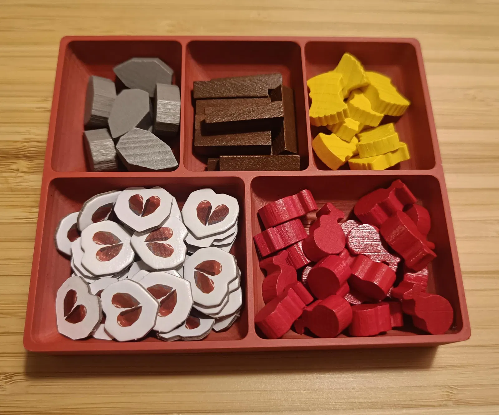 Hộp đựng đồ cho boardgame Paleo. Nắp đậy có thể gắn chặt, và hộp đựng có thể đặt trong nắp khi chơi game để tiết kiệm không gian bàn chơi. Đựng được tất cả các vật phẩm nhỏ + chip hình đầu lâu, hoặc hạt ngũ cốc nếu bạn có bản mở rộng. Bên trong có thiết kế cong để dễ dàng lấy đồ.