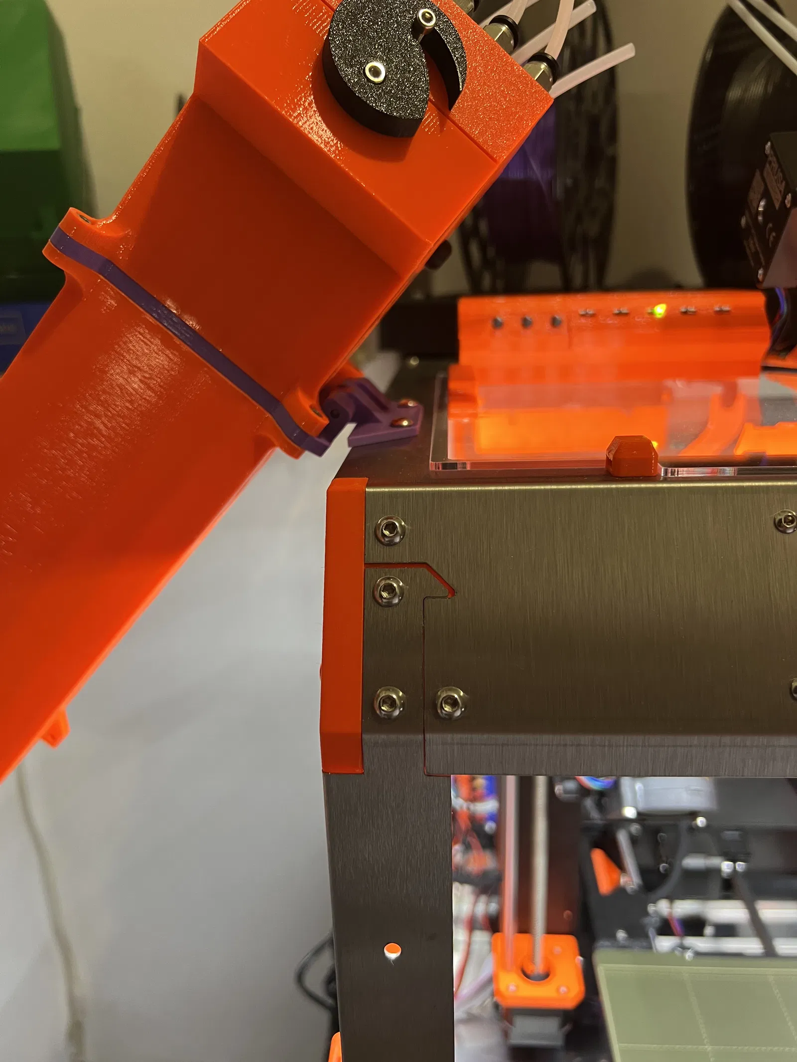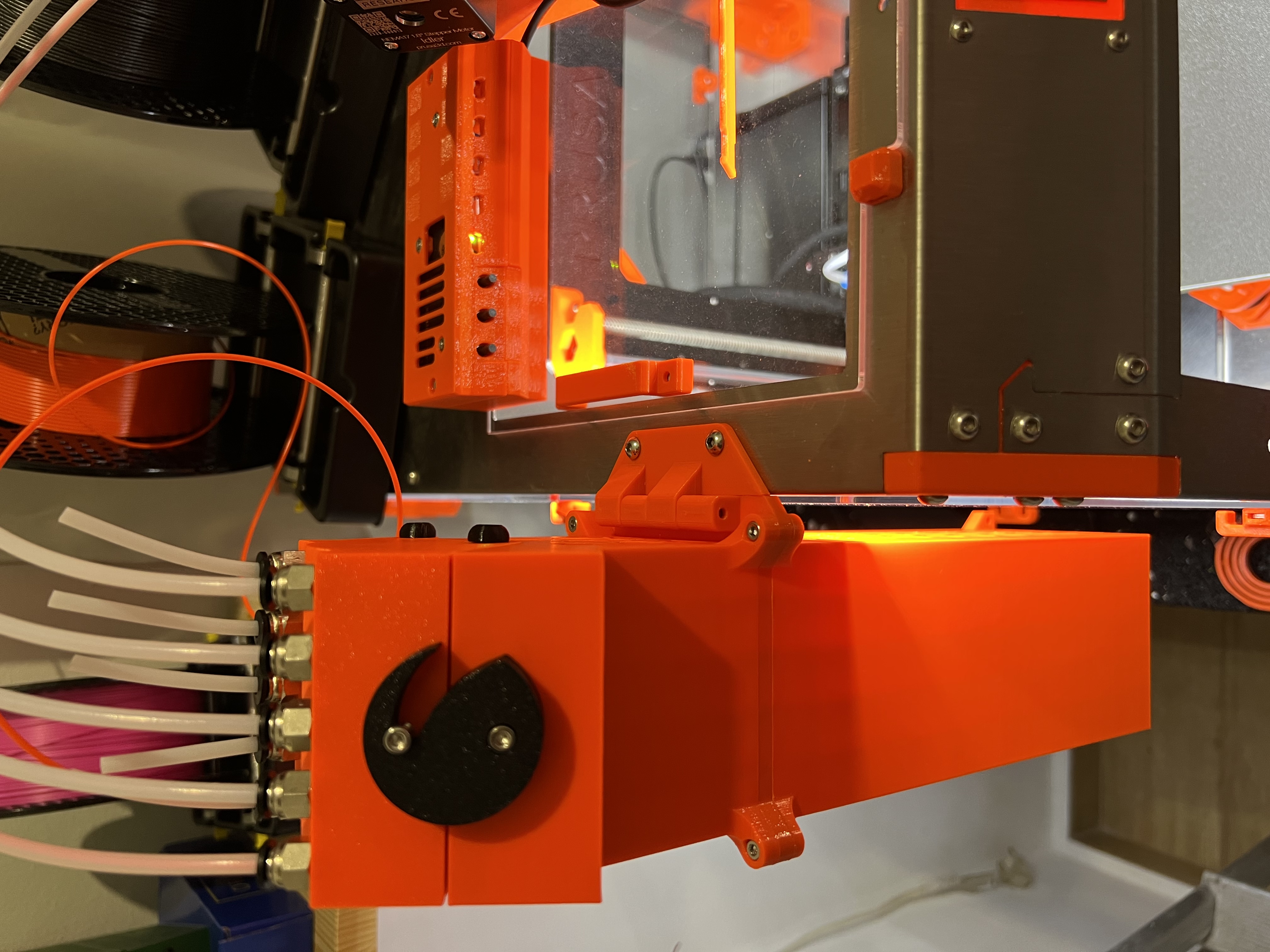 Đây là phiên bản có bản lề của thiết kế của tôi PrusaBox adapter for "MMU2S Buffer (inspired by RMU Buffer)" để bạn cũng có thể mở cửa bên một cách dễ dàng. Tôi giữ nguyên ngôn ngữ thiết kế bản lề của hộp gốc để nó trông không bị lạc lõng trên hộp.
