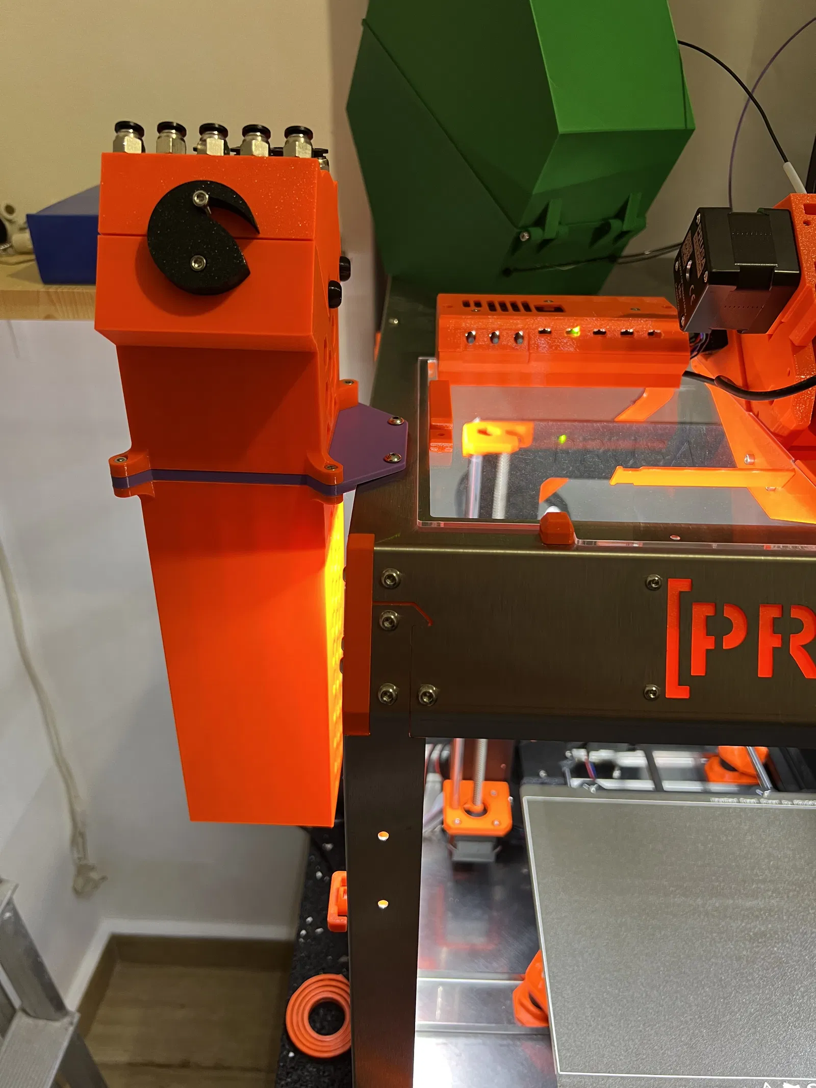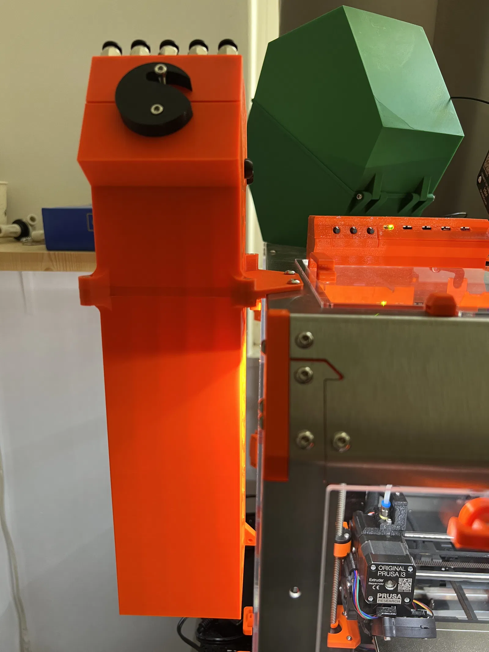 Adapter này cho phép bạn gắn bộ đệm MMU2S (lấy cảm hứng từ RMU Buffer) vào cạnh bên của PrusaBox. Thiết kế có bản lề tùy chọn giúp dễ dàng mở cửa.