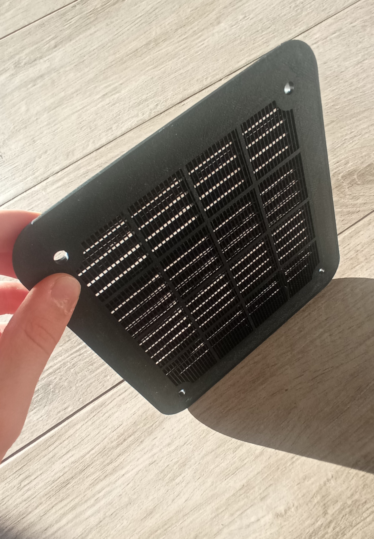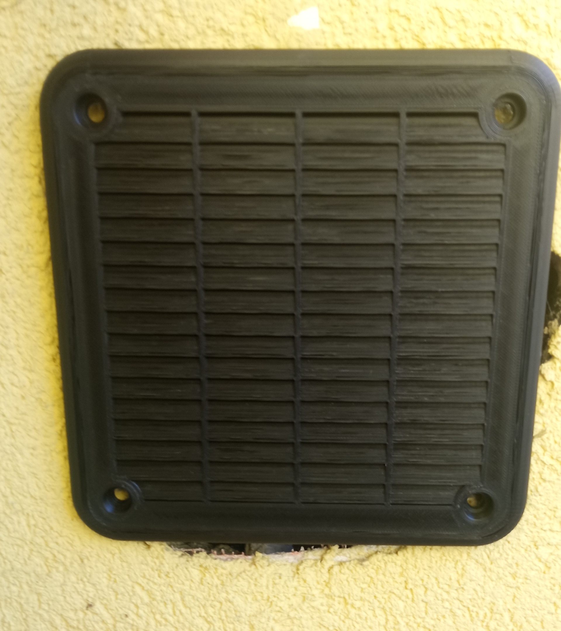 Lưới thông gió ngoài trời có tích hợp màn chống muỗi in liền khối, giúp ngăn chặn côn trùng không mong muốn. Lưới có kích thước 15cm x 15cm. Tôi khuyên bạn nên in bằng ABS hoặc PETG vì khả năng chống tia cực tím vượt trội, nhưng vì lưới của tôi (cái trong hình) không nhận ánh nắng trực tiếp nên tôi đã in bằng PLA thông thường. Tôi khuyên bạn nên in với độ điền đầy cao (high infill) và không cần hỗ trợ (no supports).