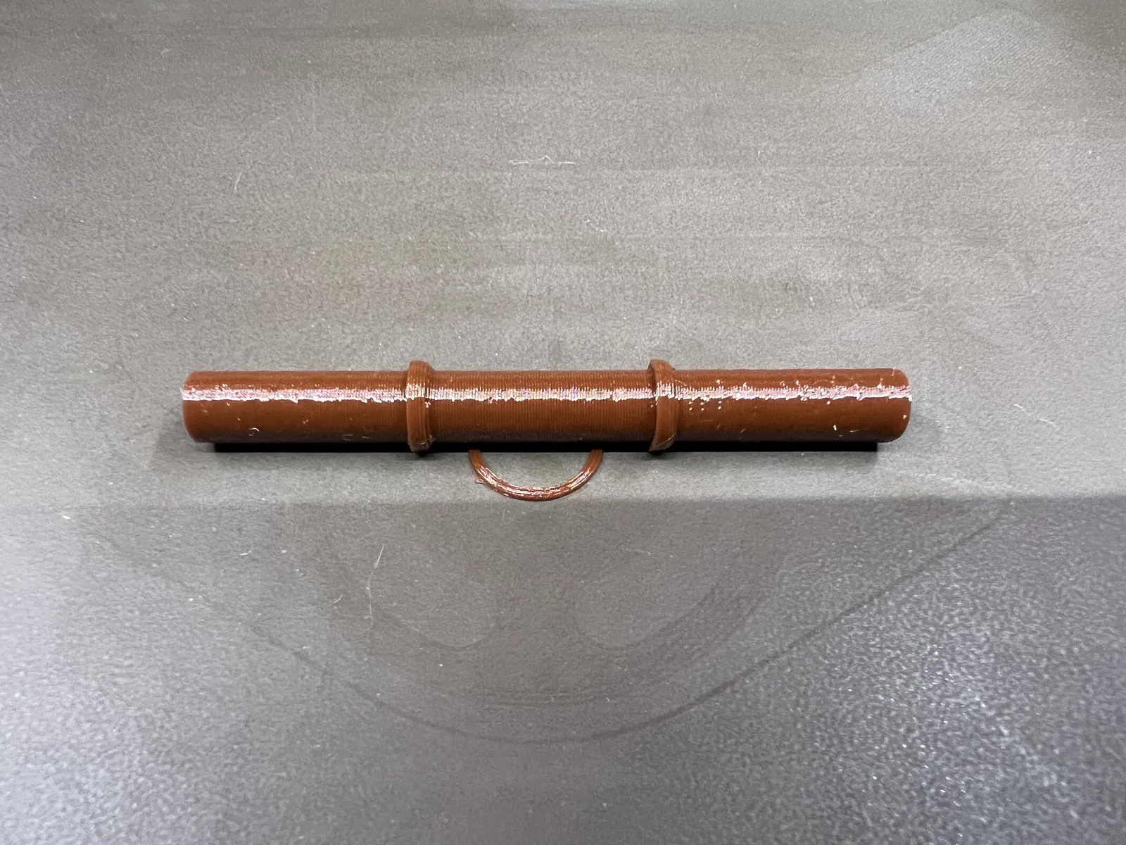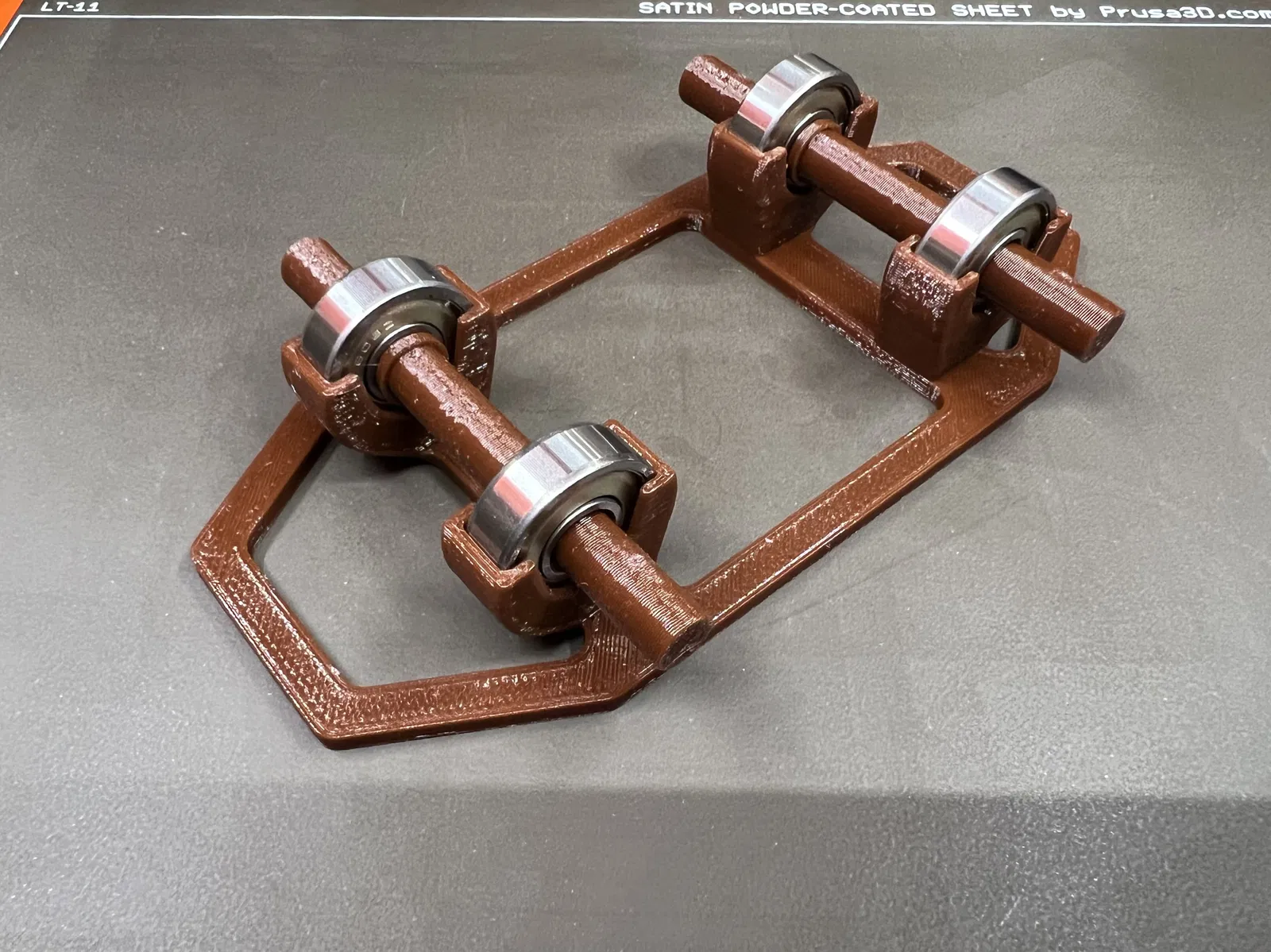 Cái mẫu này được thiết kế để in đứng để giảm ma sát cho cuộn filament. Mẫu gốc được in làm hai phần rồi chà nhám cho vừa với ổ bi, làm cho filament khó lăn và tăng ma sát.