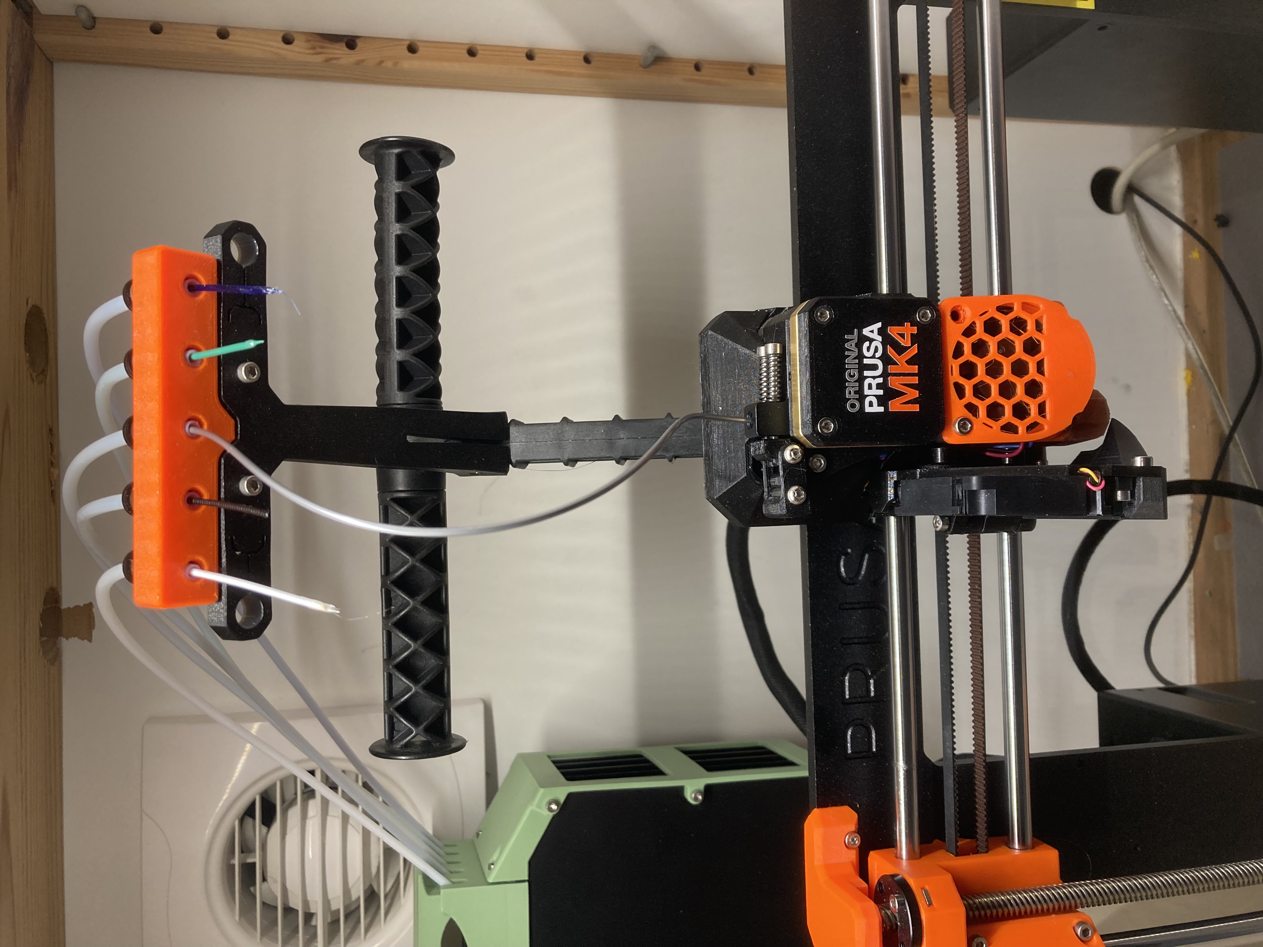 Chưa có bản nâng cấp MMU3 cho MK4? Adapter này giúp bạn thay đổi vật liệu thủ công bằng cách gắn vào bộ dẫn sợi PRUSA, cho phép sử dụng tối đa 5 vật liệu. Tận dụng cả bộ đệm MMU2 cũ để quản lý sợi thừa.