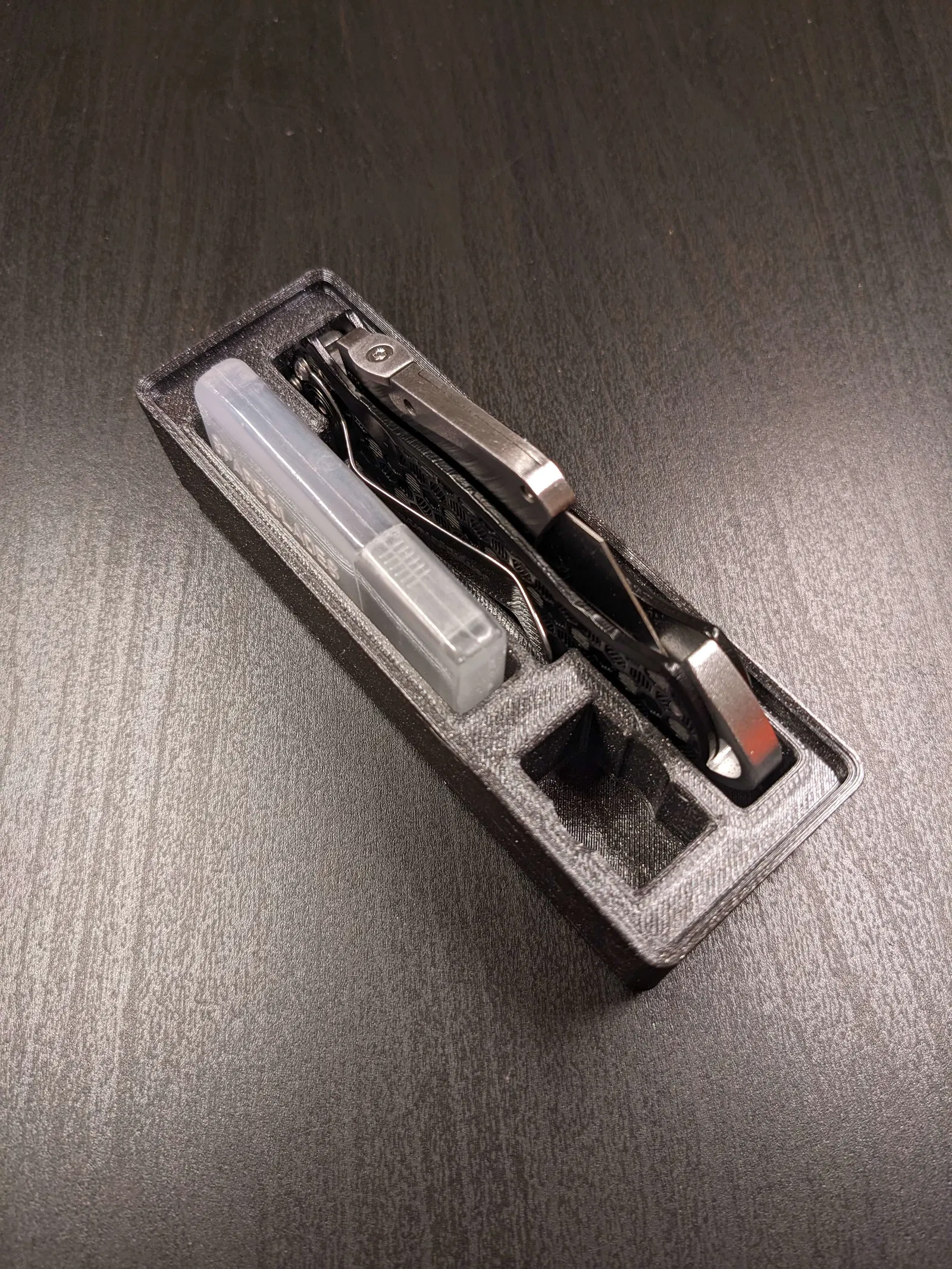 Một khối Gridfinity 3x1 dùng để chứa Dao cạo JerryRigEverything, viên nang nhựa nhỏ đựng lưỡi dao dự phòng và bất kỳ phụ kiện nào trong khe cắm phụ kiện tùy chọn. Dao nên nằm gọn theo một hướng duy nhất, sẵn sàng để lấy. Khe cắm lưỡi dao dự phòng đủ lớn để chứa viên nang bảo vệ với các lưỡi dao tiện ích dự phòng.