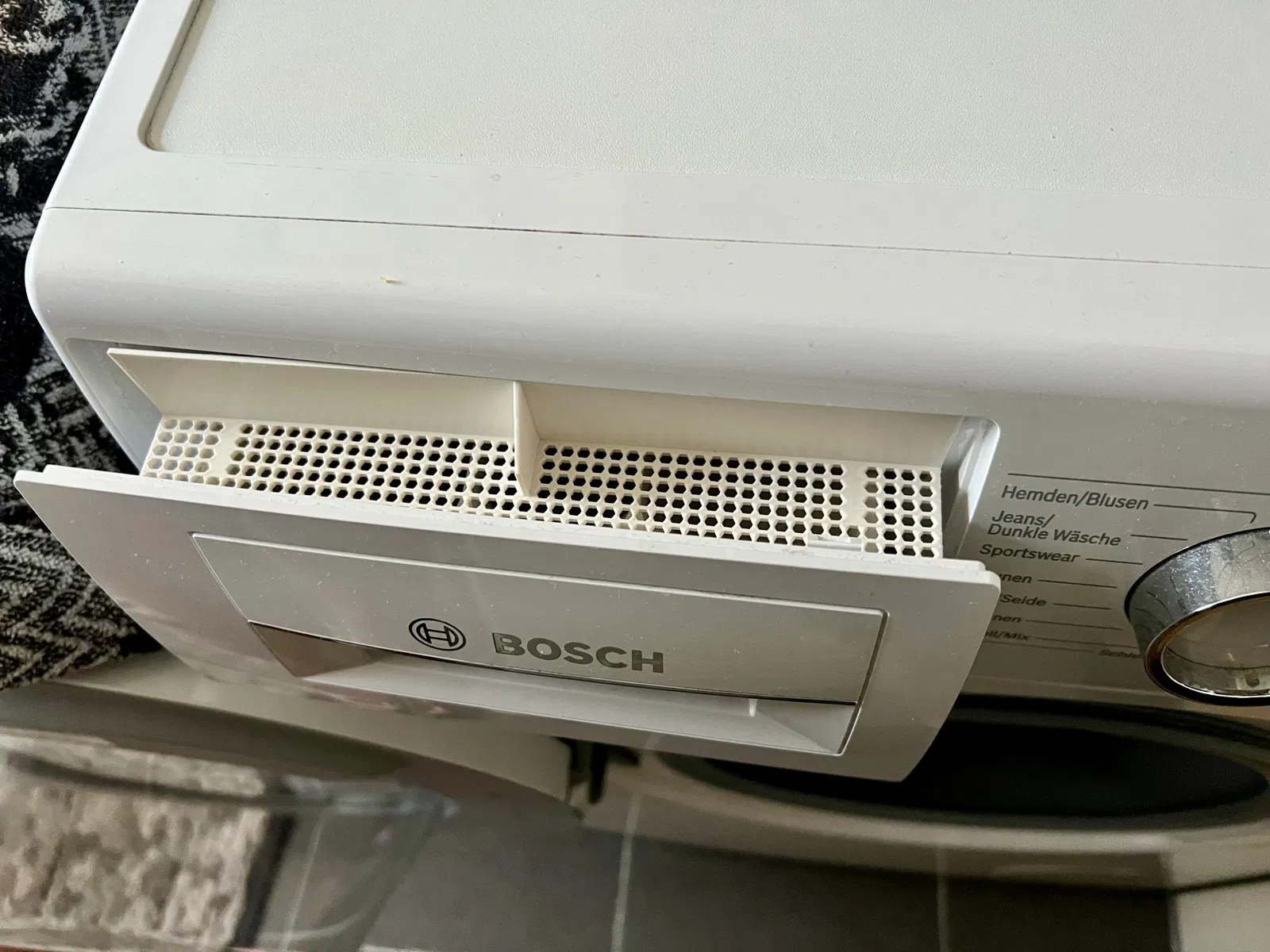 Một nắp đơn giản để ngăn các vật thể rơi vào ngăn chứa bột giặt. Các lỗ nhỏ cho phép ngăn chứa vẫn mở để khô.