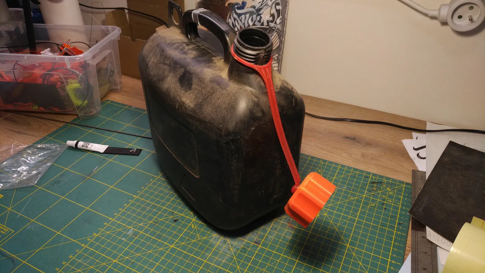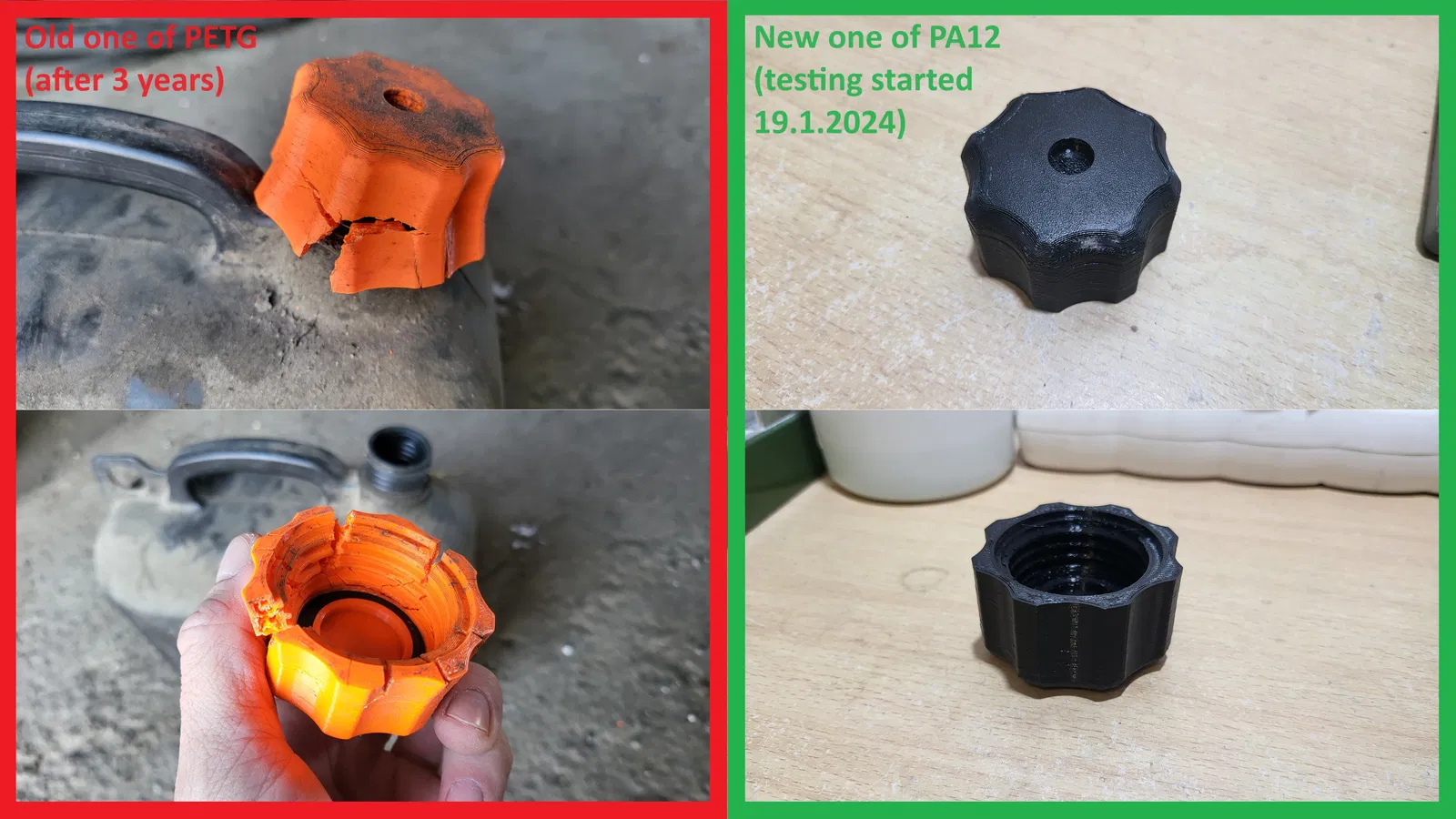 Sau 3 năm, tôi phát hiện ra (và cũng đọc được) rằng PETG không chịu được các thành phần sinh học (và một số phụ gia) trong xăng nên vật liệu PETG trở nên giòn và sau một thời gian sẽ phân rã (xem ảnh). Vì vậy, giờ tôi thử chuyển vật liệu sang PA12 (cụ thể là fiberlogy Nylon PA12 black) và cũng bổ sung g-code đã cập nhật ở đây (nhưng bây giờ là cho MK4 có Input shaper).