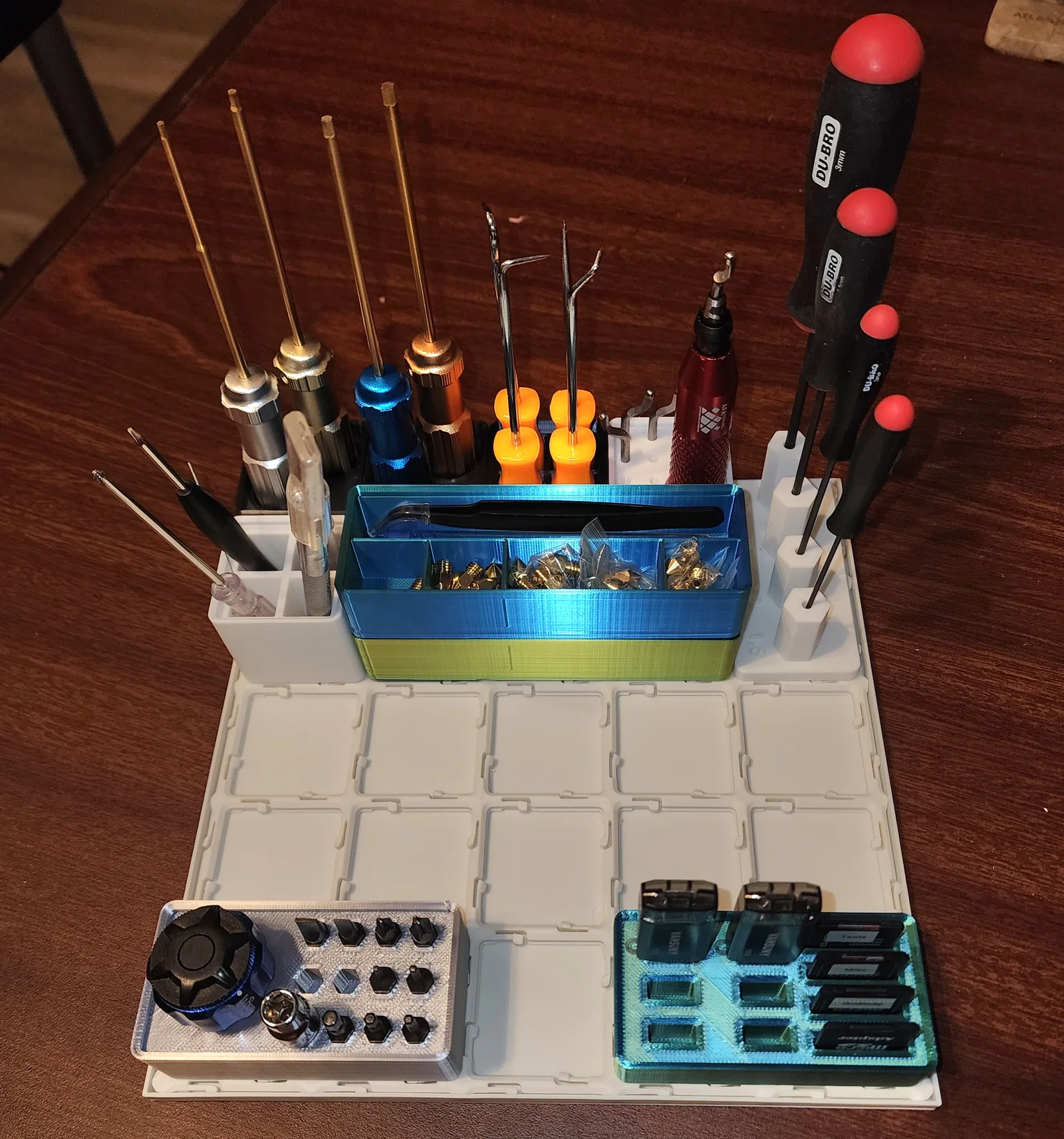 Tạo một khay chắc chắn để giữ plate bấm và tất cả các khay, dụng cụ gridfinity. Mẫu OG Clickfinity - ClickPlates được tạo bởi @jerrym. Khay này hoàn hảo để sắp xếp các bộ phận và công cụ in 3D của bạn.