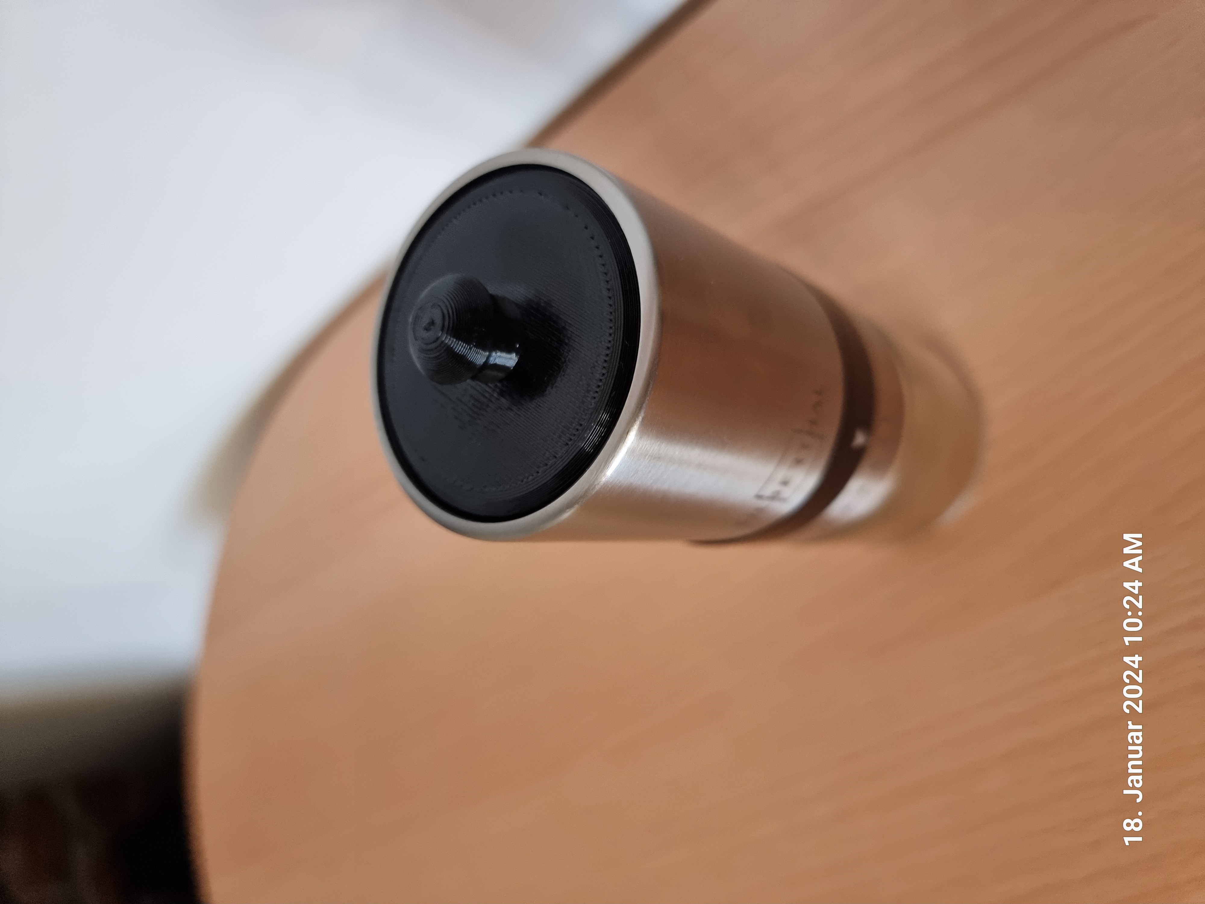 Nắp đậy cho máy xay cà phê Silberthal, giúp hạn chế vụn cà phê rơi ra ngoài khi di chuyển. Sản phẩm được in bằng PETG trên máy Prusa MK4 với đầu phun 0.4mm, có sử dụng support.