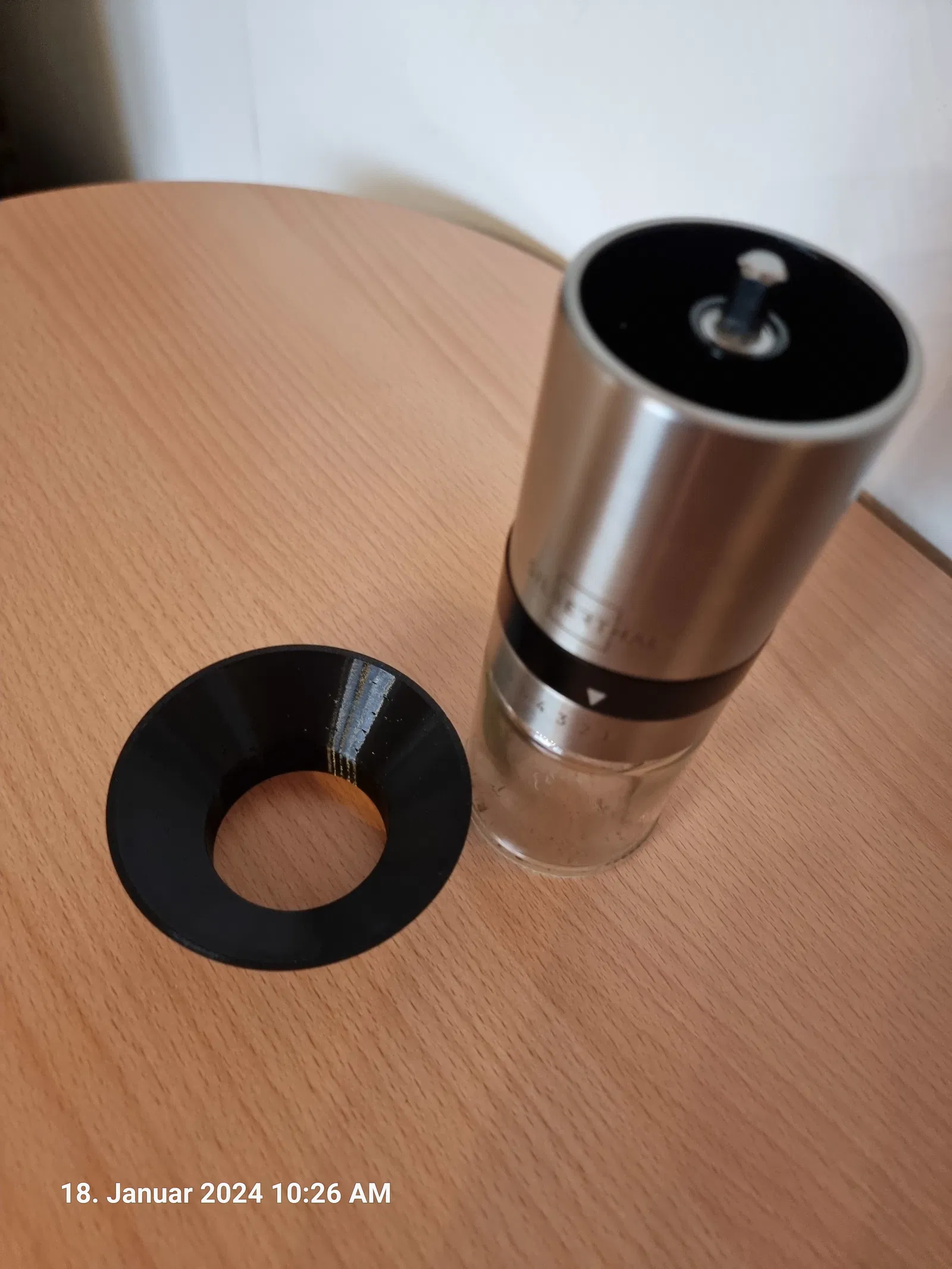 Phễu nạp cà phê dùng để gắn vào miệng nạp của máy xay cà phê Silberthal. Sản phẩm được in với đầu phun 0.4 mm bằng vật liệu PETG và không cần vật liệu hỗ trợ, miệng lớn hướng xuống khi in.