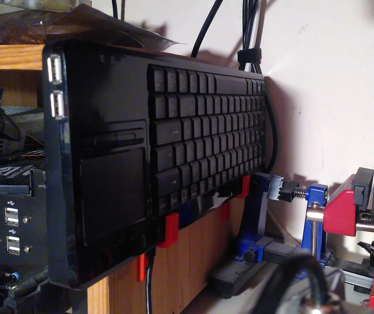 Bộ giá đỡ đơn giản để gắn bàn phím lên các bề mặt thẳng đứng như tường bằng ốc vít. Bàn phím không nên dày hơn 21mm. Hướng dẫn in ấn chi tiết và ghi chú thêm về cách cải thiện mẫu mã, hỗ trợ tác giả và sử dụng thương mại.