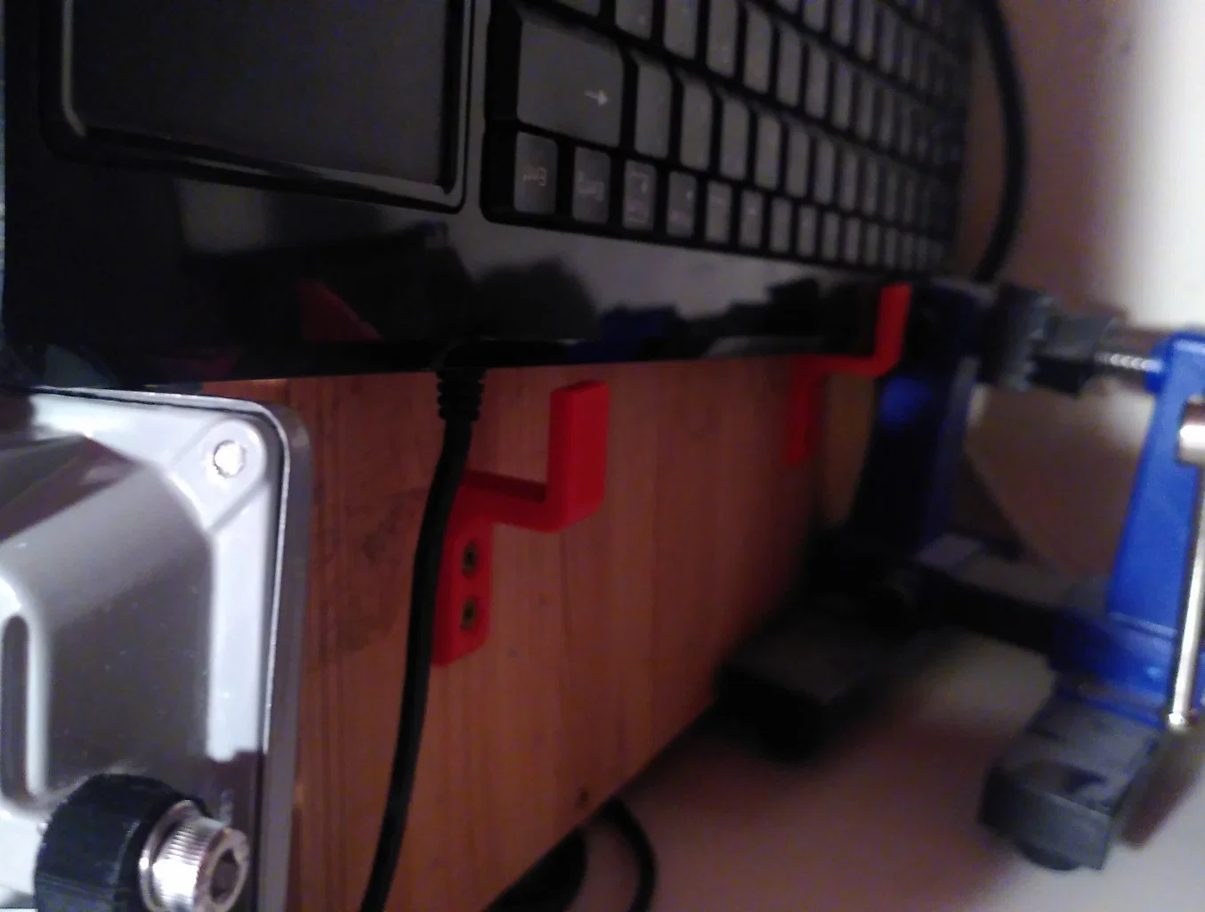 Đây là các giá đỡ để gắn bàn phím lên các bề mặt thẳng đứng như tường bằng ốc vít. Mình đã gắn lên cái kệ máy tính bằng gỗ của mình. Bàn phím không nên dày hơn 21mm.
