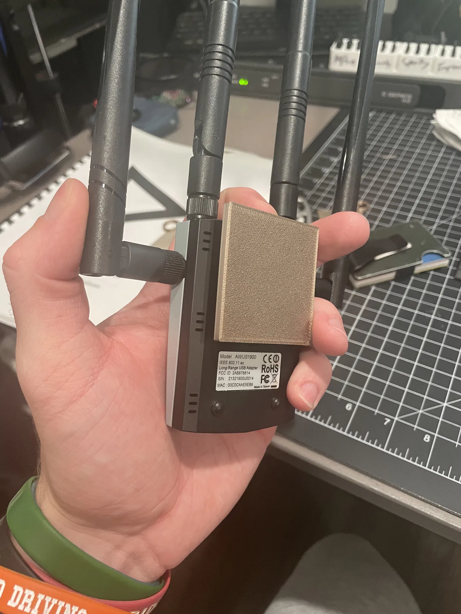 Một cái đế đơn giản cho card wifi Alfa AWUS1900 có chế độ monitor. Cái này giúp bạn tùy chỉnh đế theo ý muốn, được in bằng PLA và giữ chặt card ngay cả khi gắn ăng-ten lớn.