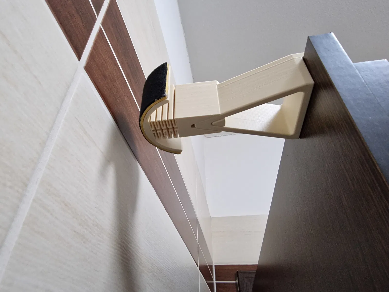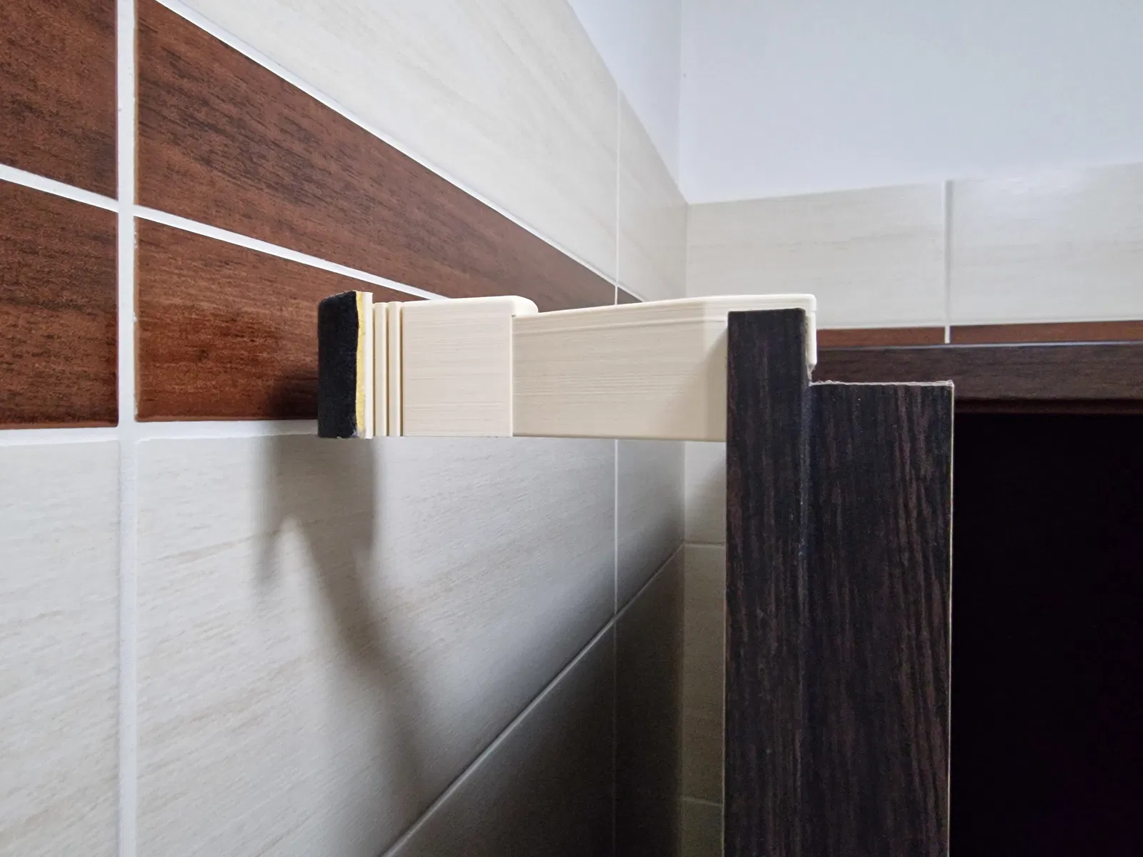 Nẹp cửa làm ra để khỏi bị bể hoặc dịch chuyển khỏi vị trí cũ, như vậy thì nó mới hoạt động hiệu quả. Nẹp cửa này được làm để treo lên cánh cửa (chiều rộng cửa 14mm). Ban đầu nẹp cửa hơi cứng, nên có thêm phần gắn vô cho dẻo để tăng độ bền. Lý do chia làm hai phần là để nếu phần dẻo bị hư thì mình chỉ cần in lại phần đó thôi. Mà tới giờ thì nó vẫn còn tốt chán, con nít phá cũng không xi nhê gì!