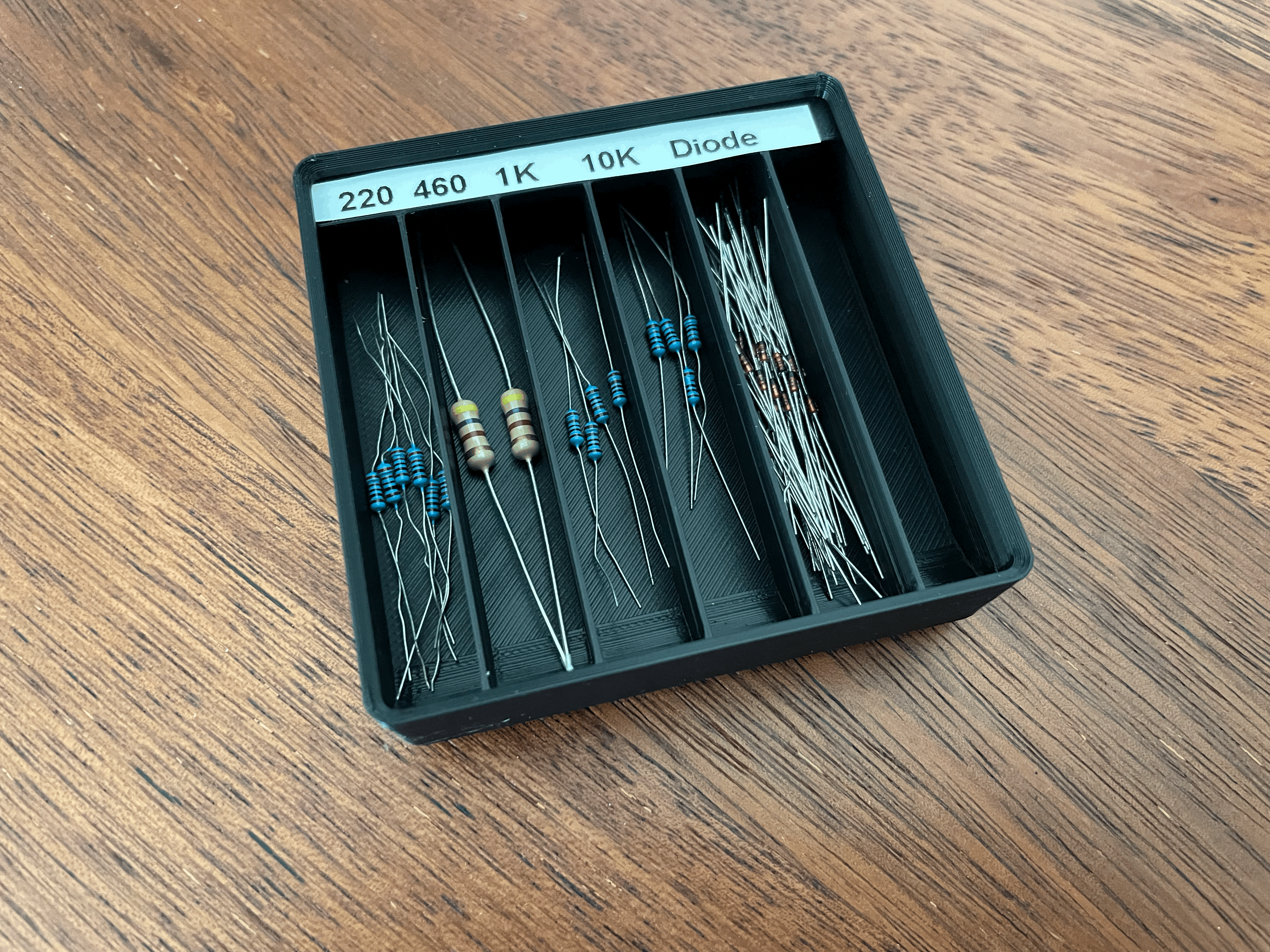 Khay đựng điện trở Gridfinity với thiết kế nửa chiều cao, cho phép xếp chồng. Có nhiều kích cỡ chiều rộng, đựng được 3-9 loại điện trở. Có khu vực dán nhãn. Dễ in, tiết kiệm vật liệu.