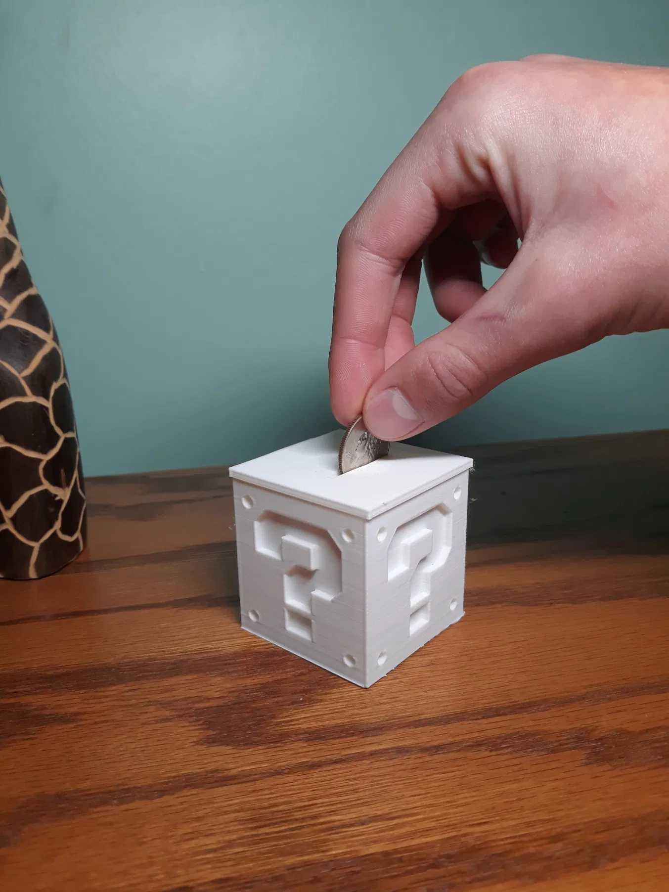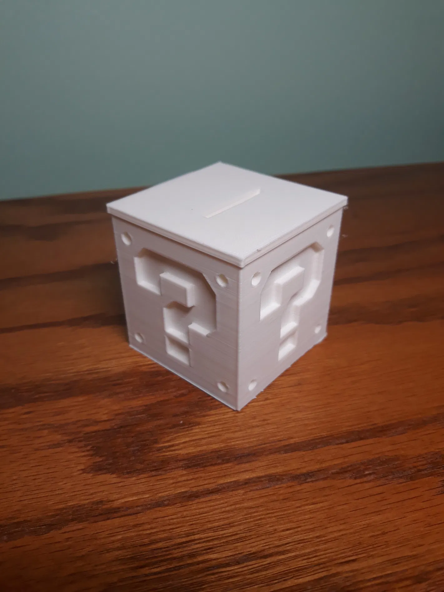 Mẫu in 3D chiếc hộp dấu chấm hỏi quen thuộc trong Super Mario, dùng để đựng tiền xu. Một món quà độc đáo cho fan Nintendo, in bằng PLA trắng với ruột 15% và không cần support. Tốc độ in 80mm/s tùy máy.