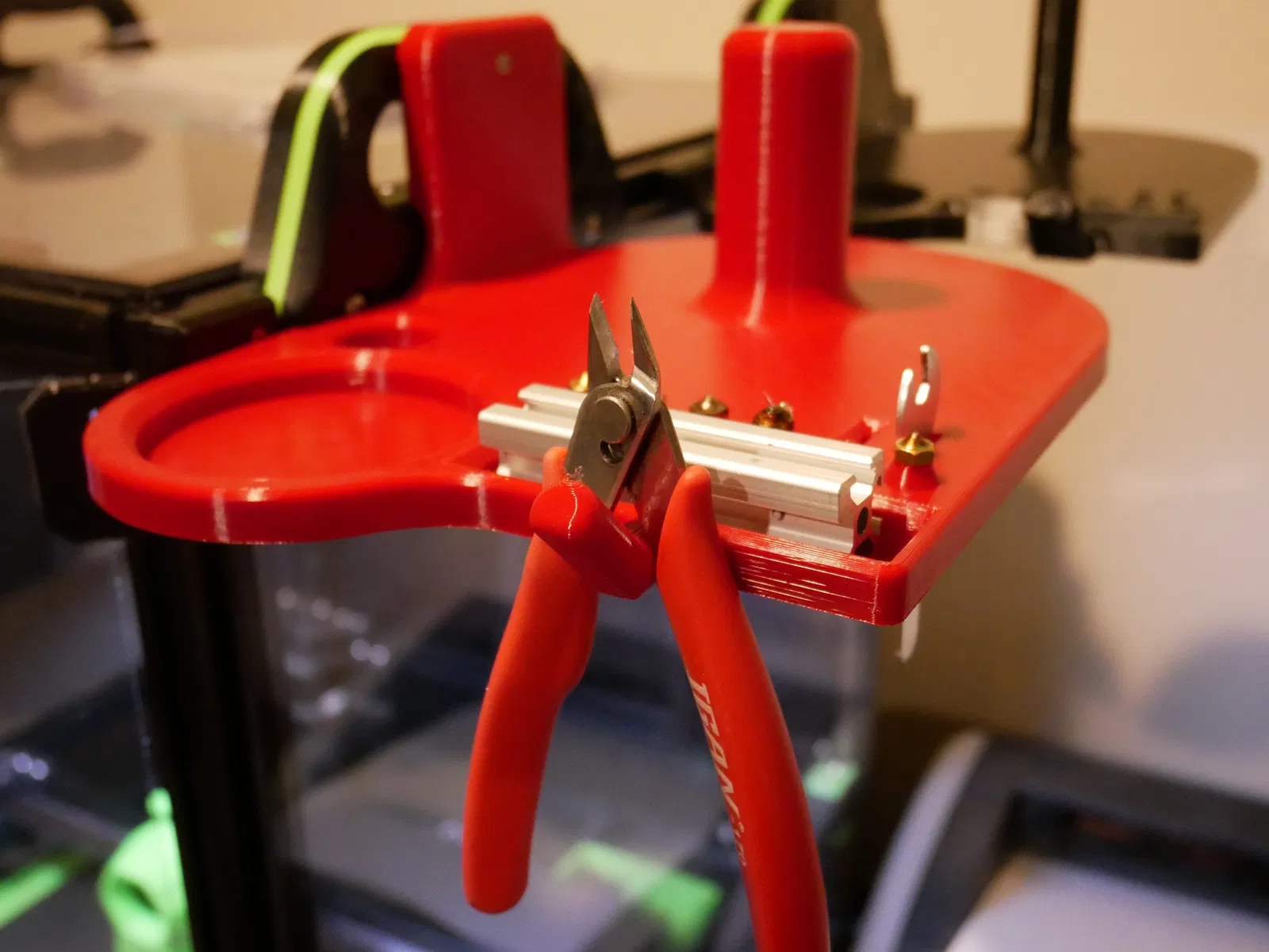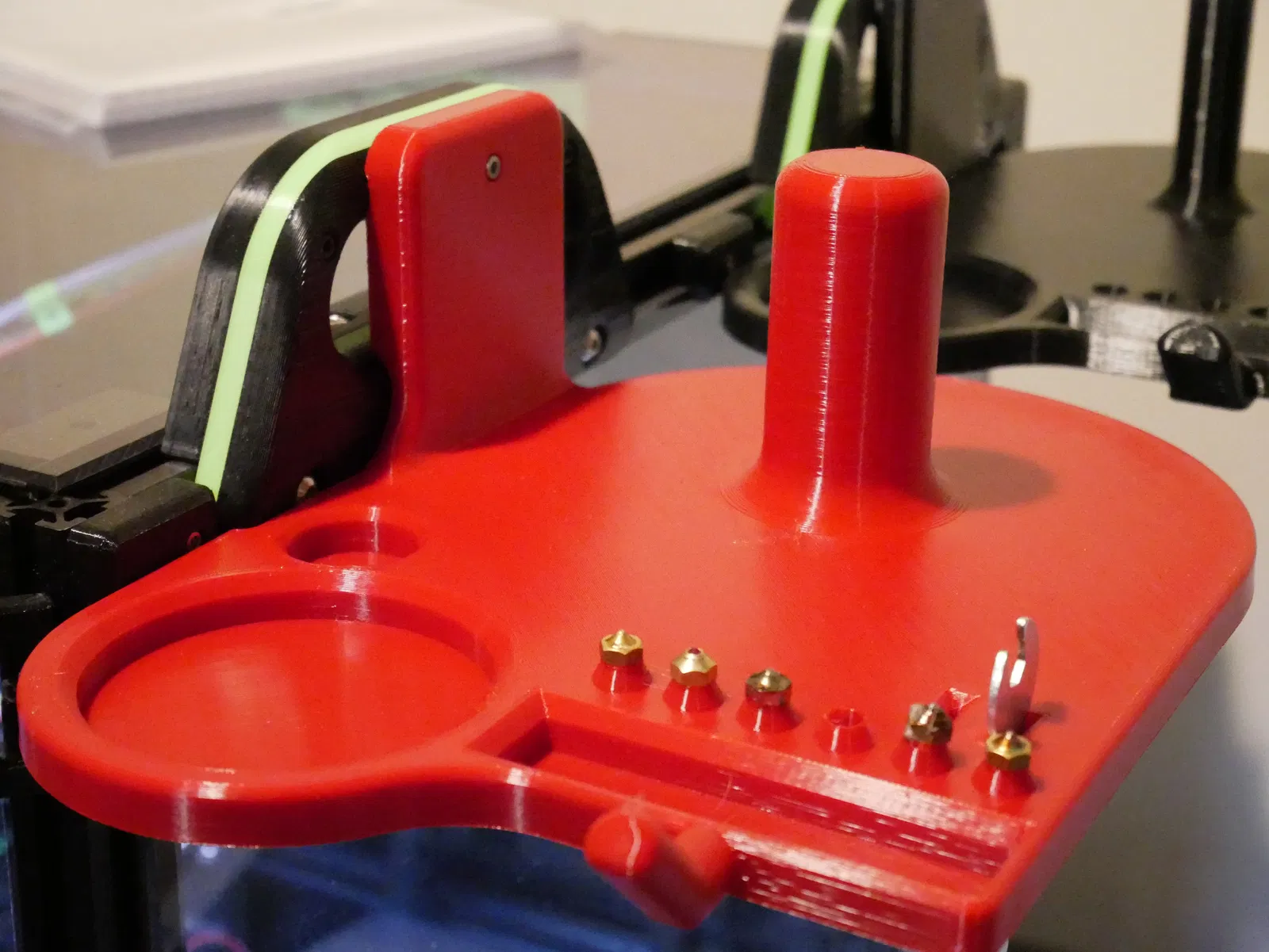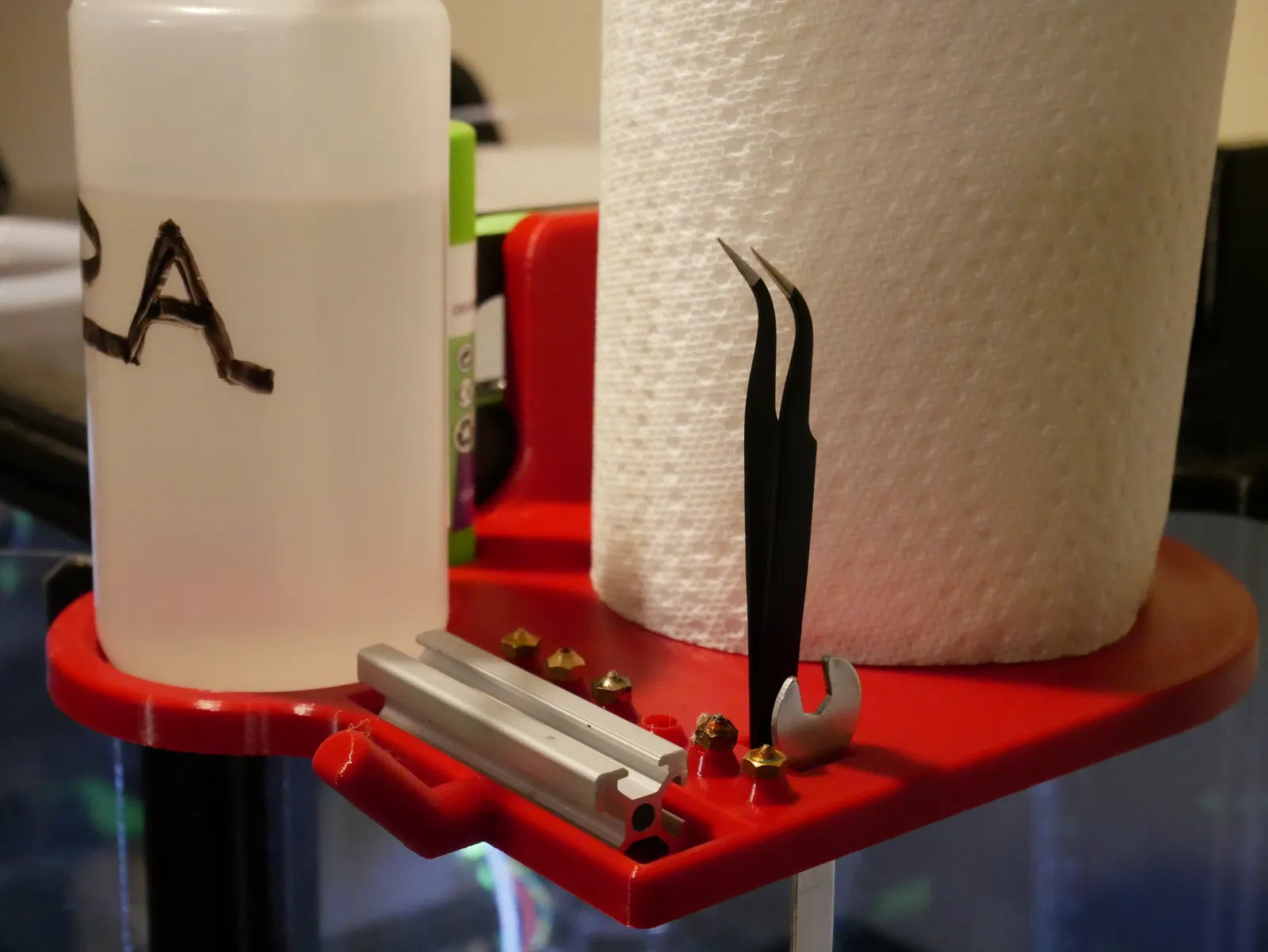 Khay gắn vào tay cầm Voron 2.4, tiện lợi để đựng đầu phun, keo xịt, dụng cụ,... Phần giữ nhôm định hình 2020 chịu nhiệt tốt, thích hợp đặt đầu phun nóng. Khuyến khích in giá đỡ với infill cao để tăng độ cứng cáp.