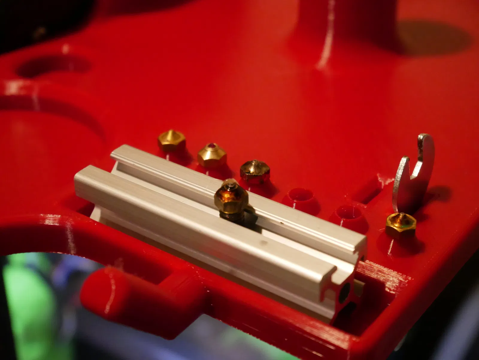 Phần giữ thanh nhôm định hình 2020 là bề mặt chịu nhiệt để đặt đầu phun vừa thay xong. Tui hay thay đầu phun lắm nên có chỗ đặt mà không sợ chảy là tiện ghê!