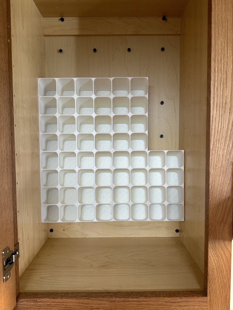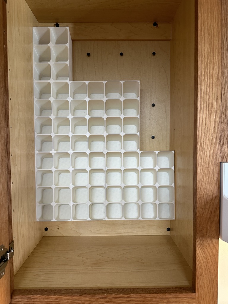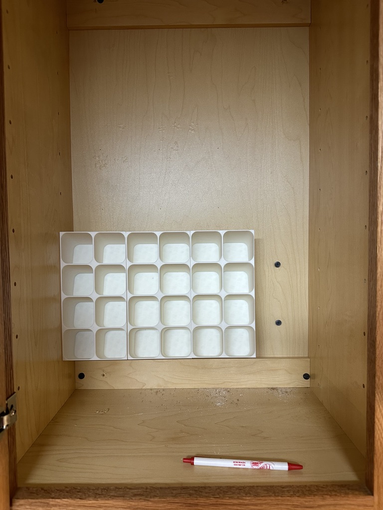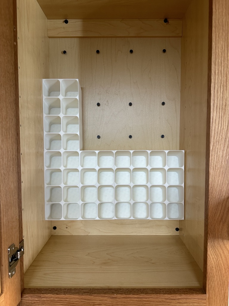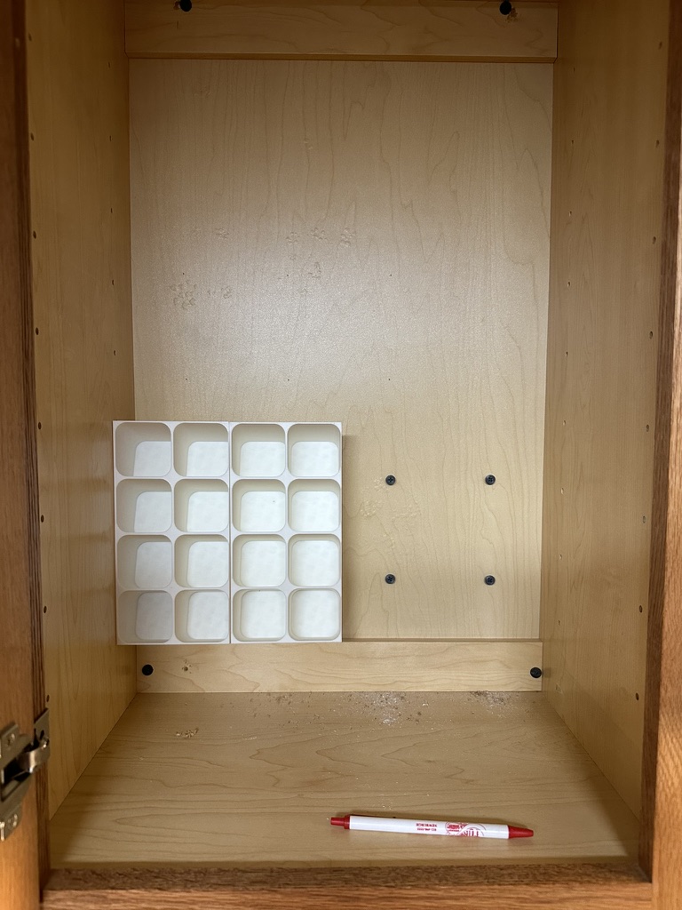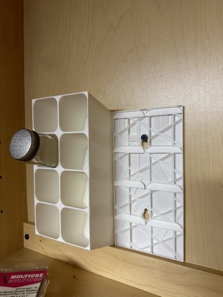 Phiên bản mod kệ gia vị để bàn, giờ có thể gắn bên trong tủ. Có thêm lỗ gắn, thiết kế xếp chồng khít và mẫu gắn đi kèm. Dù có vẻ chắc chắn, nên dùng ốc vít để cố định thêm.