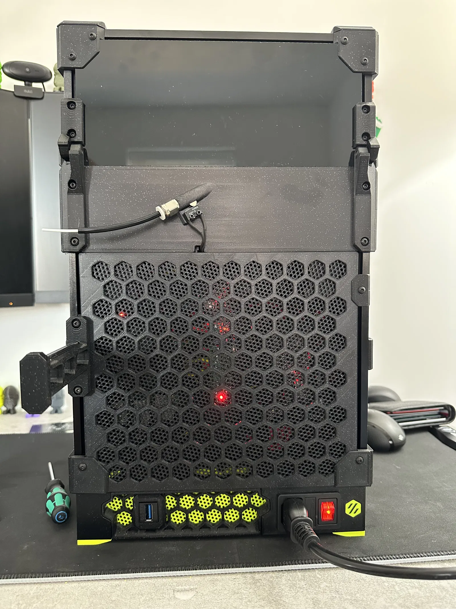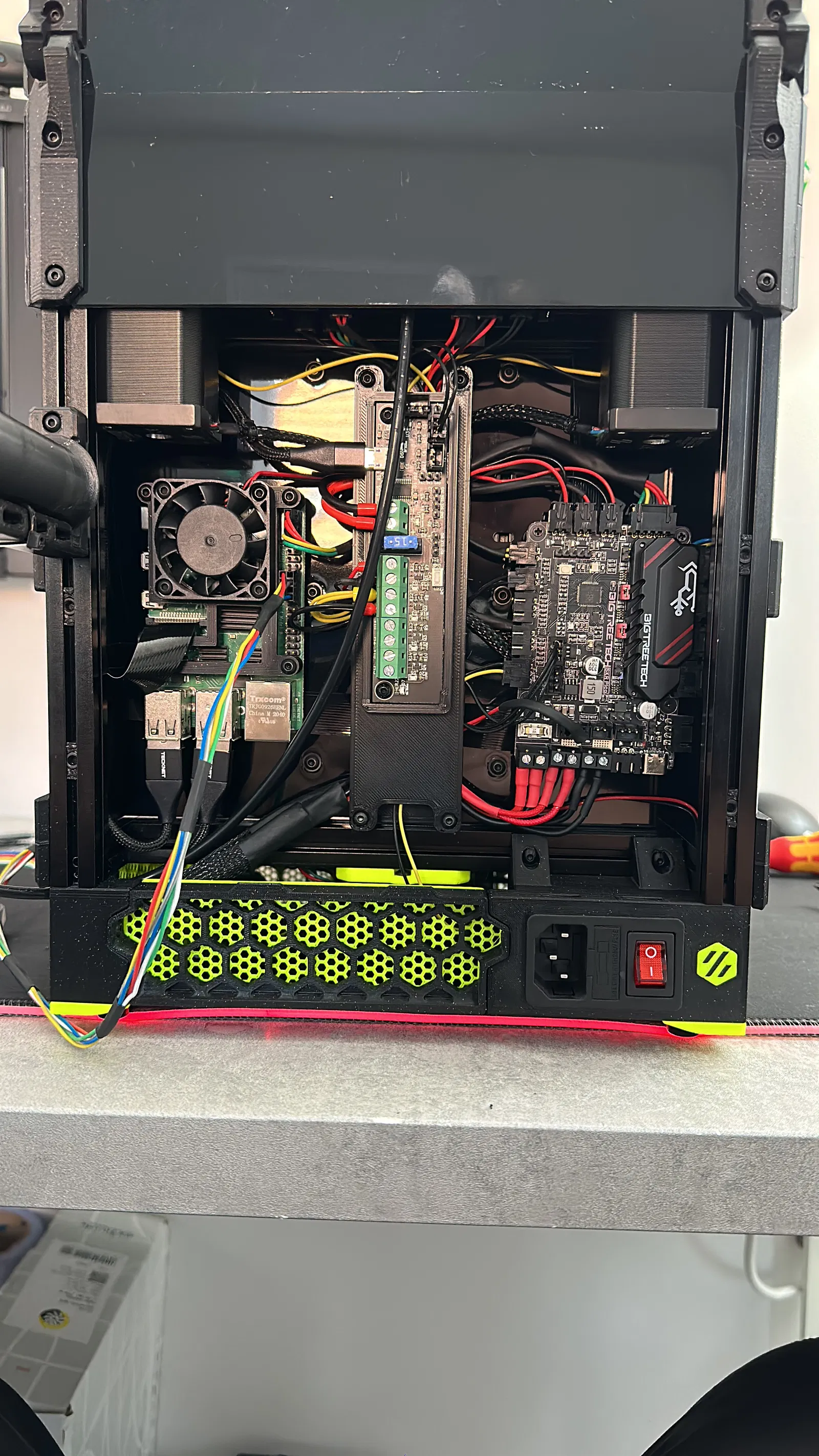 Chế lại nhanh phần đế/lỗ cấp nguồn chính cho em V0.2 mới để tạo điểm nhấn hai màu đẹp mắt ở phía sau luôn nha. Sao mà không muốn cái logo Voron của mình nổi bật hơn chứ???