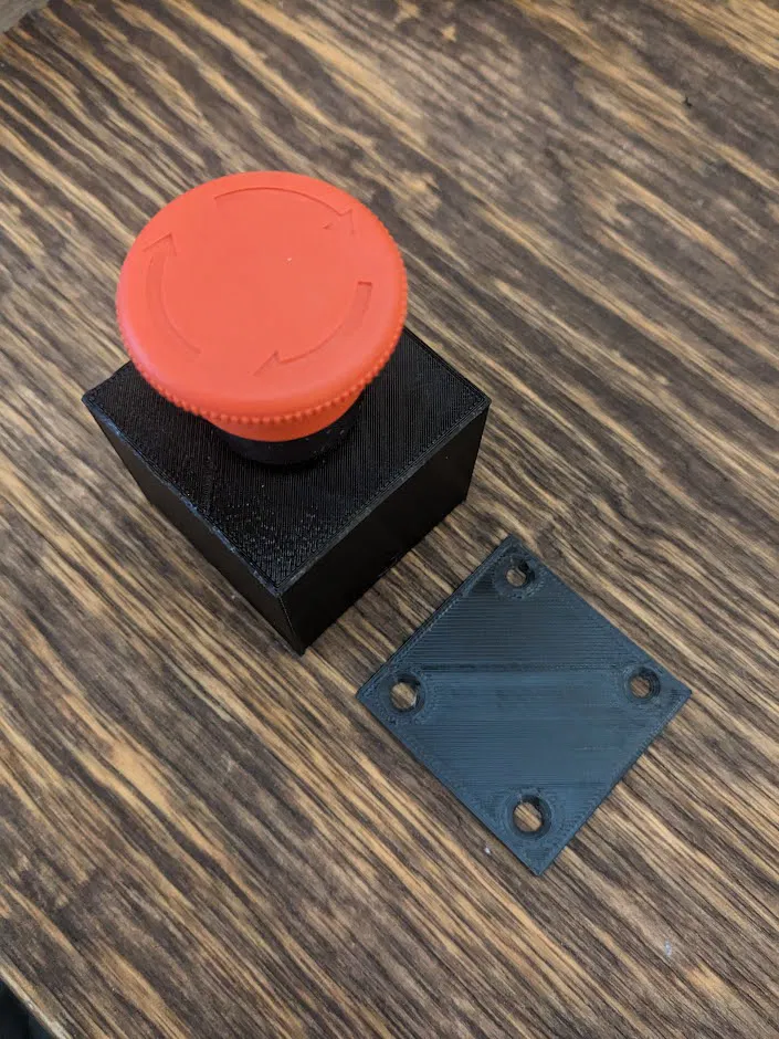 Hộp đựng nút dừng khẩn cấp E-Stop. Kích thước lỗ phía trên là 22mm, phù hợp với các nút có trục khoảng 21.5mm. Phần nắp dưới có thể gắn vào bề mặt, hộp sẽ trượt lên nắp. Có tệp STL gộp cả hai phần để dễ scale.