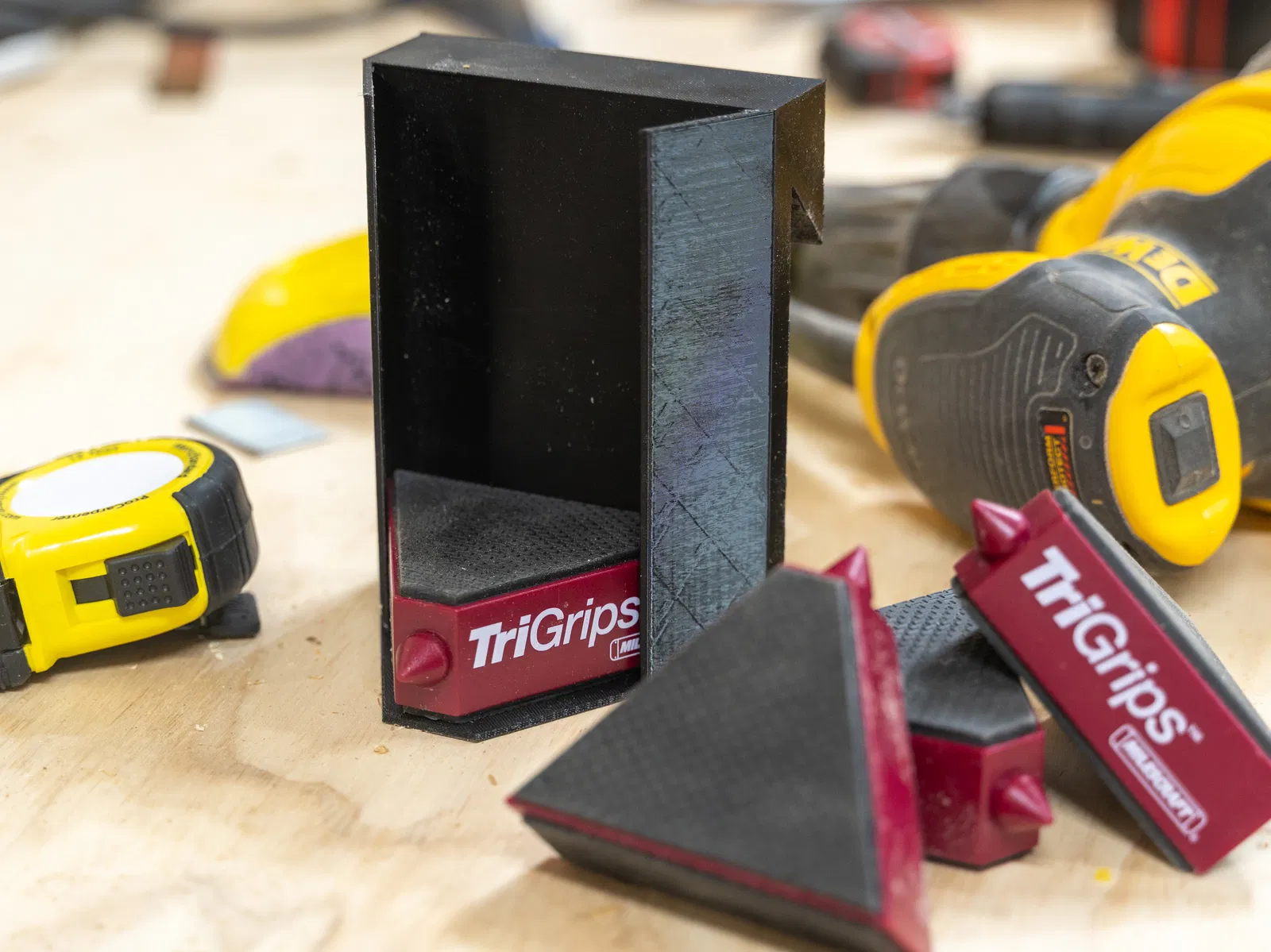 Cái đế này được thiết kế để chứa bốn cái Milescraft Tri-Grips, rất tiện để bạn lấy Tri-Grips ra khỏi tường và đặt lên bàn làm việc, vì nó có thể tự đứng vững ngay cả khi không có gì bên trong. Bạn cũng có Rockler's Bench Cookies hả? Xem thêm danh sách khác của tôi chuyên dành cho món đó nha!