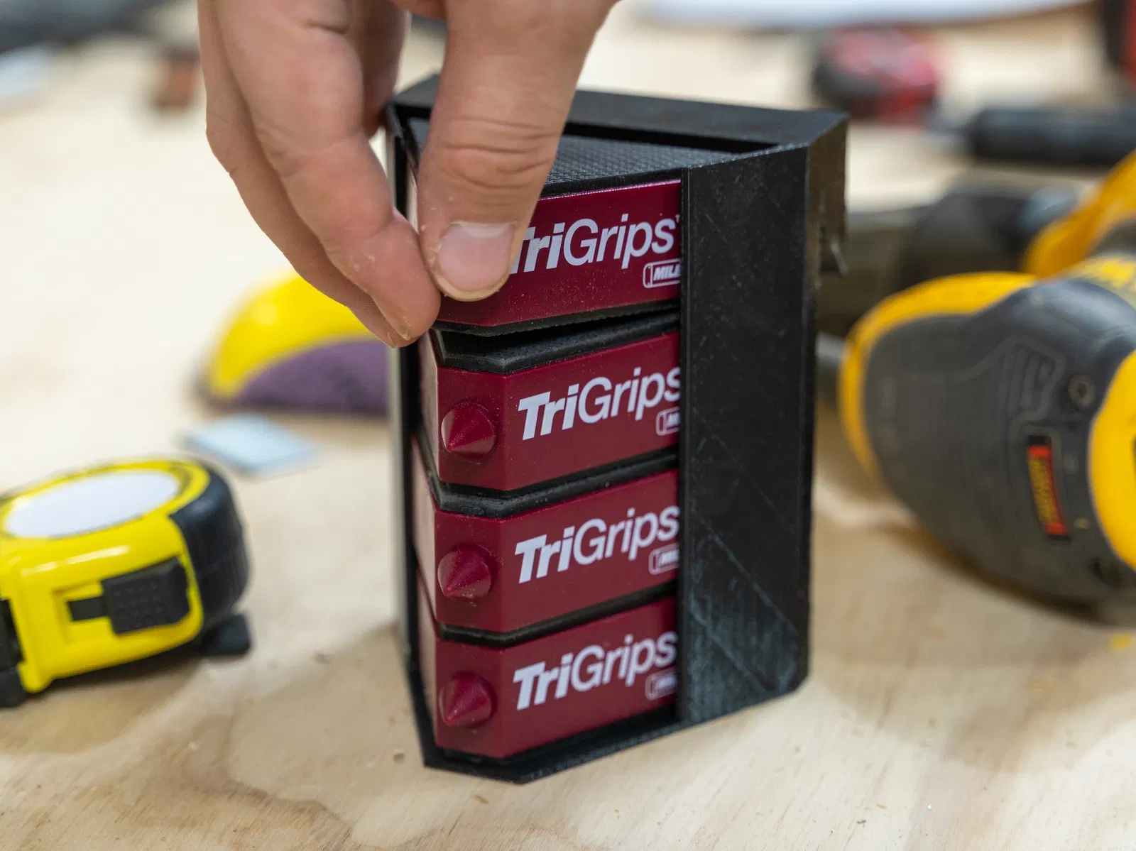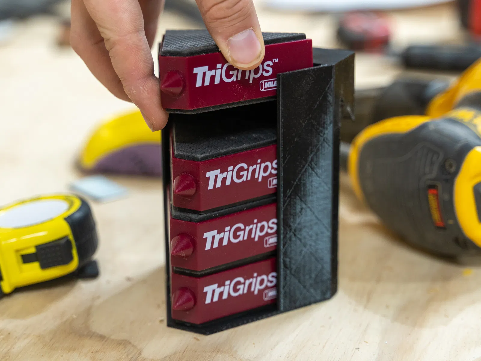Giá treo này được thiết kế đặc biệt để giữ bốn cái Milescraft Tri-Grips, giúp bạn dễ dàng lấy ra và đặt lên bàn làm việc. Nó tự đứng vững, tiện lợi cho việc sắp xếp xưởng và luôn biết Tri-Grips ở đâu.