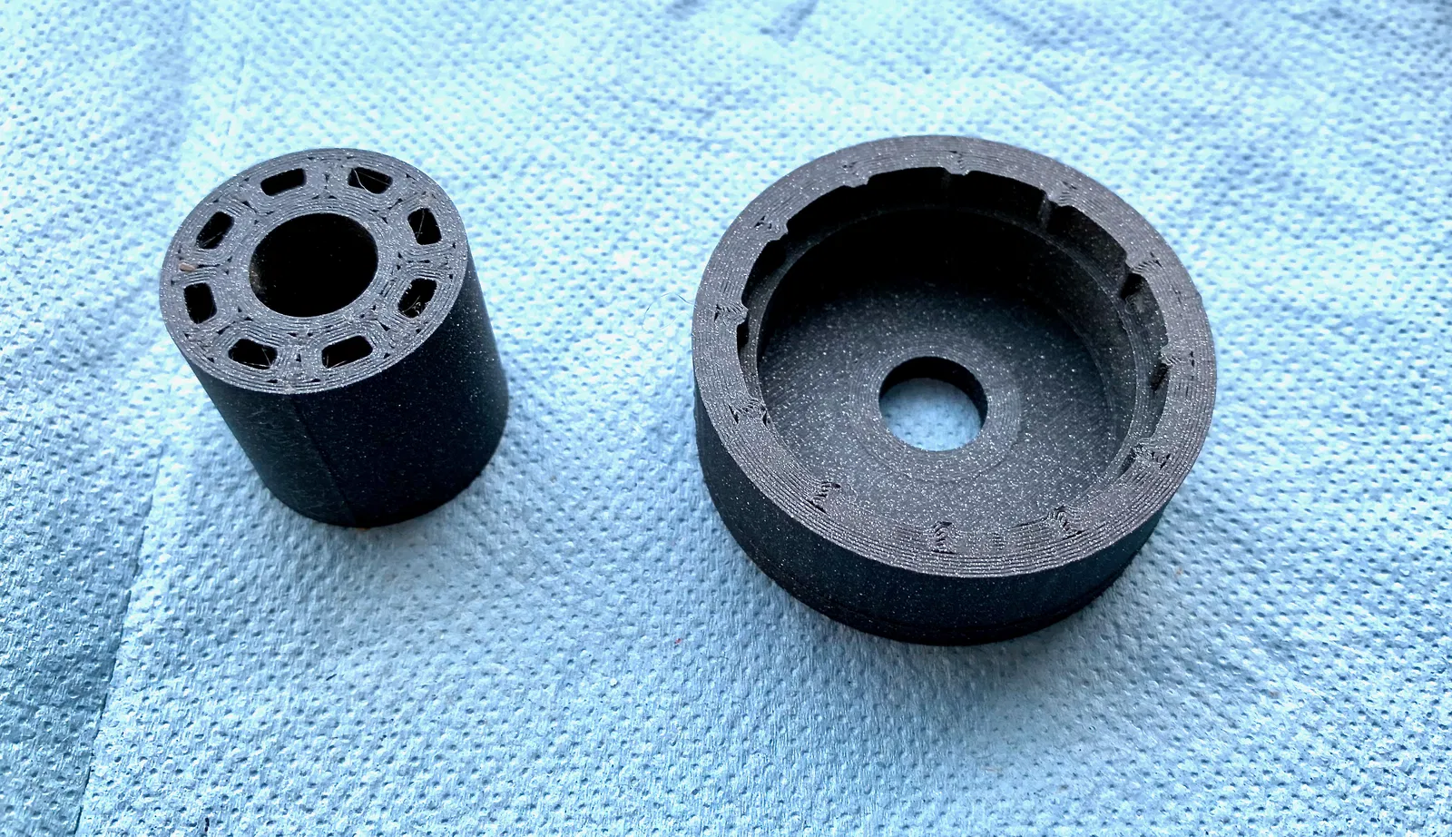 Tui xài PLA cho tất cả các bộ phận. Để đảm bảo là nó đủ cứng cáp, tui đặt số lớp vỏ ngoài (perimeters) của các lớp dọc là 12, các lớp nằm ngang (horizontal shells) là 8 và lớp ruột (infill) là 60%, kiểu cubic, nên mấy cái bộ phận này gần như là đặc luôn. Có thể dùng thêm một cái vòng đệm kim loại (metal washer) giữa cái sleeve và tay cầm nếu cần thiết.