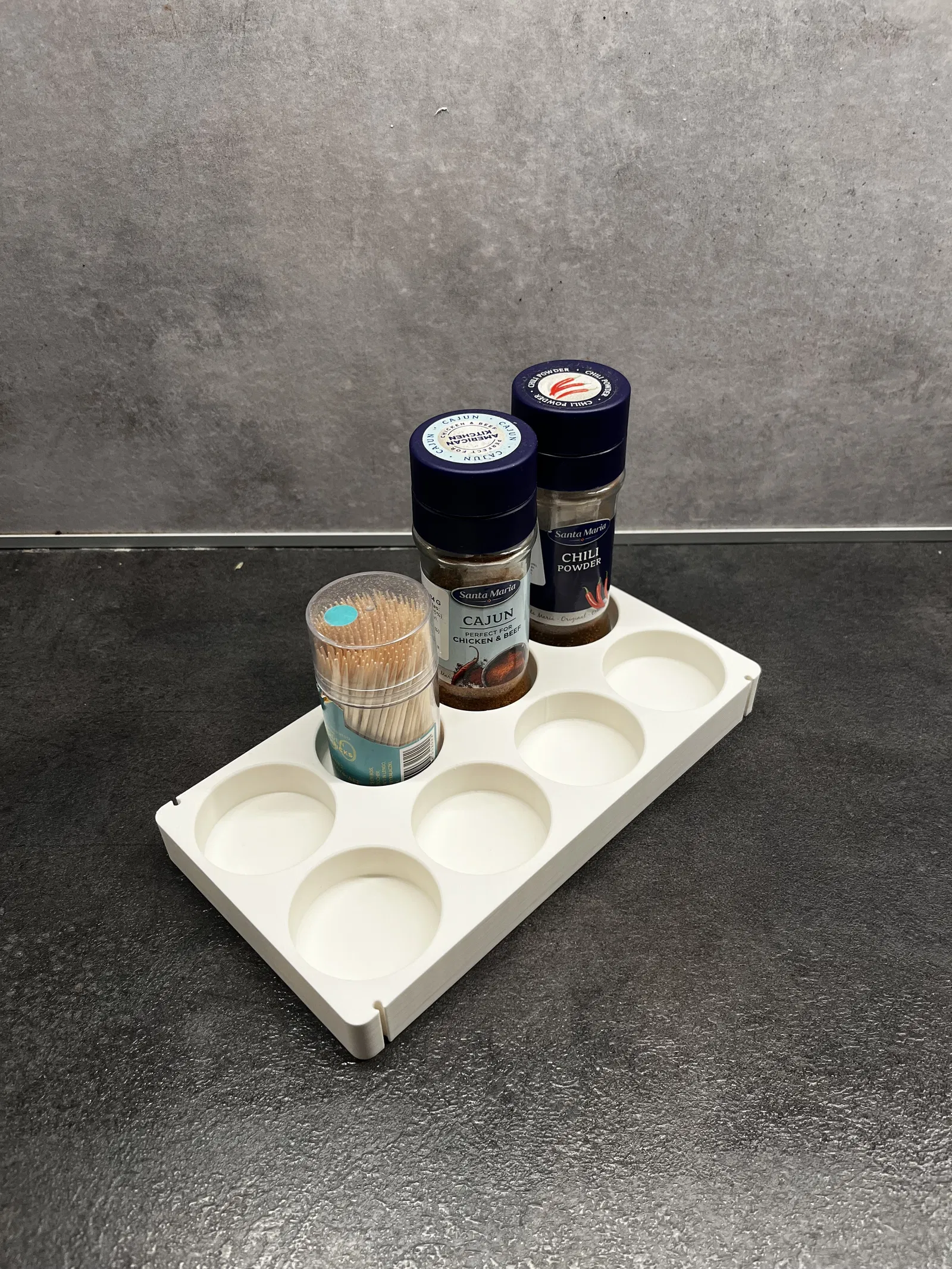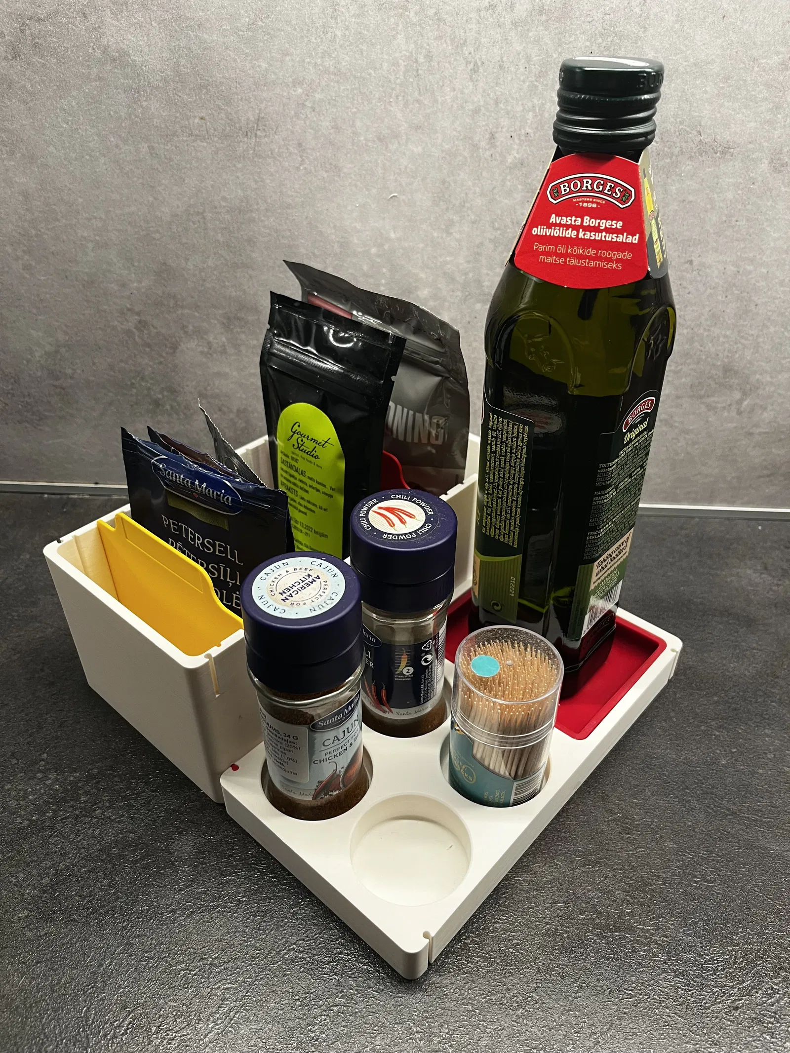 Bộ tổ chức gia vị dạng module, hiện có ba module - một hộp có vách ngăn có thể tùy chỉnh (rộng khoảng 100mm), một khay hỗn hợp cho chai gia vị và chai dầu (có khay silicon tùy chọn), và một khay cho chai gia vị (đường kính tối đa 45mm).