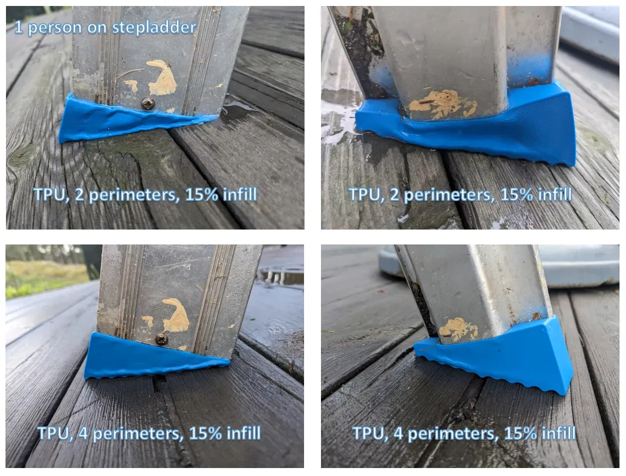 Tôi khuyên bạn nên in với cài đặt viền đủ cao để mô hình trở nên chắc chắn. Hoặc bạn có thể đặt tỷ lệ lấp đầy là 100%. Ban đầu tôi đã in chúng với 2 và 4 viền và chúng đã bị sụp dưới trọng lượng của tôi. Chúng cũng không ổn định nếu bạn lắc thang từ bên này sang bên kia.