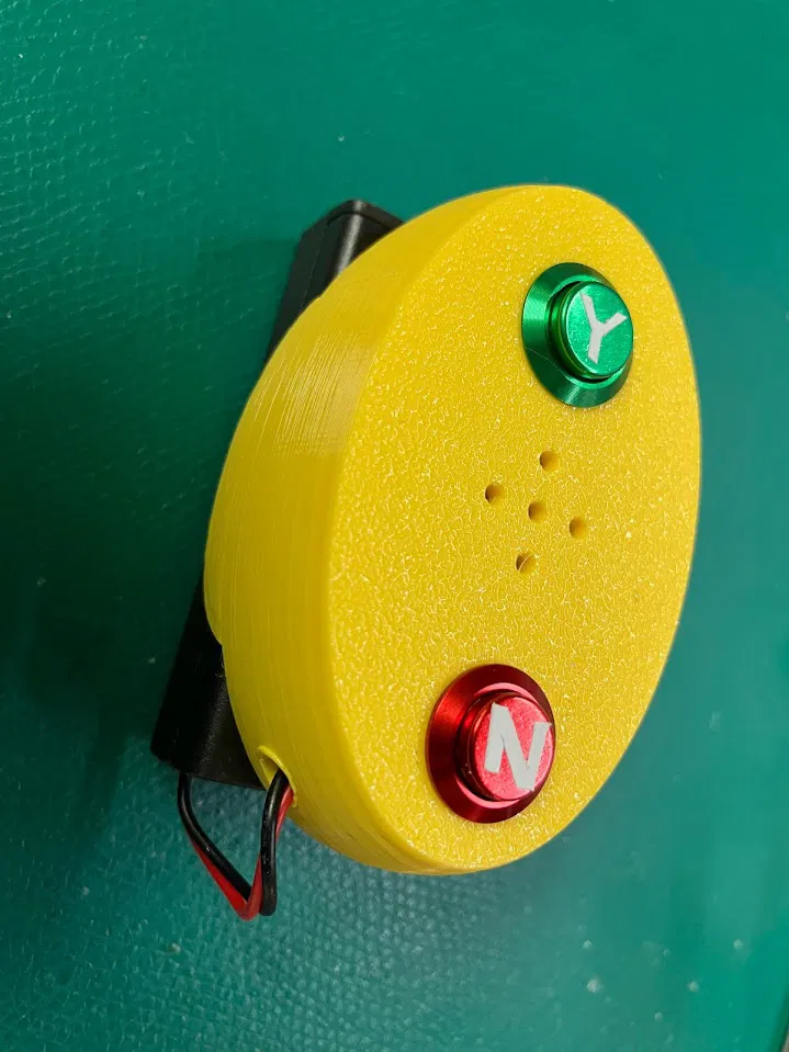 Làm xong trong một ngày, đây là nút Yes No. Máy chạy bằng 3 pin AAA và module DFPlayer, nên bạn có thể tải bất kỳ file mp3 nào.