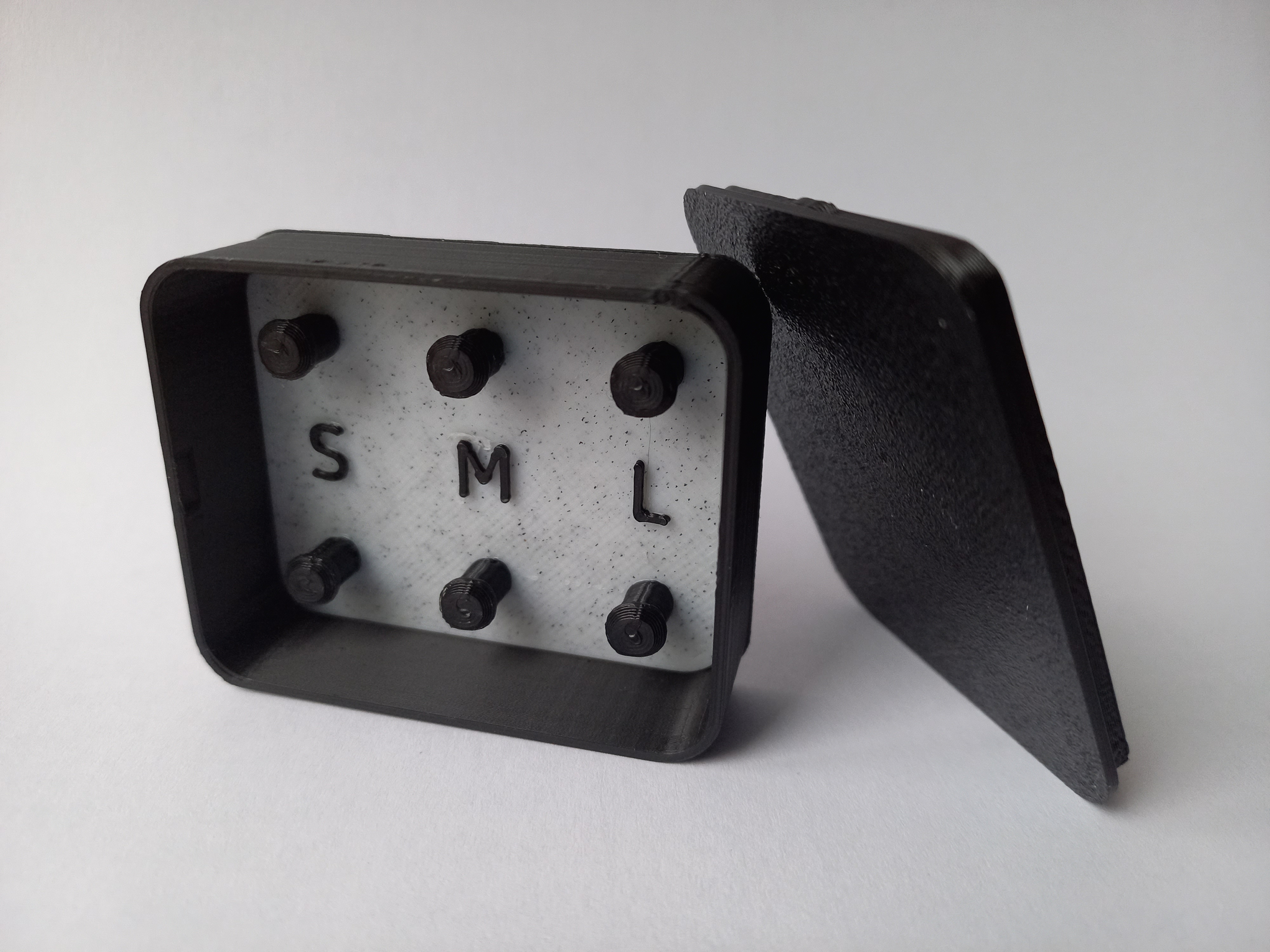 Một hộp nhỏ để sắp xếp các nút tai silicone cho tai nghe in-ear của bạn. Hộp này tương thích với hầu hết mọi thương hiệu. Bên trong có chỗ cho 3 cặp nút tai, với các ký hiệu "S", "M" và "L" được đánh dấu để dễ dàng nhận biết từng cặp và kích cỡ.