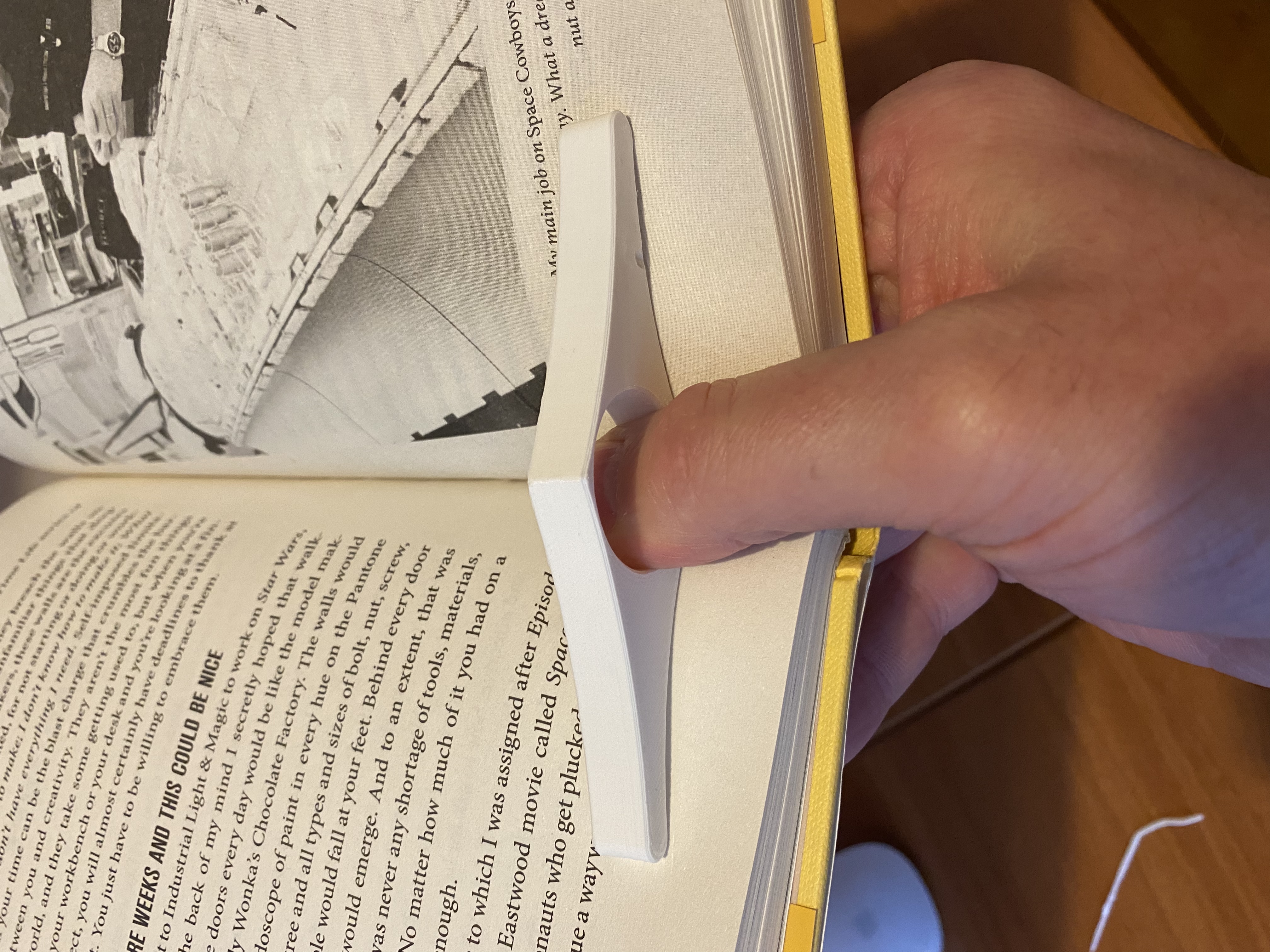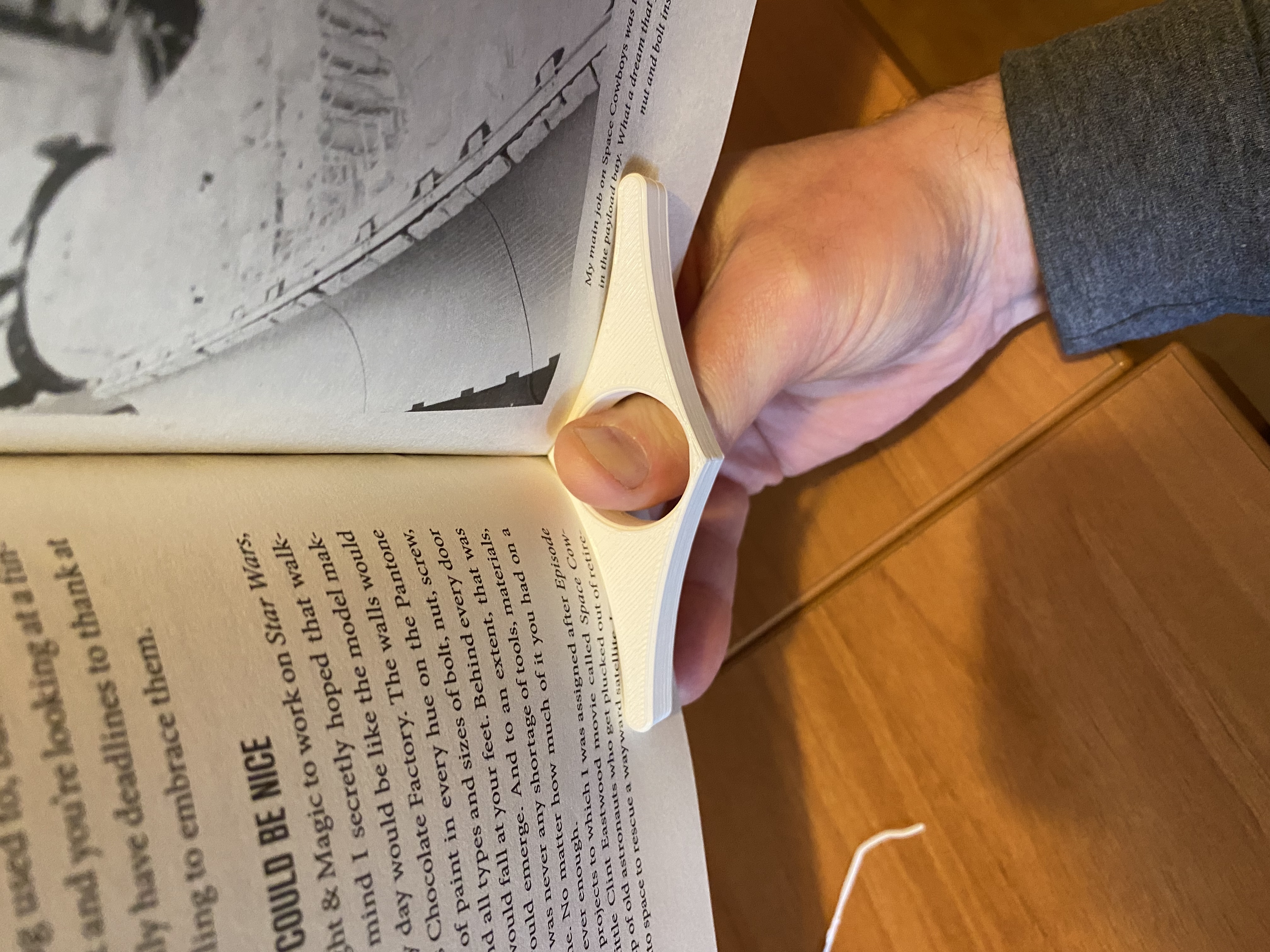 Dụng cụ giữ trang sách hình nhẫn đeo ngón cái giúp bạn mở sách dễ dàng. Phiên bản 1: lỗ xỏ 26mm. Phiên bản 2 (U-shaped) đang chờ thử nghiệm. In khoảng 44 phút - 1 tiếng 6 phút với PLA.