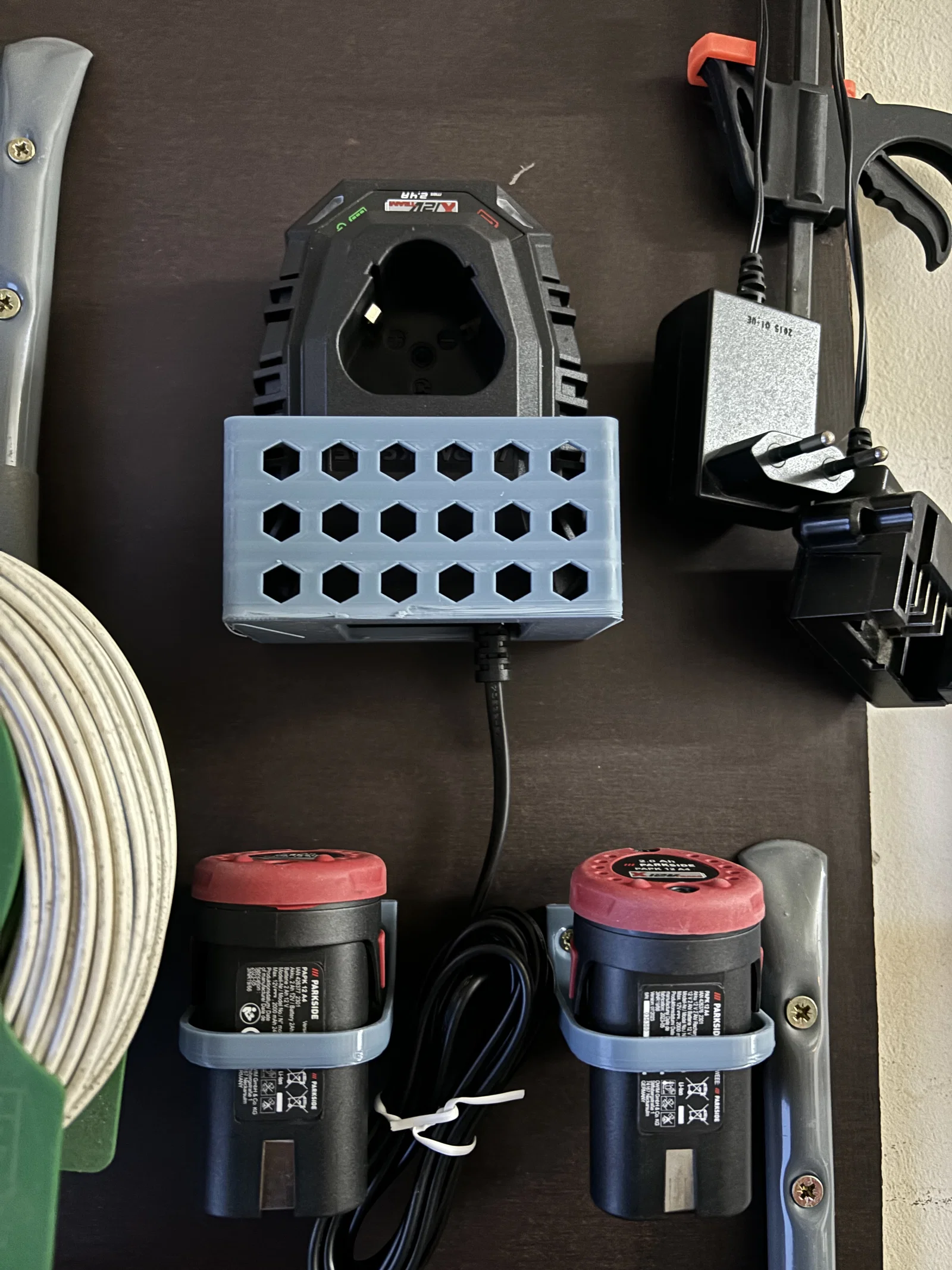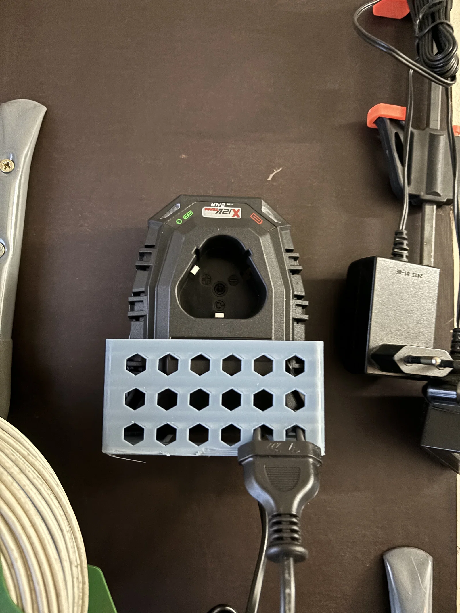 Giá treo sạc tường gọn nhẹ cho bộ dụng cụ Parkside XT12. Sản phẩm này giúp bạn treo cục sạc Parkside XT12 lên tường một cách dễ dàng, được in bằng PETG không cần hỗ trợ và có lỗ luồn dây tiện lợi, cho phép sử dụng ngay cả khi đang sạc.
